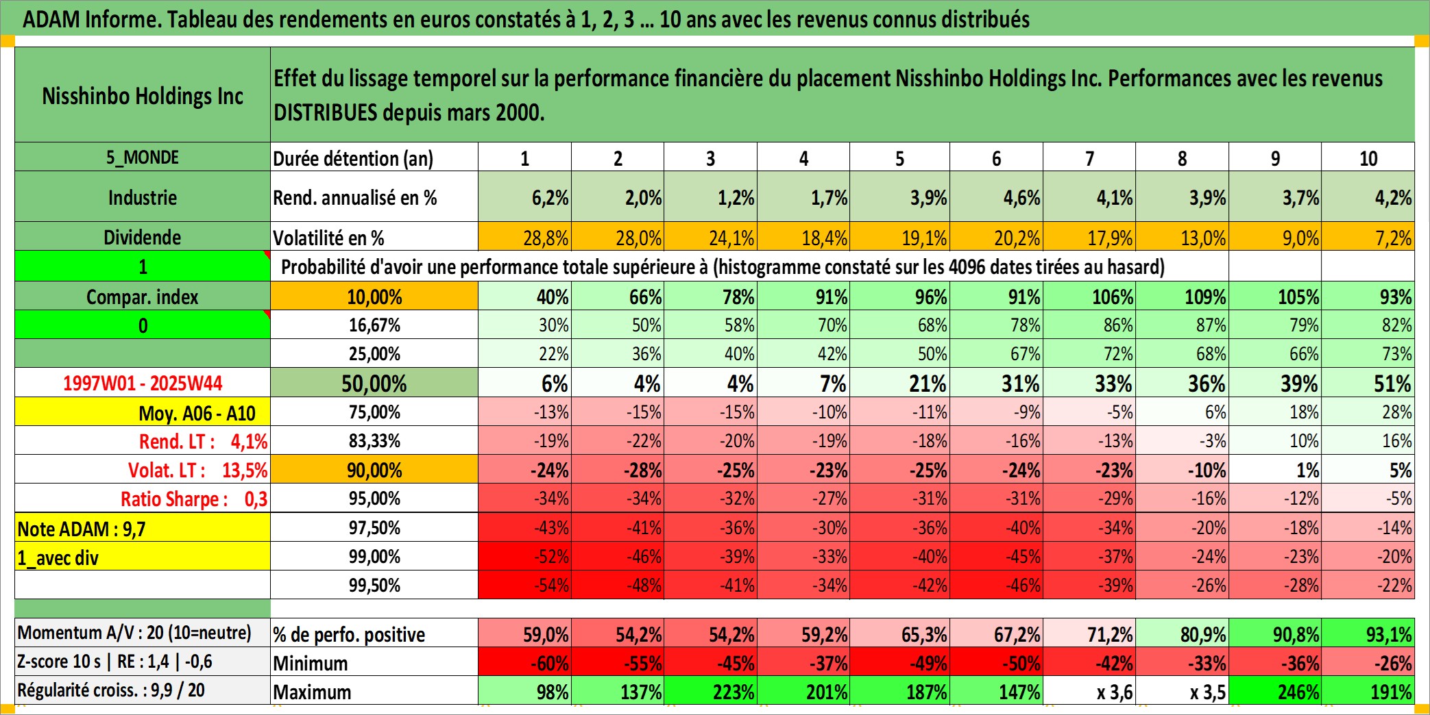 Site dédié aux investisseursPage dédiée sur site financeAnalyse des valorisations hebdomadaires de l'action Nisshinbo Holdings Inc. Cet actif est cote en JPY. Les valorisations sont en contrevaleur EURO et couvrent les semaines 1997W01 a 2025W44. Les revenus de cet actif financier sont pris en compte depuis la semaine 2000W13. La note ESG de cet actif n'est pas connue.
