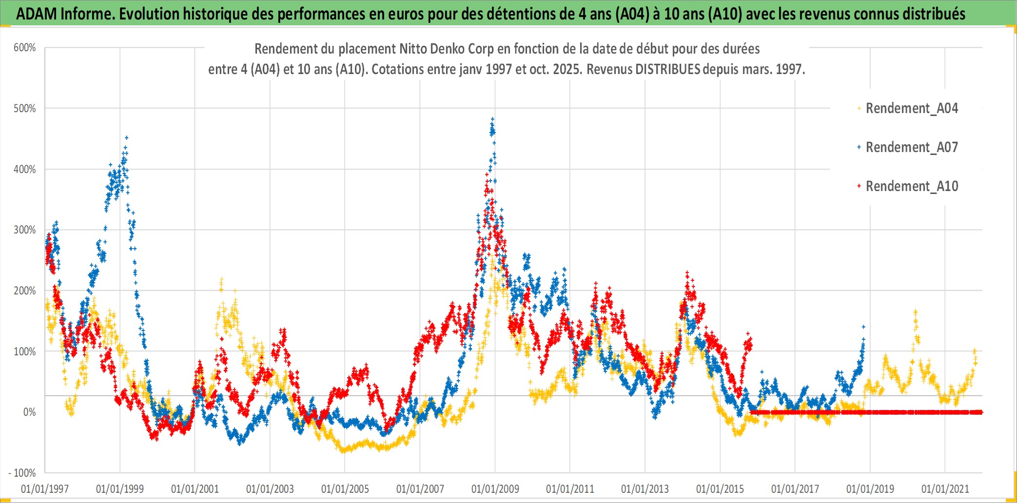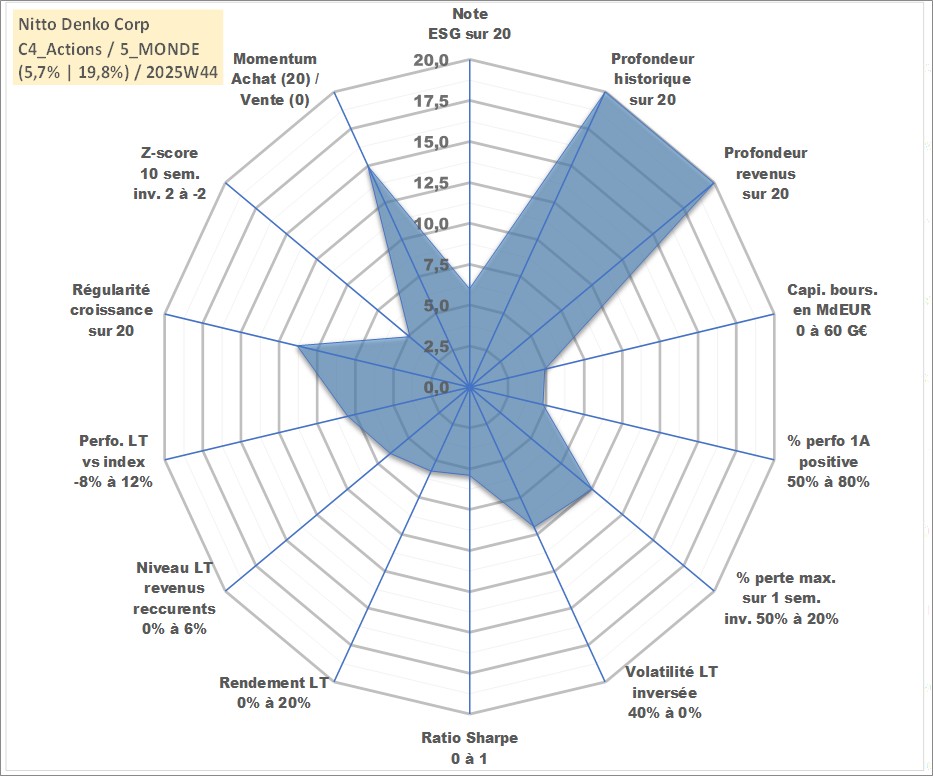 Site dédié aux investisseursPage dédiée sur site financeAnalyse des valorisations hebdomadaires de l'action Nitto Denko Corp. Cet actif est cote en JPY. Les valorisations sont en contrevaleur EURO et couvrent les semaines 1997W01 a 2025W44. Les revenus de cet actif financier sont pris en compte depuis la semaine 1997W13. La note globale ESG de cet actif est estimee a 6.0 (apres rebasage entre 0 et 20).