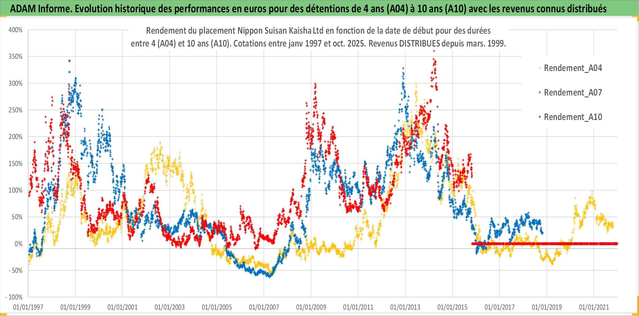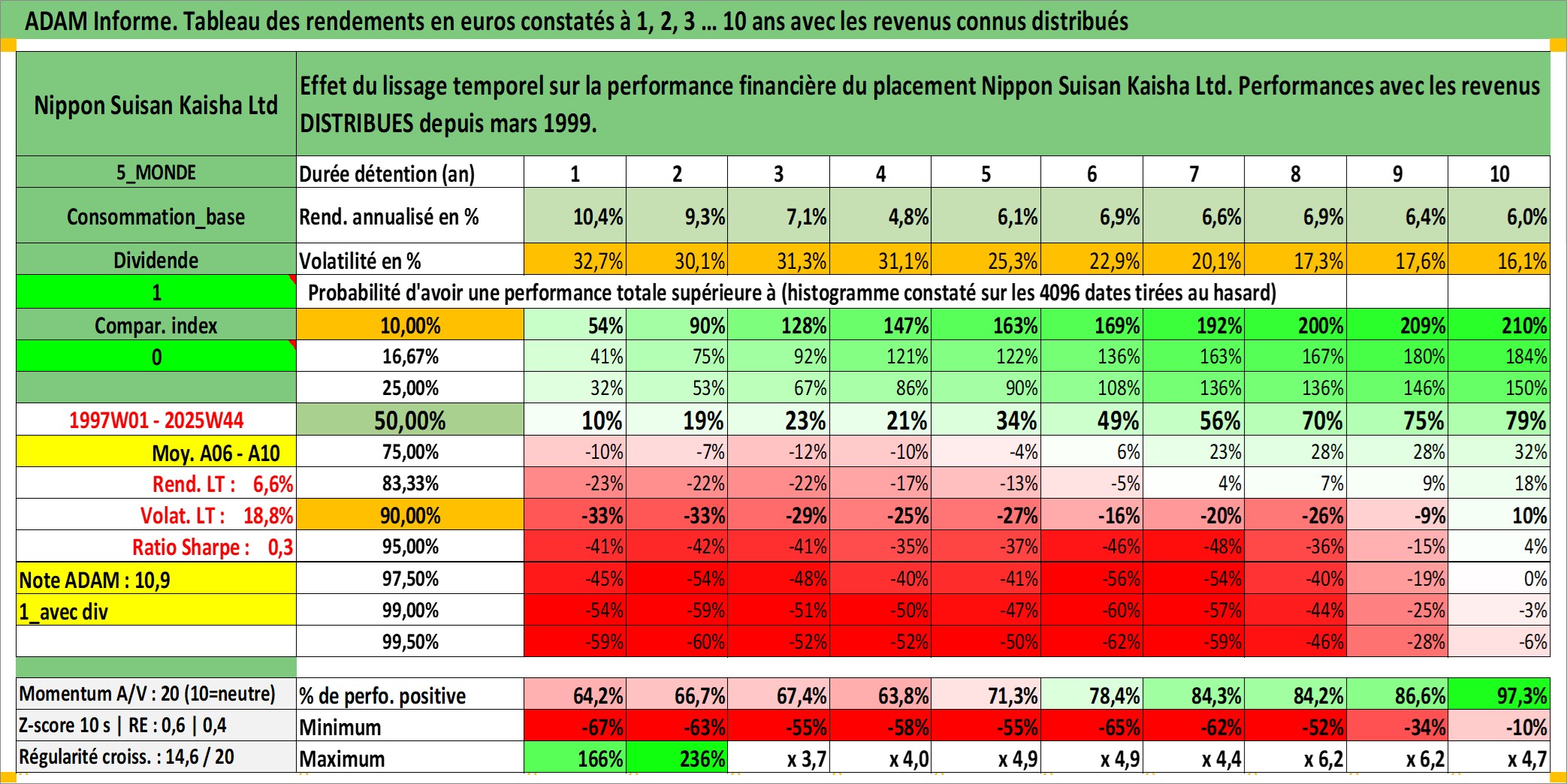 Site dédié aux investisseursPage dédiée sur site financeAnalyse des valorisations hebdomadaires de l'action Nippon Suisan Kaisha Ltd. Cet actif est cote en JPY. Les valorisations sont en contrevaleur EURO et couvrent les semaines 1997W01 a 2025W44. Les revenus de cet actif financier sont pris en compte depuis la semaine 1999W12. La note ESG de cet actif n'est pas connue.