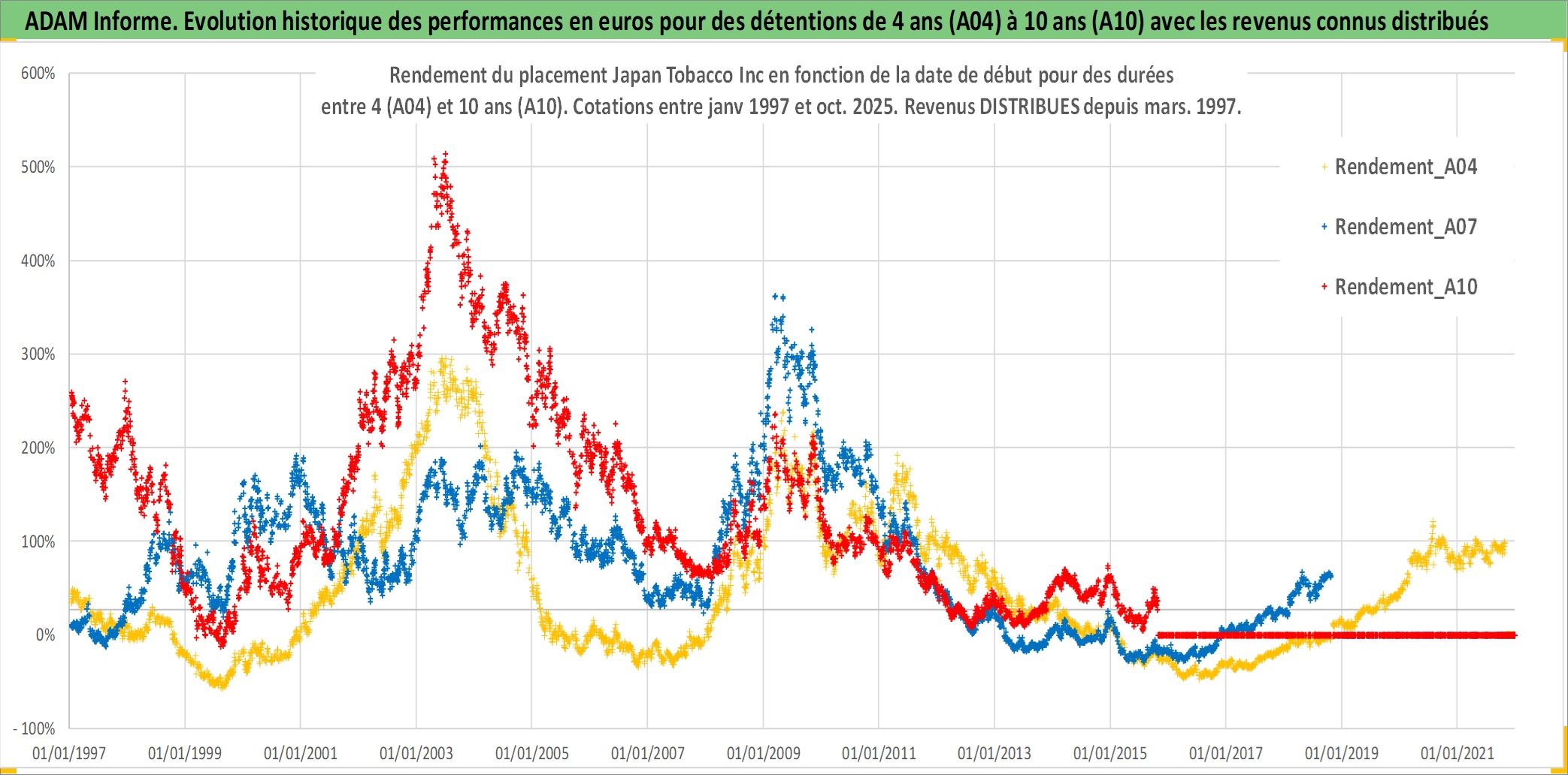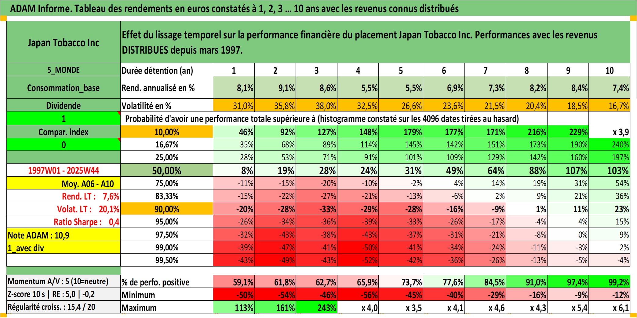 Site dédié aux investisseursPage dédiée sur site financeAnalyse des valorisations hebdomadaires de l'action Japan Tobacco Inc. Cet actif est cote en JPY. Les valorisations sont en contrevaleur EURO et couvrent les semaines 1997W01 a 2025W44. Les revenus de cet actif financier sont pris en compte depuis la semaine 1997W13. La note globale ESG de cet actif est estimee a 7.0 (apres rebasage entre 0 et 20).