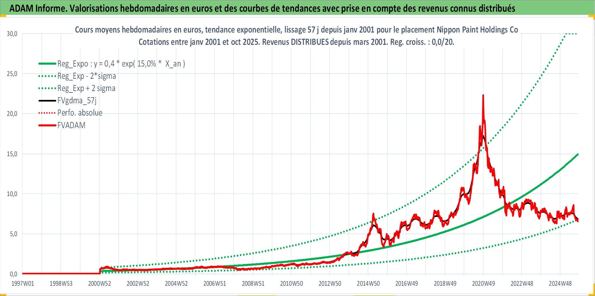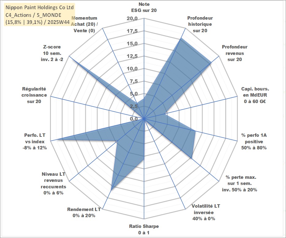 Site dédié aux investisseursPage dédiée sur site financeAnalyse des valorisations hebdomadaires de l'action Nippon Paint Holdings Co Ltd. Cet actif est cote en JPY. Les valorisations sont en contrevaleur EURO et couvrent les semaines 2001W02 a 2025W44. Les revenus de cet actif financier sont pris en compte depuis la semaine 2001W13. La note globale ESG de cet actif est estimee a 4.0 (apres rebasage entre 0 et 20).