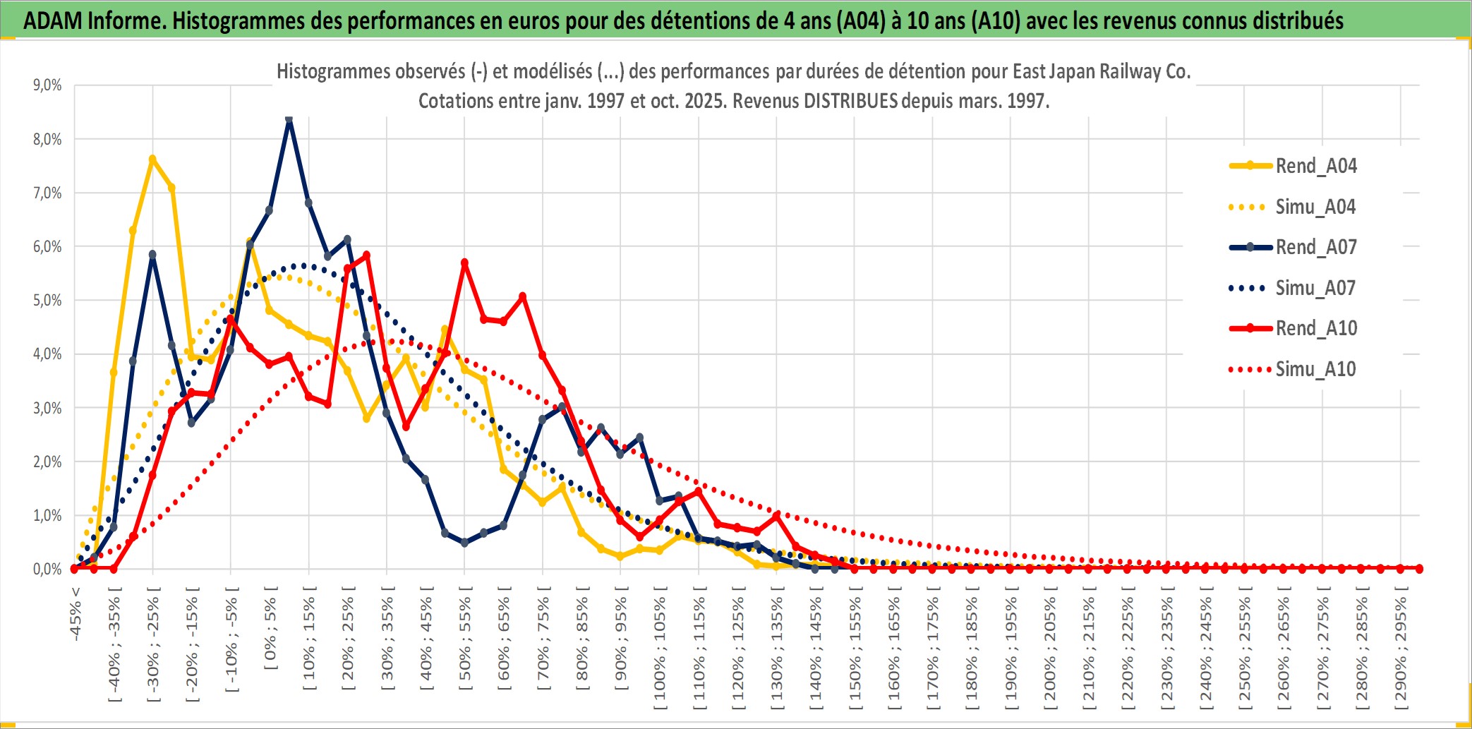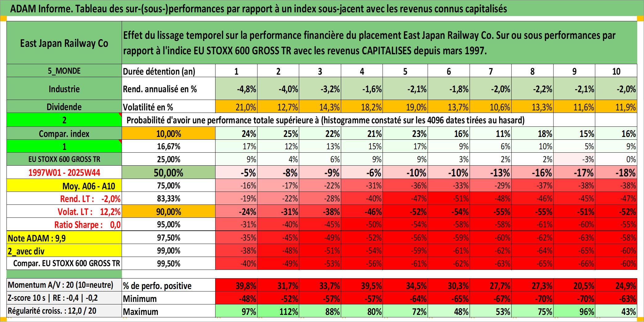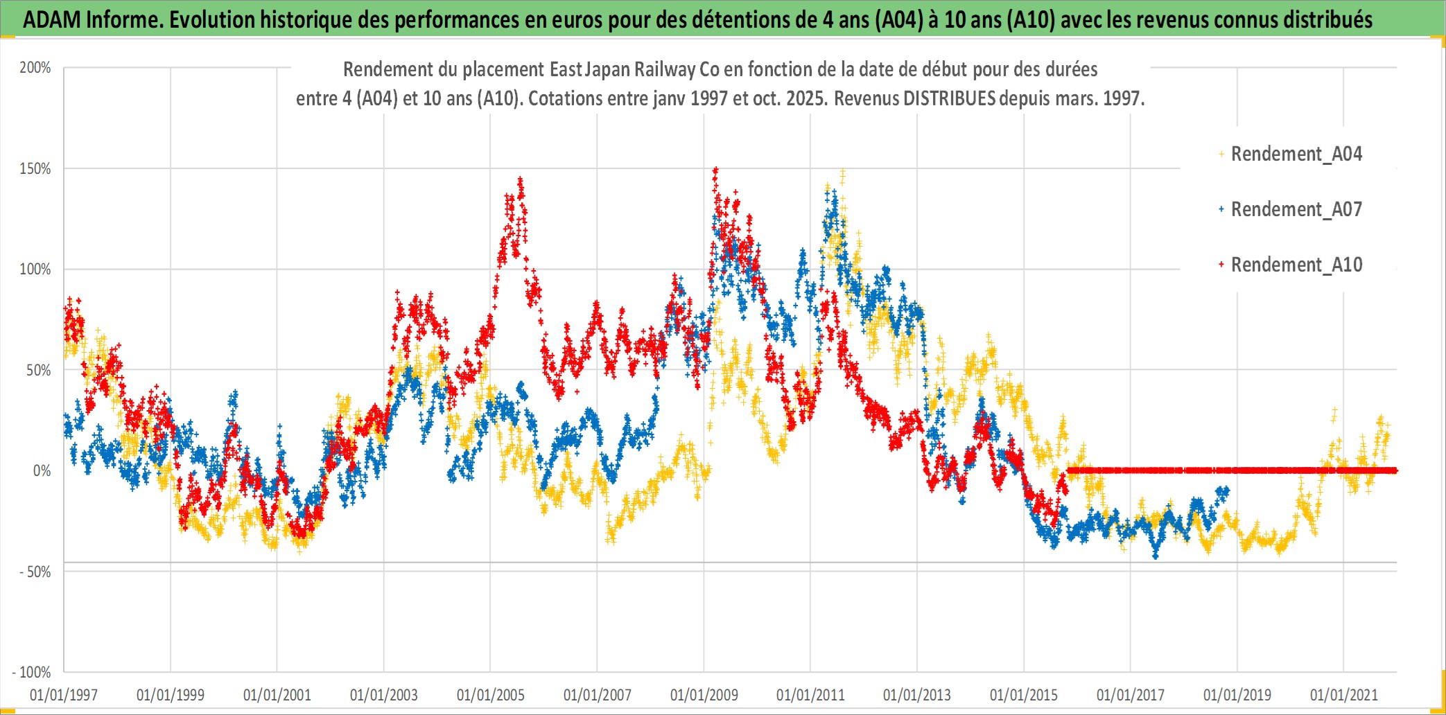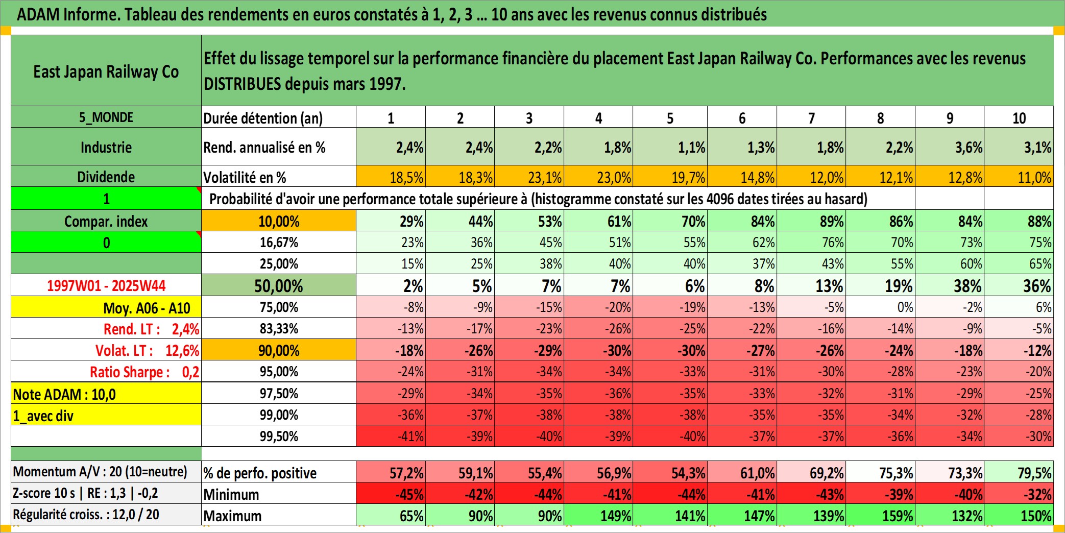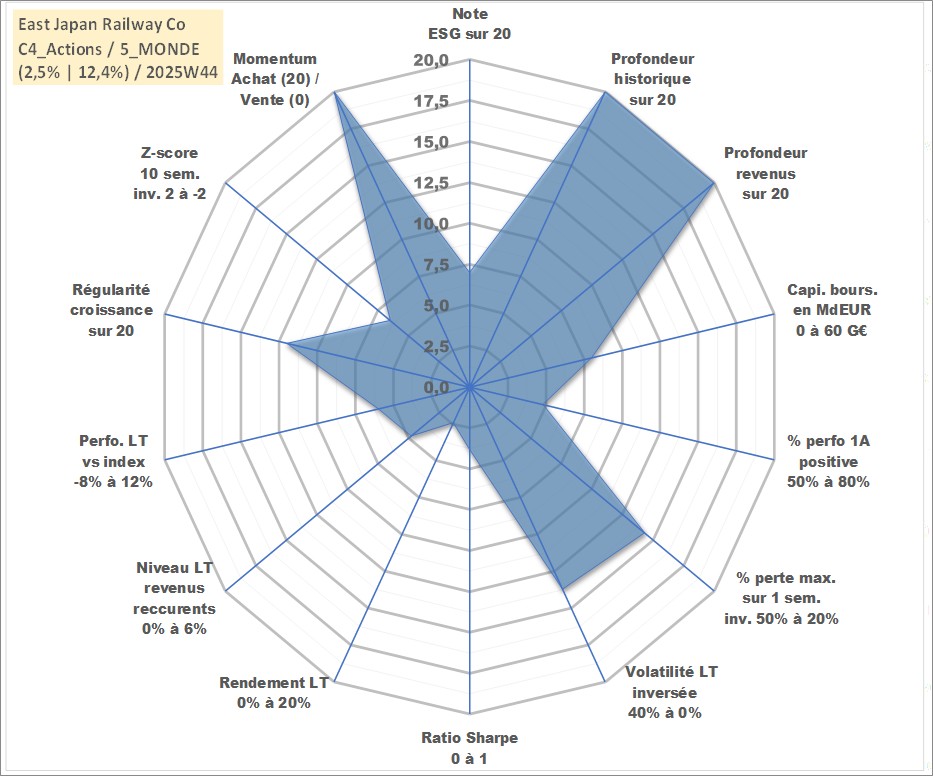 Site dédié aux investisseursPage dédiée sur site financeAnalyse des valorisations hebdomadaires de l'action East Japan Railway Co. Cet actif est cote en JPY. Les valorisations sont en contrevaleur EURO et couvrent les semaines 1997W01 a 2025W44. Les revenus de cet actif financier sont pris en compte depuis la semaine 1997W13. La note globale ESG de cet actif est estimee a 7.0 (apres rebasage entre 0 et 20).