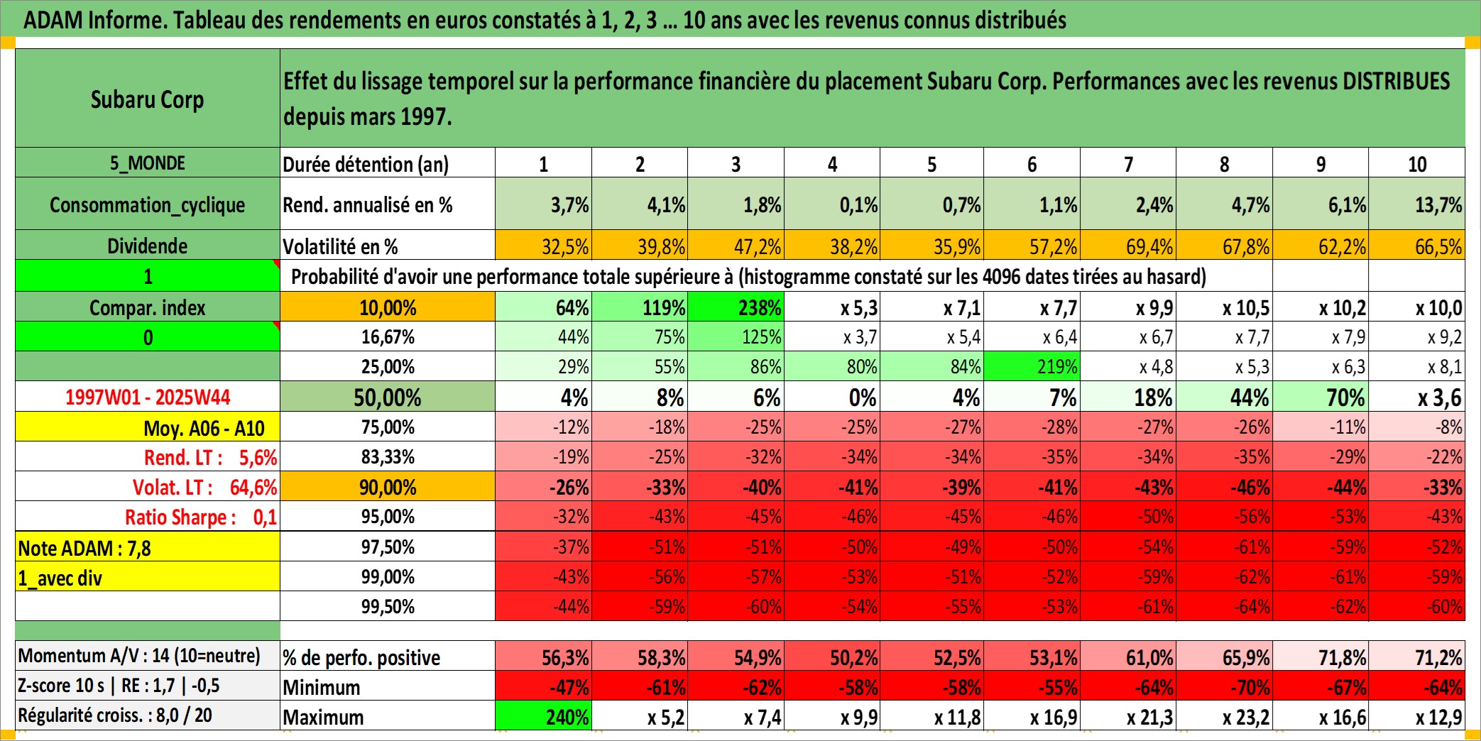 Site dédié aux investisseursPage dédiée sur site financeAnalyse des valorisations hebdomadaires de l'action Subaru Corp. Cet actif est cote en JPY. Les valorisations sont en contrevaleur EURO et couvrent les semaines 1997W01 a 2025W44. Les revenus de cet actif financier sont pris en compte depuis la semaine 1997W13. La note globale ESG de cet actif est estimee a 7.0 (apres rebasage entre 0 et 20).
