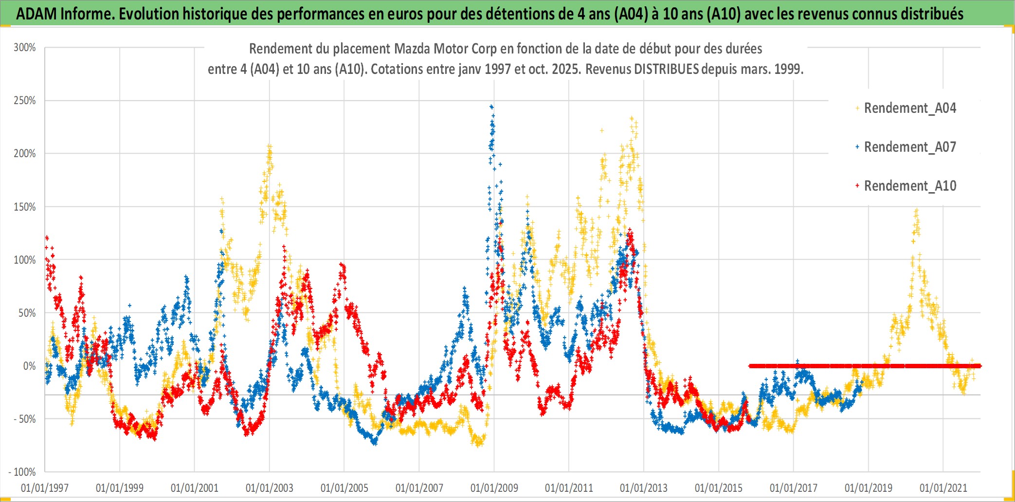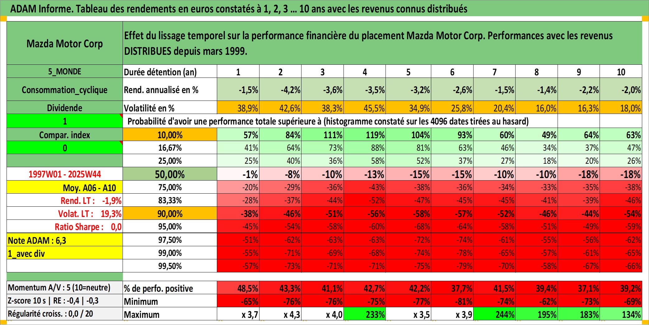 Site dédié aux investisseursPage dédiée sur site financeAnalyse des valorisations hebdomadaires de l'action Mazda Motor Corp. Cet actif est cote en JPY. Les valorisations sont en contrevaleur EURO et couvrent les semaines 1997W01 a 2025W44. Les revenus de cet actif financier sont pris en compte depuis la semaine 1999W12. La note globale ESG de cet actif est estimee a 6.0 (apres rebasage entre 0 et 20).