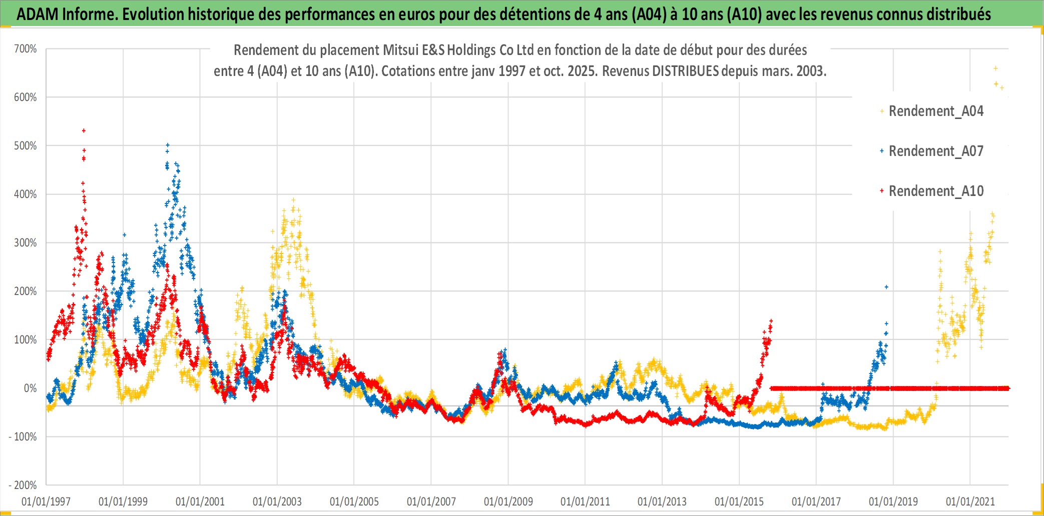 Site dédié aux investisseursPage dédiée sur site financeAnalyse des valorisations hebdomadaires de l'action Mitsui E&S Holdings Co Ltd. Cet actif est cote en JPY. Les valorisations sont en contrevaleur EURO et couvrent les semaines 1997W01 a 2025W44. Les revenus de cet actif financier sont pris en compte depuis la semaine 2003W13. La note ESG de cet actif n'est pas connue.