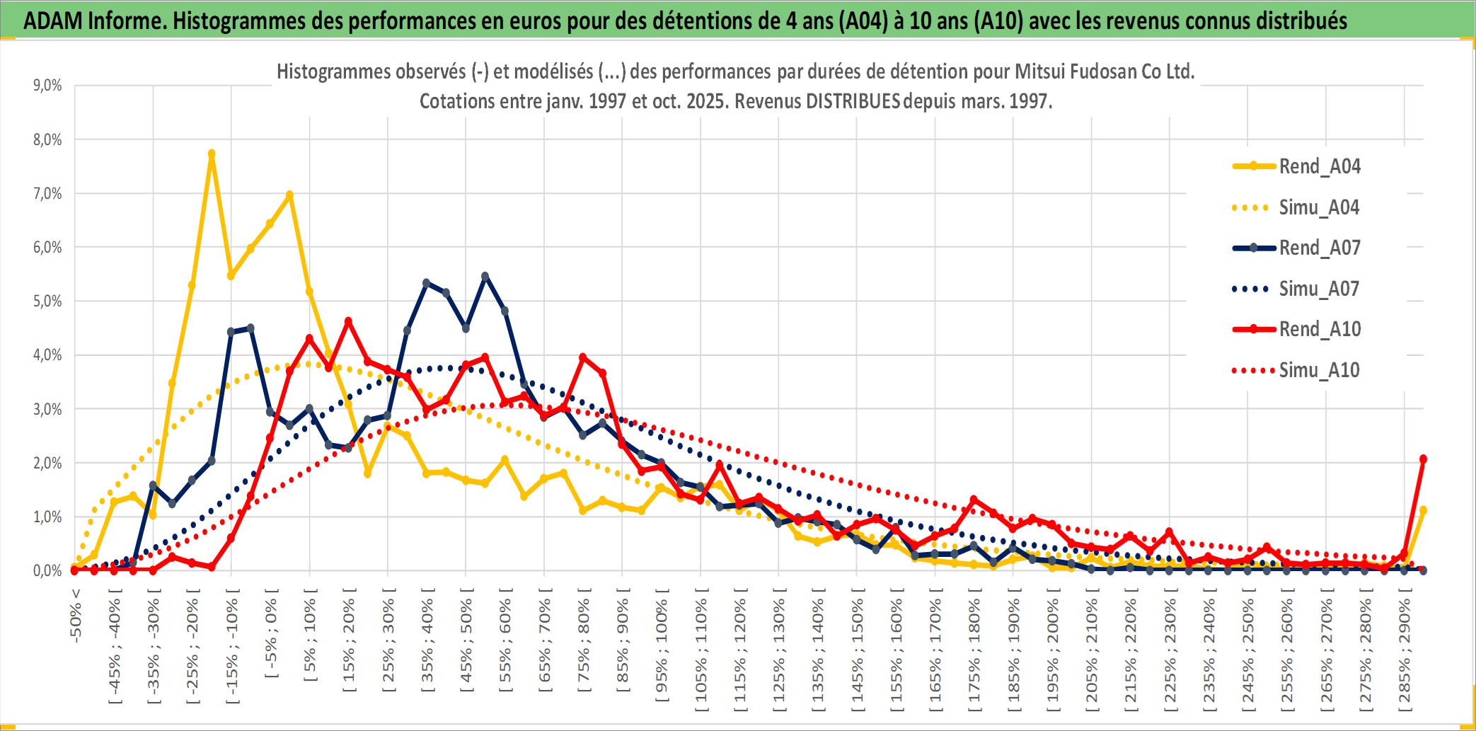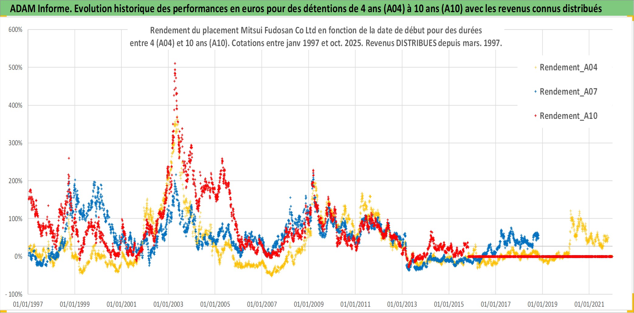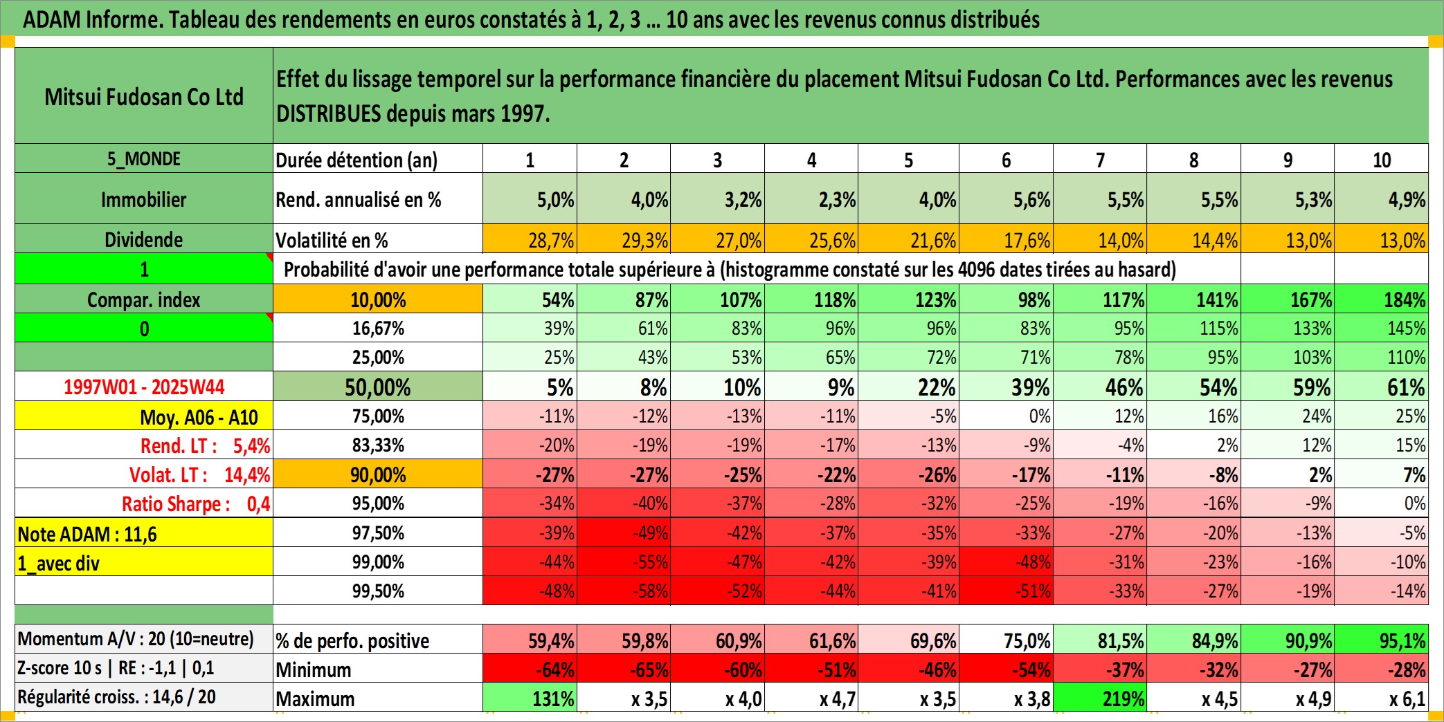 Site dédié aux investisseursPage dédiée sur site financeAnalyse des valorisations hebdomadaires de l'action Mitsui Fudosan Co Ltd. Cet actif est cote en JPY. Les valorisations sont en contrevaleur EURO et couvrent les semaines 1997W01 a 2025W44. Les revenus de cet actif financier sont pris en compte depuis la semaine 1997W13. La note globale ESG de cet actif est estimee a 9.0 (apres rebasage entre 0 et 20).