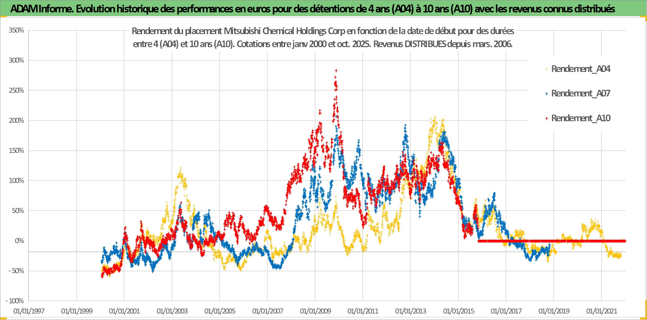 Site dédié aux investisseursPage dédiée sur site financeAnalyse des valorisations hebdomadaires de l'action Mitsubishi Chemical Holdings Corp. Cet actif est cote en JPY. Les valorisations sont en contrevaleur EURO et couvrent les semaines 2000W02 a 2025W44. Les revenus de cet actif financier sont pris en compte depuis la semaine 2006W13. La note globale ESG de cet actif est estimee a 3.0 (apres rebasage entre 0 et 20).