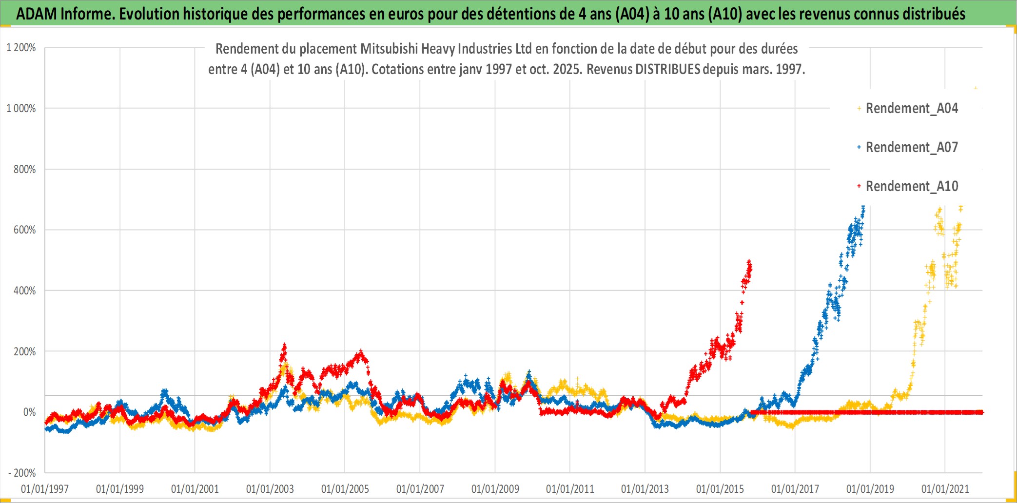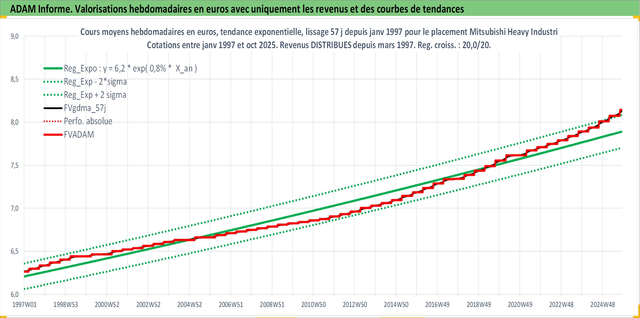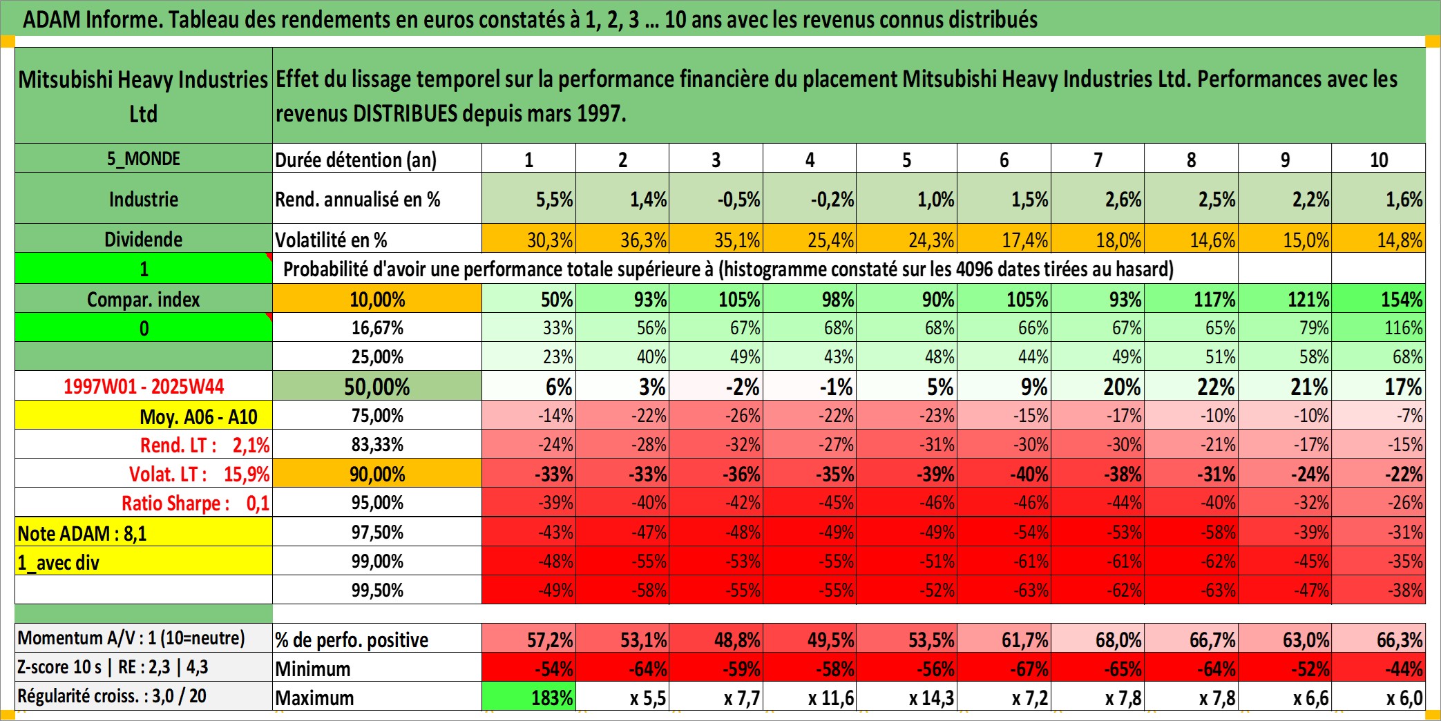 Site dédié aux investisseursPage dédiée sur site financeAnalyse des valorisations hebdomadaires de l'action Mitsubishi Heavy Industries Ltd. Cet actif est cote en JPY. Les valorisations sont en contrevaleur EURO et couvrent les semaines 1997W01 a 2025W44. Les revenus de cet actif financier sont pris en compte depuis la semaine 1997W13. La note globale ESG de cet actif est estimee a 5.0 (apres rebasage entre 0 et 20).