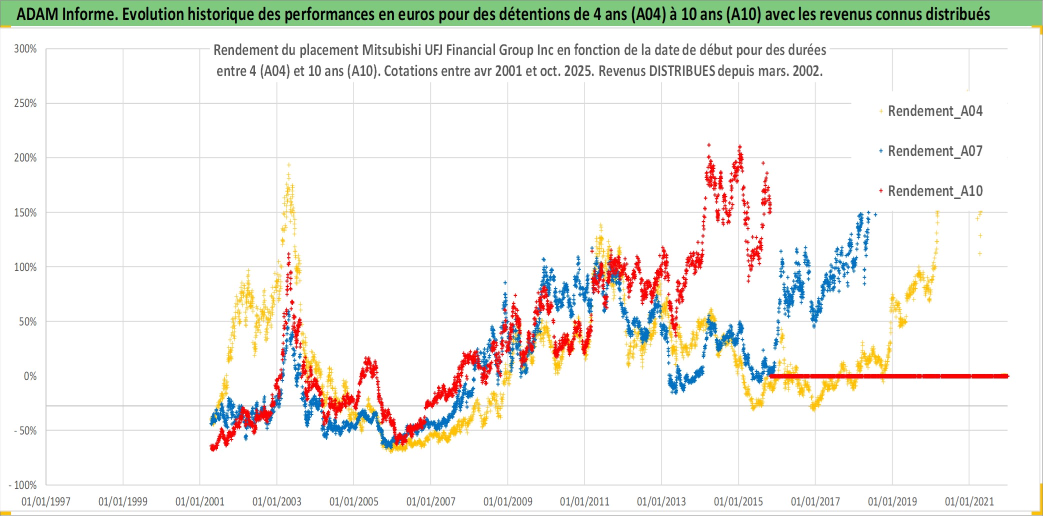 Site dédié aux investisseursPage dédiée sur site financeAnalyse des valorisations hebdomadaires de l'action Mitsubishi UFJ Financial Group Inc. Cet actif est cote en JPY. Les valorisations sont en contrevaleur EURO et couvrent les semaines 2001W14 a 2025W44. Les revenus de cet actif financier sont pris en compte depuis la semaine 2002W13. La note globale ESG de cet actif est estimee a 11.0 (apres rebasage entre 0 et 20).