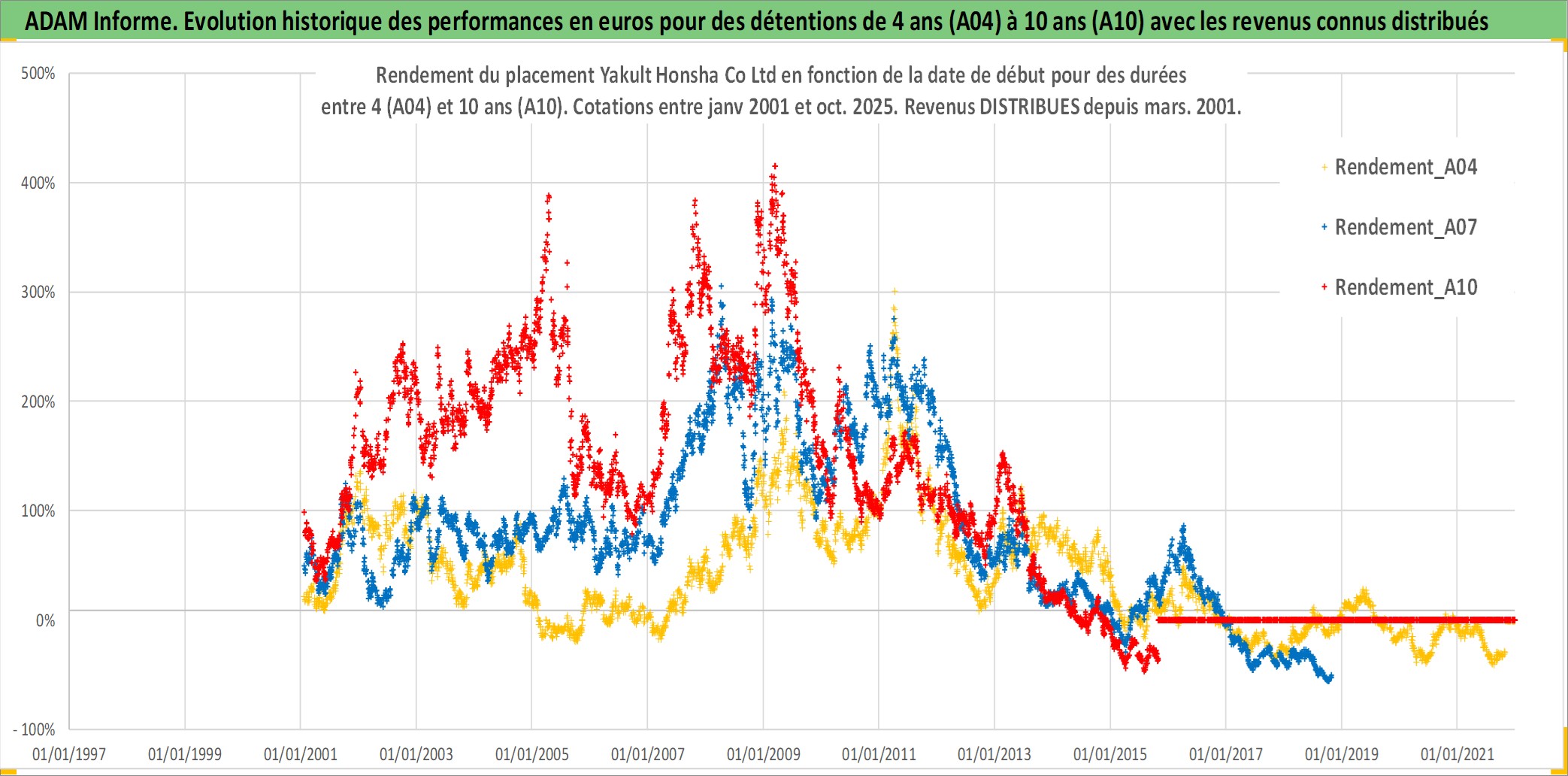 Site dédié aux investisseursPage dédiée sur site financeAnalyse des valorisations hebdomadaires de l'action Yakult Honsha Co Ltd. Cet actif est cote en JPY. Les valorisations sont en contrevaleur EURO et couvrent les semaines 2001W02 a 2025W44. Les revenus de cet actif financier sont pris en compte depuis la semaine 2001W13. La note globale ESG de cet actif est estimee a 5.0 (apres rebasage entre 0 et 20).