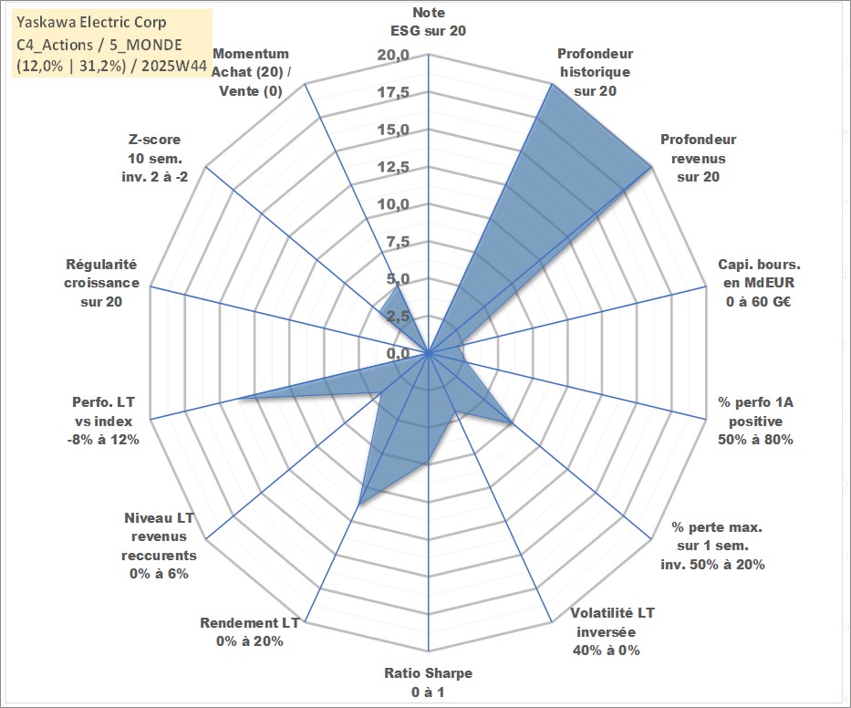 Site dédié aux investisseursPage dédiée sur site financeAnalyse des valorisations hebdomadaires de l'action Yaskawa Electric Corp. Cet actif est cote en JPY. Les valorisations sont en contrevaleur EURO et couvrent les semaines 1997W01 a 2025W44. Les revenus de cet actif financier sont pris en compte depuis la semaine 1997W11. La note ESG de cet actif n'est pas connue.