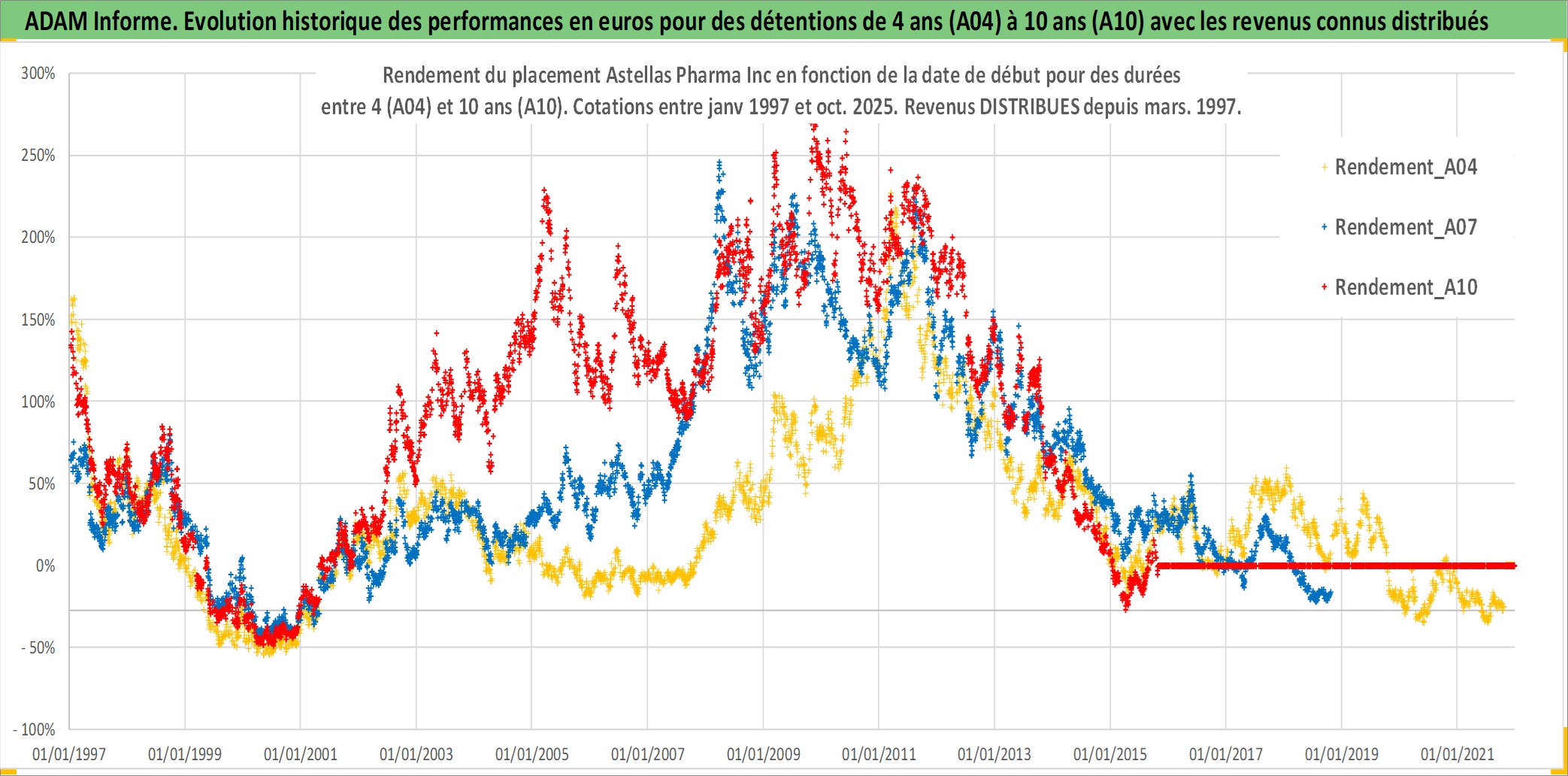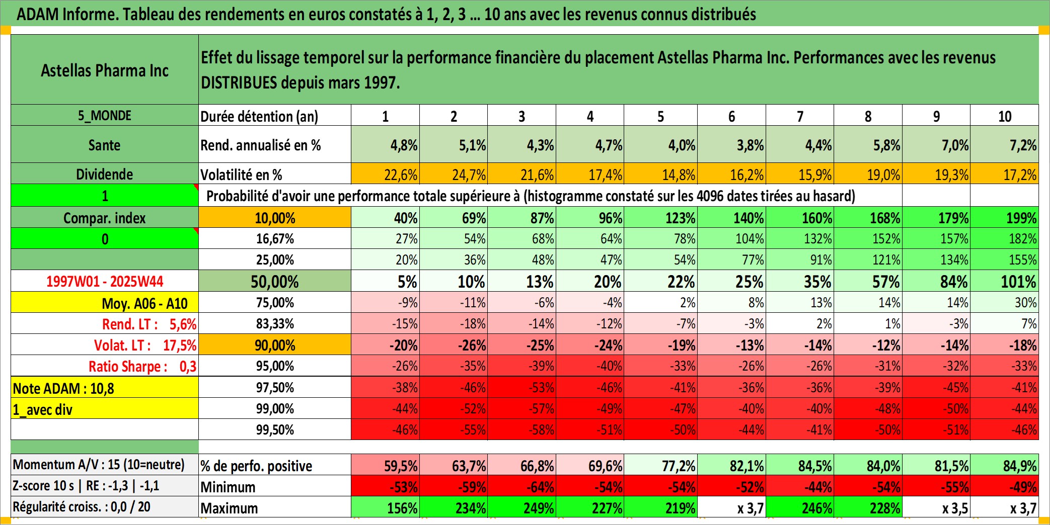 Site dédié aux investisseursPage dédiée sur site financeAnalyse des valorisations hebdomadaires de l'action Astellas Pharma Inc. Cet actif est cote en JPY. Les valorisations sont en contrevaleur EURO et couvrent les semaines 1997W01 a 2025W44. Les revenus de cet actif financier sont pris en compte depuis la semaine 1997W13. La note globale ESG de cet actif est estimee a 10.0 (apres rebasage entre 0 et 20).