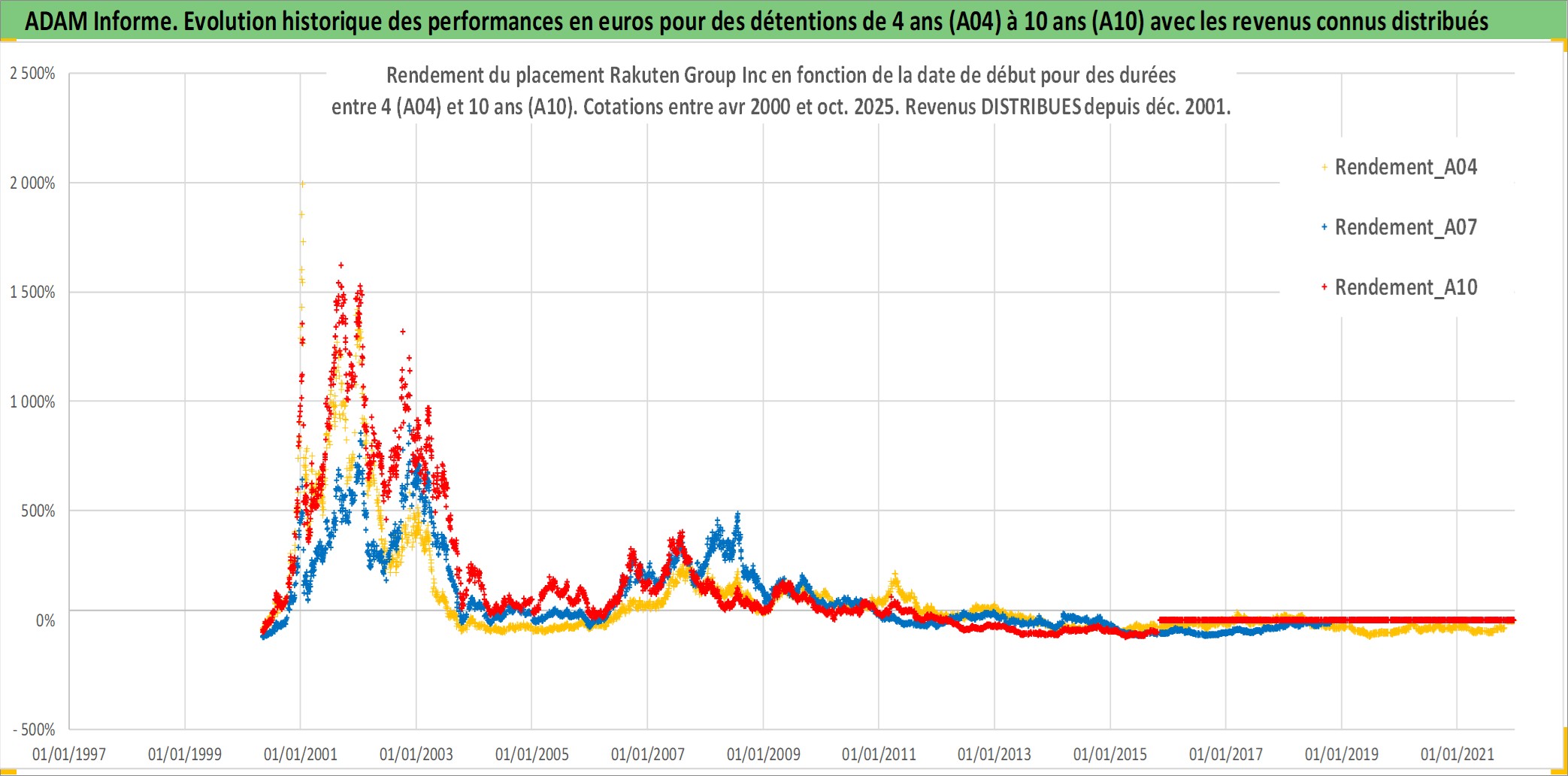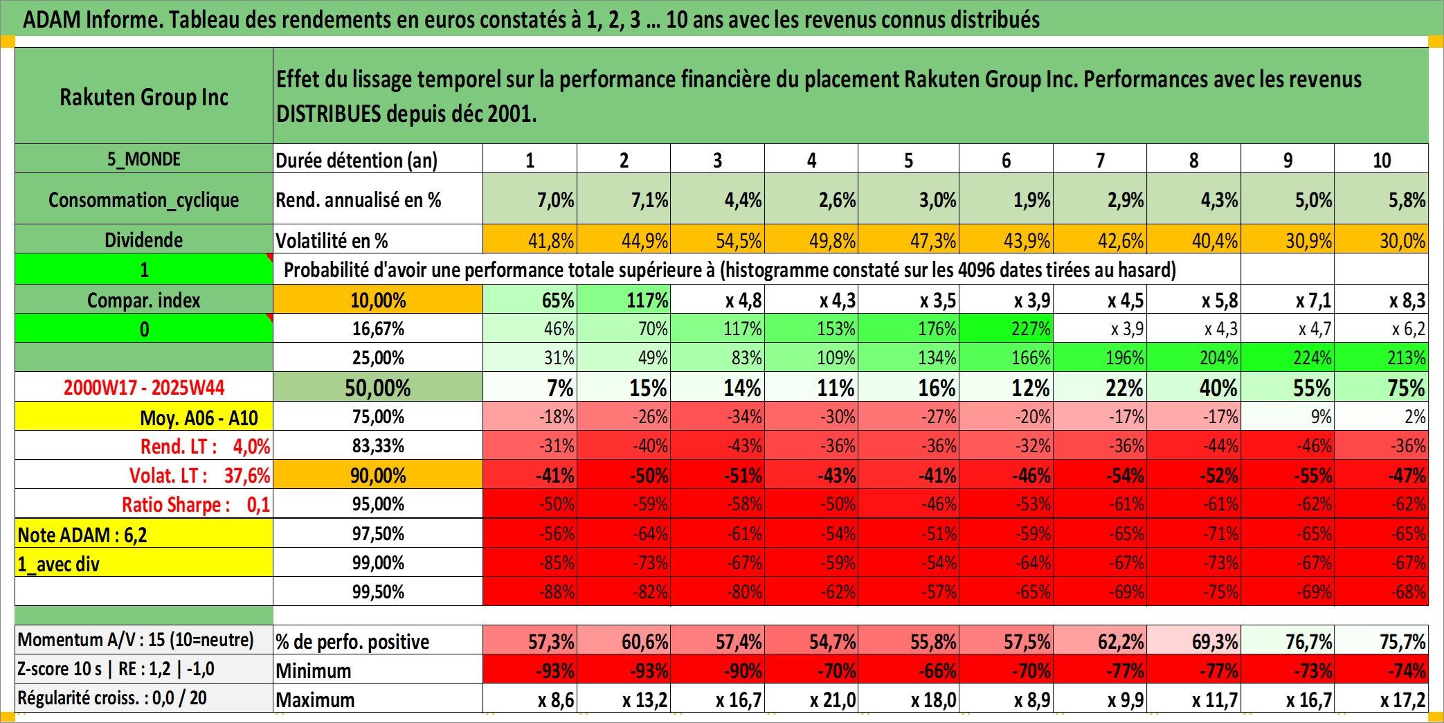 Site dédié aux investisseursPage dédiée sur site financeAnalyse des valorisations hebdomadaires de l'action Rakuten Group Inc. Cet actif est cote en JPY. Les valorisations sont en contrevaleur EURO et couvrent les semaines 2000W17 a 2025W44. Les revenus de cet actif financier sont pris en compte depuis la semaine 2001W52. La note globale ESG de cet actif est estimee a 9.0 (apres rebasage entre 0 et 20).