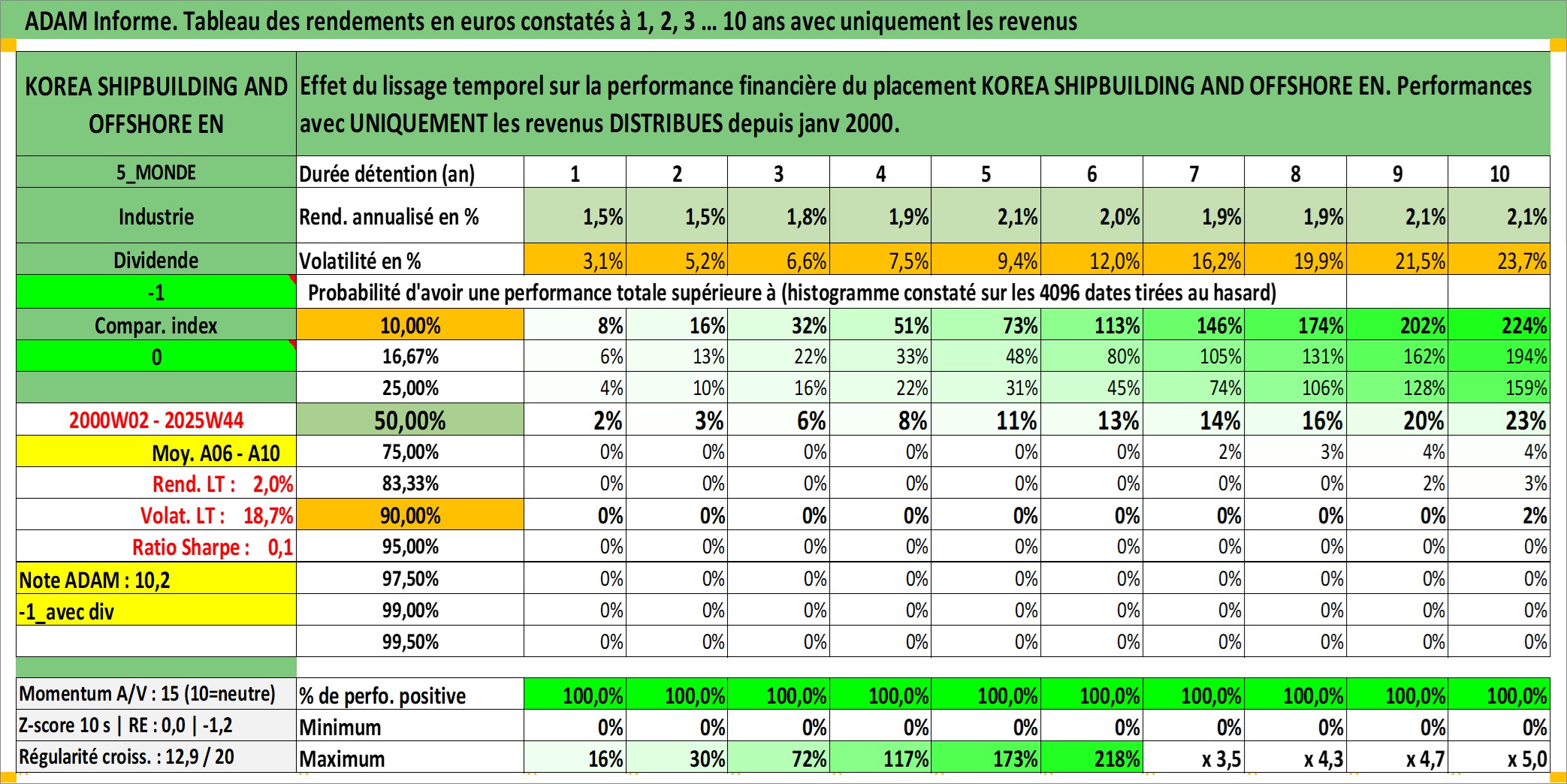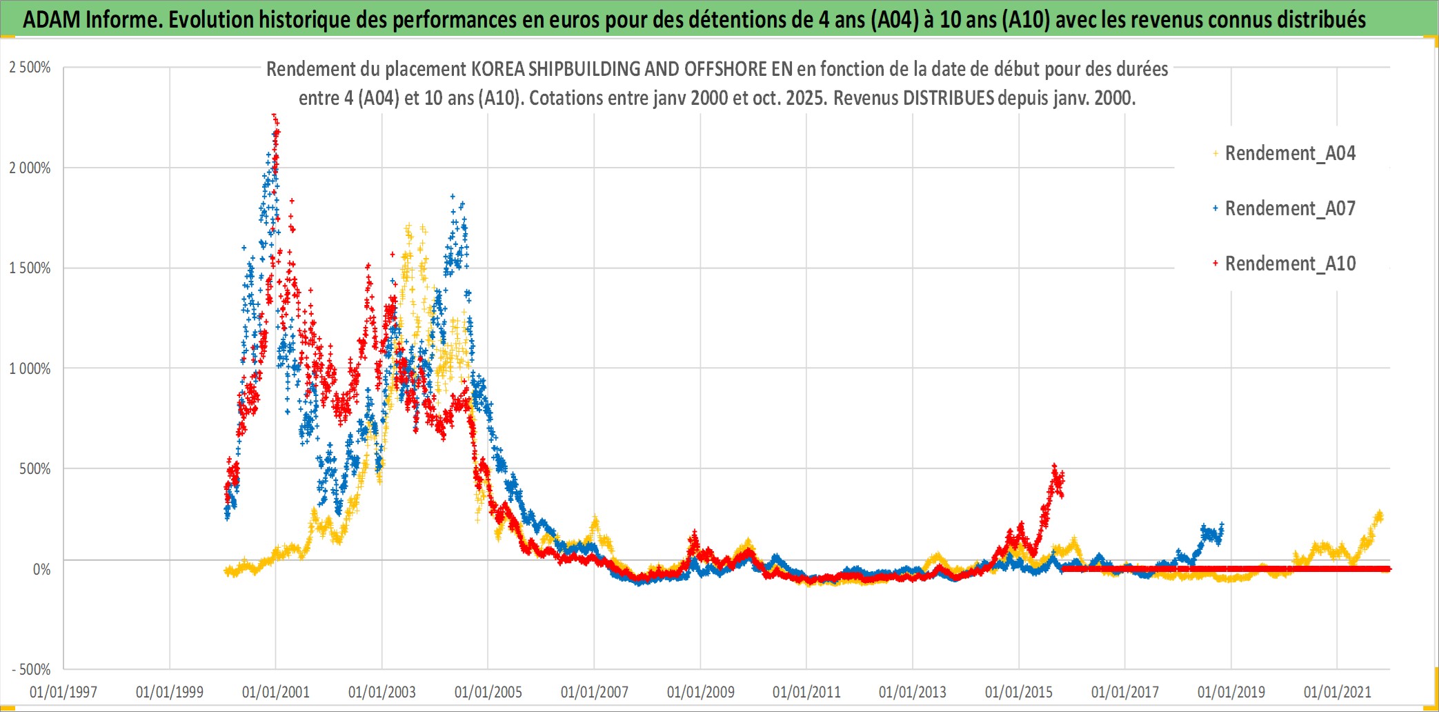 Site dédié aux investisseursPage dédiée sur site financeAnalyse des valorisations hebdomadaires de l'action KOREA SHIPBUILDING AND OFFSHORE EN. Cet actif est cote en KRW. Les valorisations sont en contrevaleur EURO et couvrent les semaines 2000W02 a 2025W44. Les revenus de cet actif financier sont pris en compte depuis la semaine 2000W01. La note globale ESG de cet actif est estimee a 6.0 (apres rebasage entre 0 et 20).