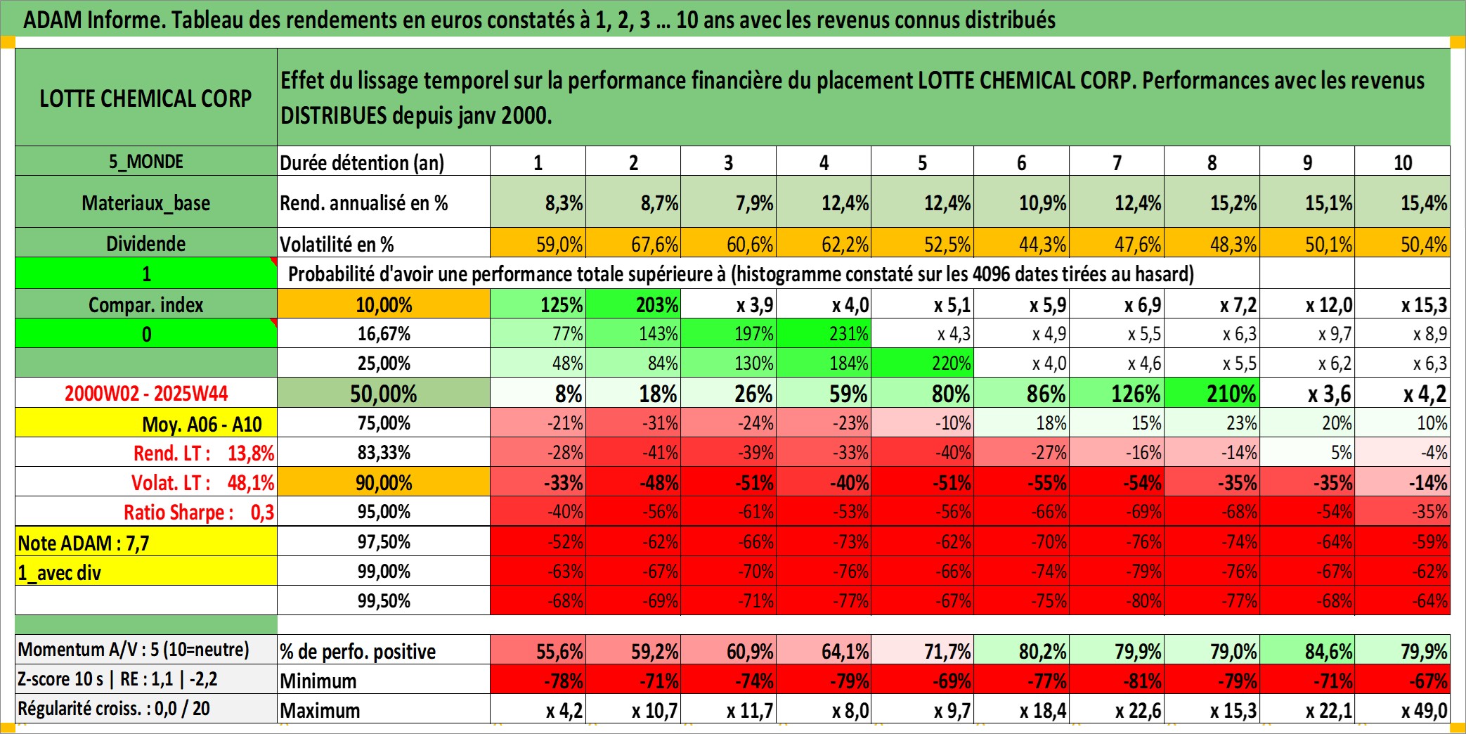 Site dédié aux investisseursPage dédiée sur site financeAnalyse des valorisations hebdomadaires de l'action LOTTE CHEMICAL CORP. Cet actif est cote en KRW. Les valorisations sont en contrevaleur EURO et couvrent les semaines 2000W02 a 2025W44. Les revenus de cet actif financier sont pris en compte depuis la semaine 2000W01. La note globale ESG de cet actif est estimee a 6.0 (apres rebasage entre 0 et 20).