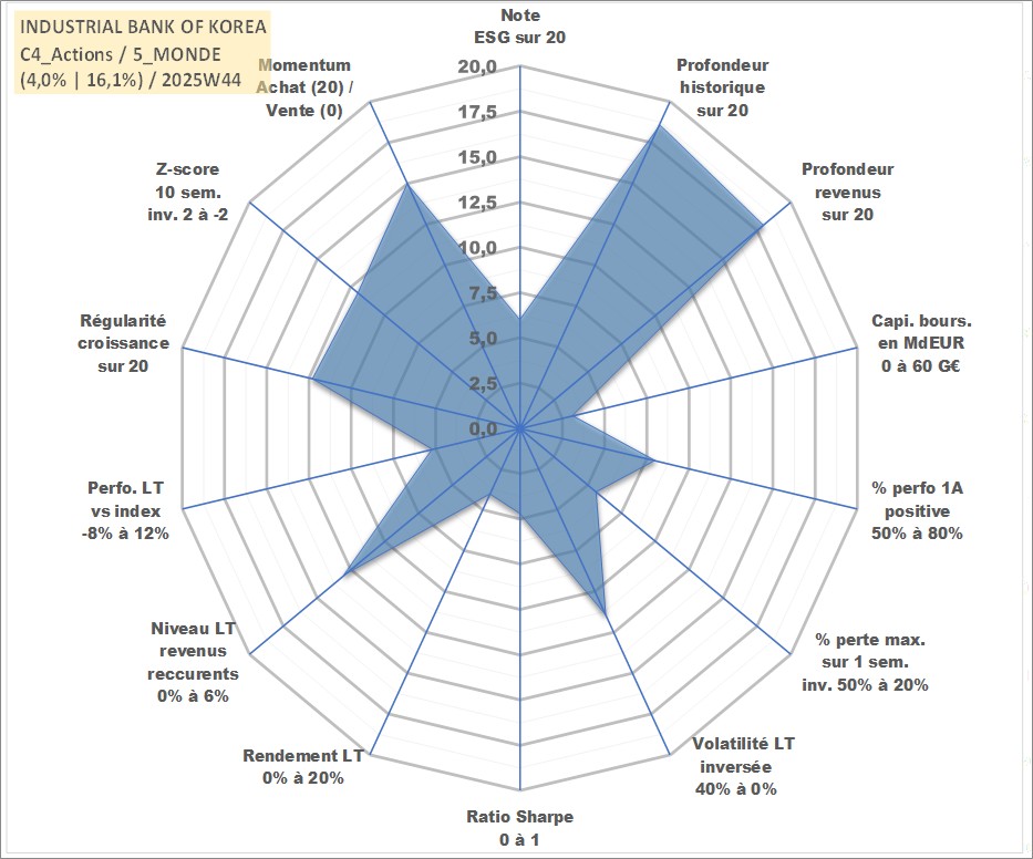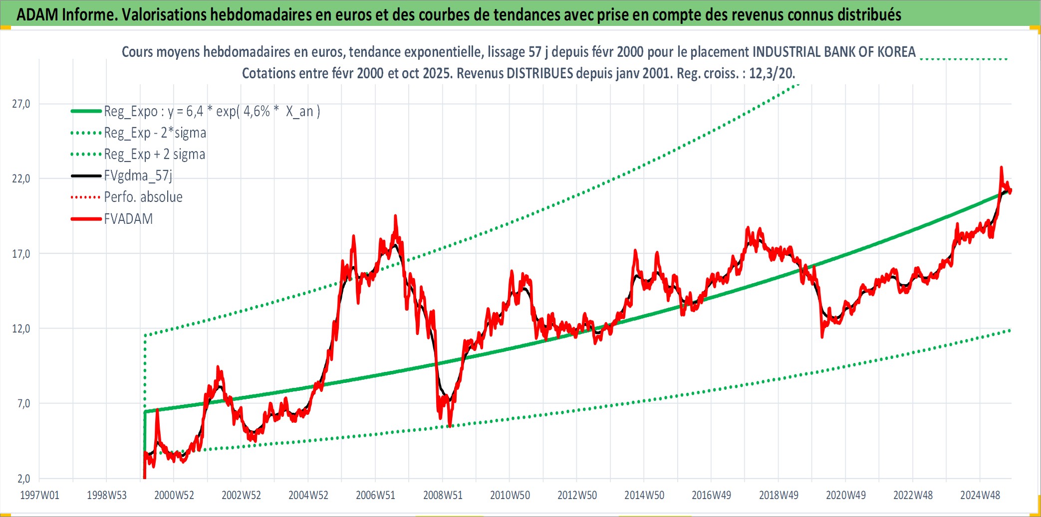 Site dédié aux investisseursPage dédiée sur site financeAnalyse des valorisations hebdomadaires de l'action INDUSTRIAL BANK OF KOREA. Cet actif est cote en KRW. Les valorisations sont en contrevaleur EURO et couvrent les semaines 2000W07 a 2025W44. Les revenus de cet actif financier sont pris en compte depuis la semaine 2001W01. La note globale ESG de cet actif est estimee a 6.0 (apres rebasage entre 0 et 20).