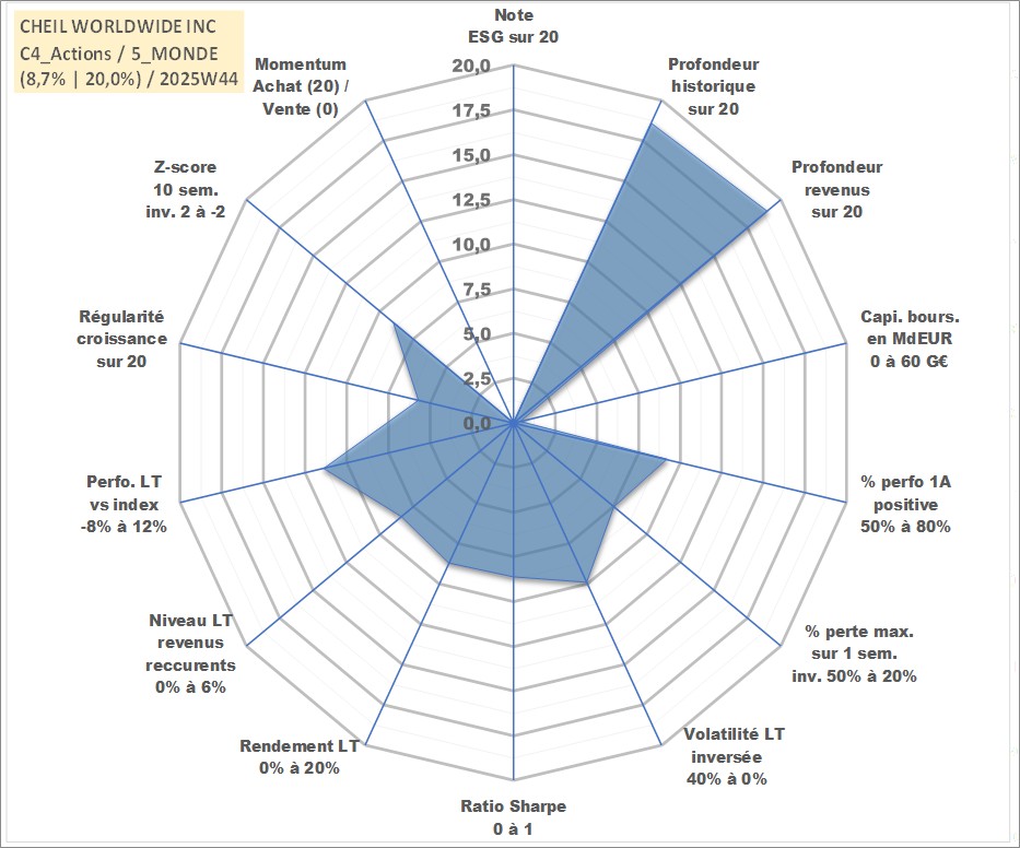 Site dédié aux investisseursPage dédiée sur site financeAnalyse des valorisations hebdomadaires de l'action CHEIL WORLDWIDE INC. Cet actif est cote en KRW. Les valorisations sont en contrevaleur EURO et couvrent les semaines 2000W02 a 2025W44. Les revenus de cet actif financier sont pris en compte depuis la semaine 2000W01. La note ESG de cet actif n'est pas connue.