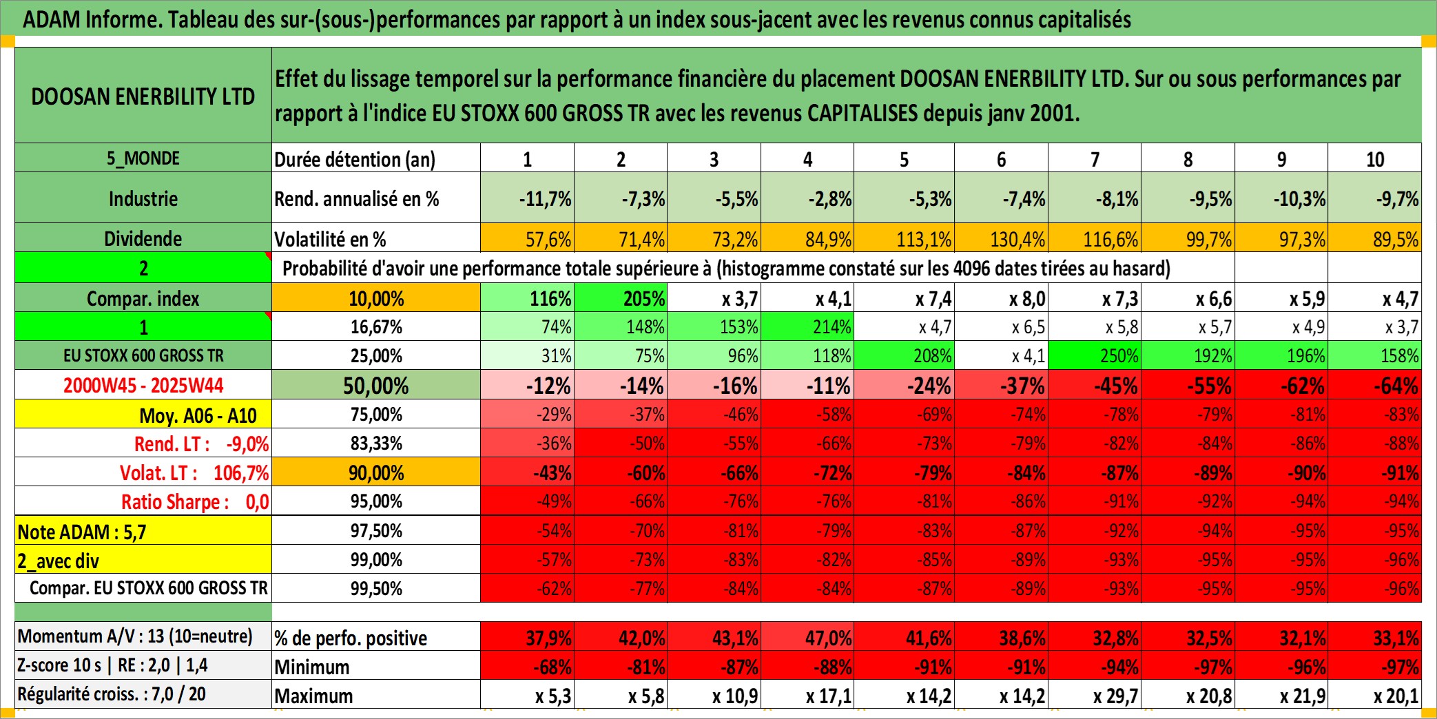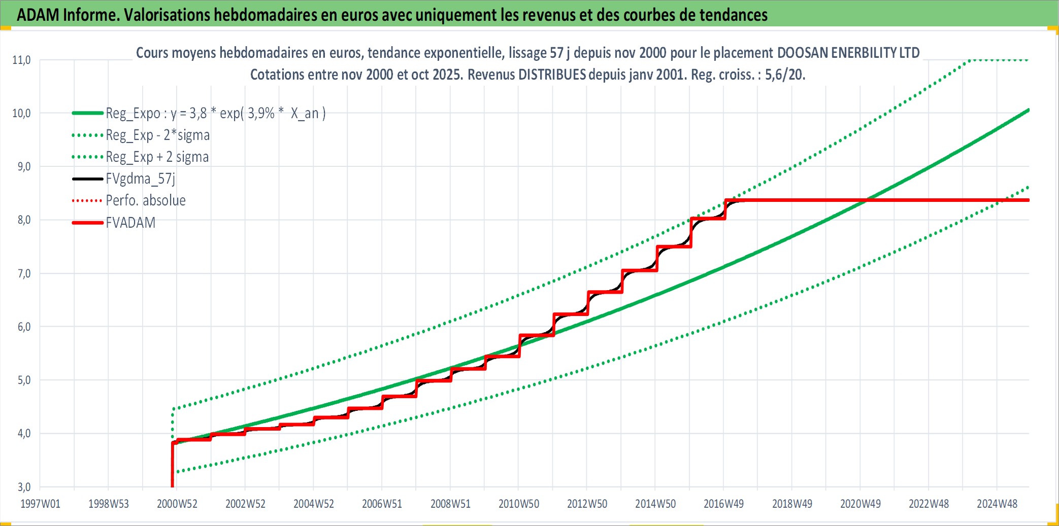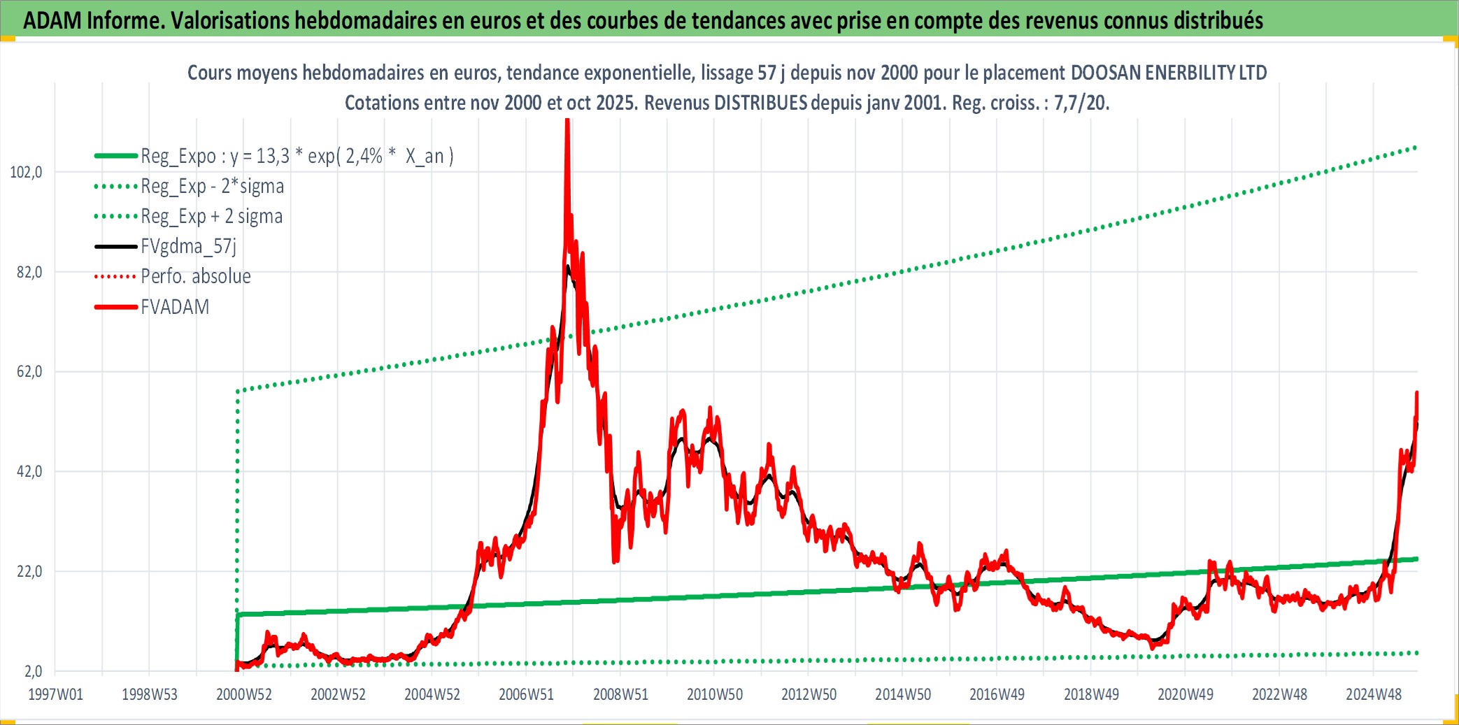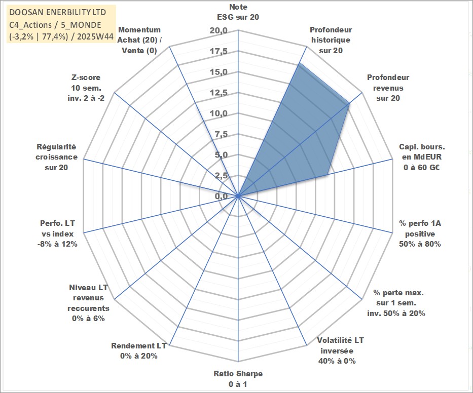 Site dédié aux investisseursPage dédiée sur site financeAnalyse des valorisations hebdomadaires de l'action DOOSAN ENERBILITY LTD. Cet actif est cote en KRW. Les valorisations sont en contrevaleur EURO et couvrent les semaines 2000W45 a 2025W44. Les revenus de cet actif financier sont pris en compte depuis la semaine 2001W01. La note ESG de cet actif n'est pas connue.