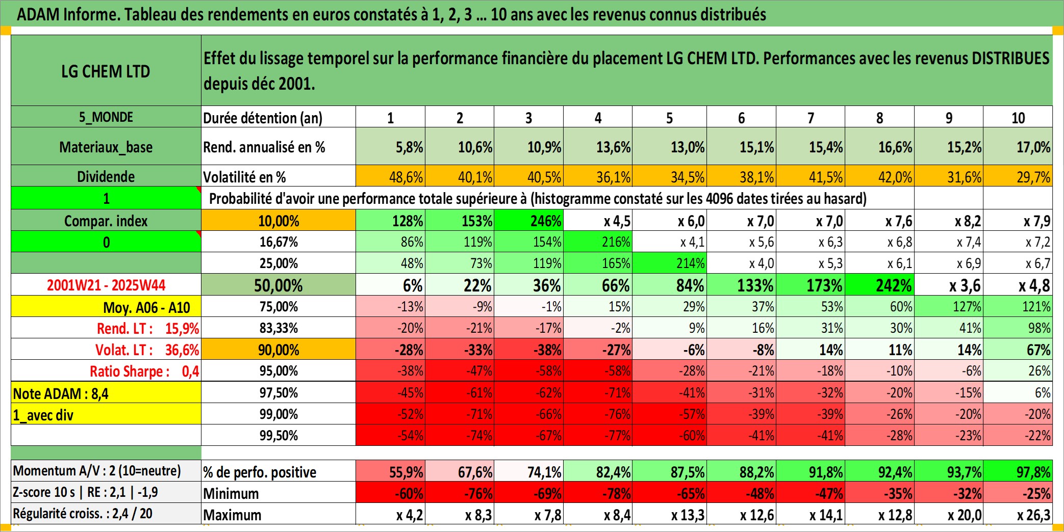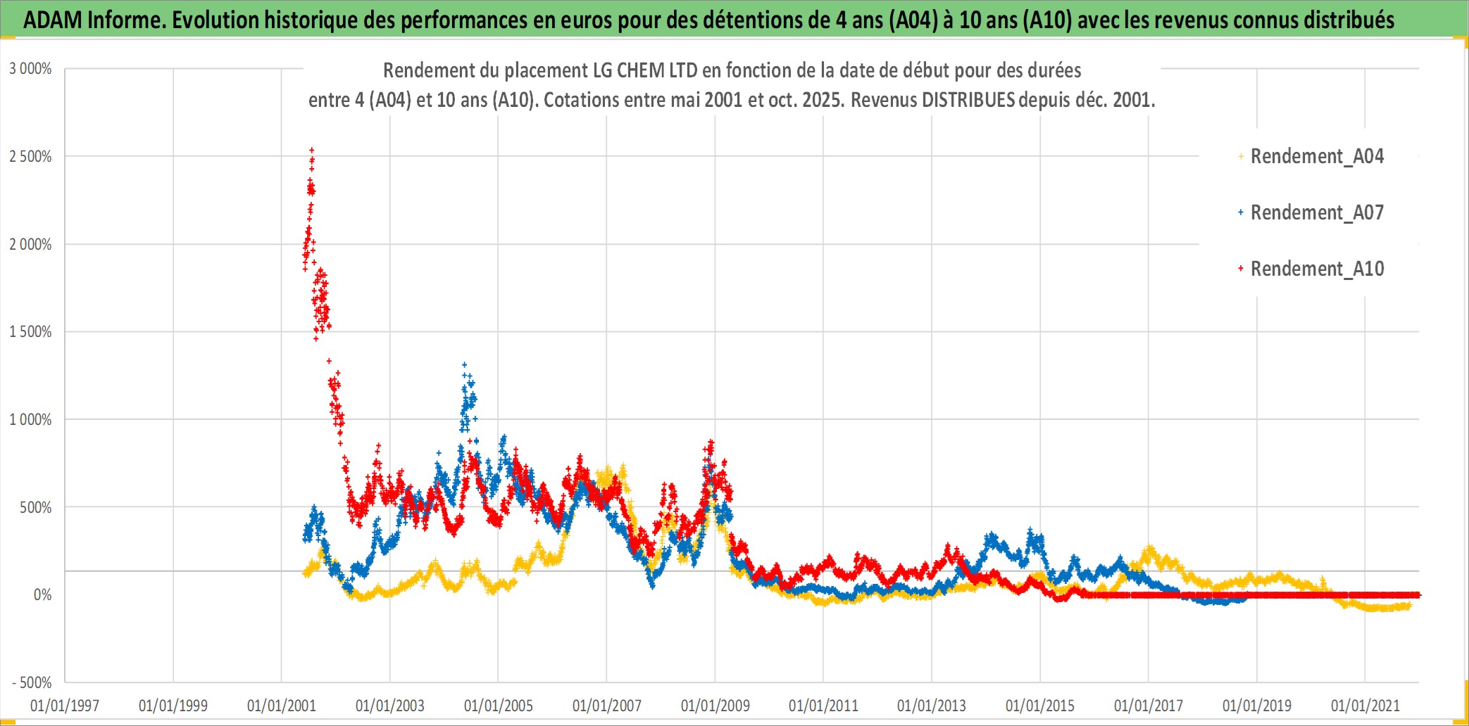 Site dédié aux investisseursPage dédiée sur site financeAnalyse des valorisations hebdomadaires de l'action LG CHEM LTD. Cet actif est cote en KRW. Les valorisations sont en contrevaleur EURO et couvrent les semaines 2001W21 a 2025W44. Les revenus de cet actif financier sont pris en compte depuis la semaine 2001W52. La note globale ESG de cet actif est estimee a 7.0 (apres rebasage entre 0 et 20).