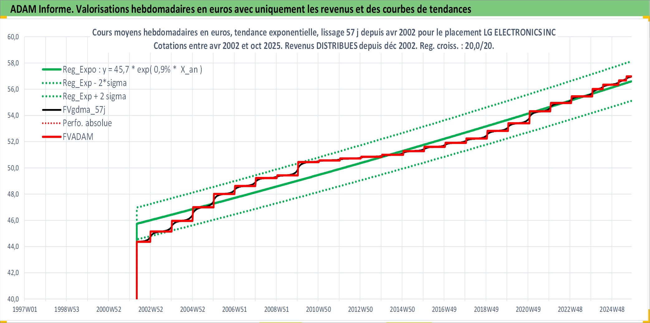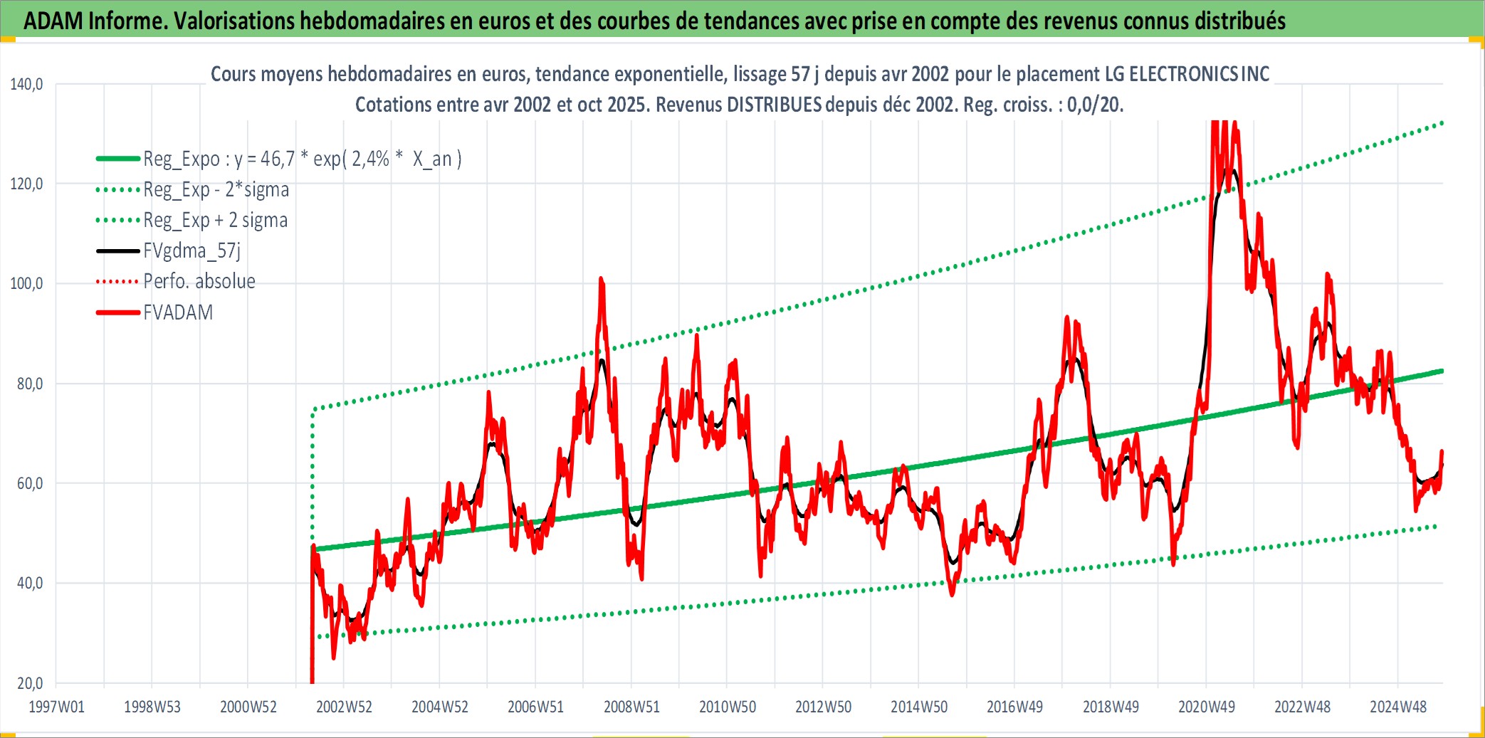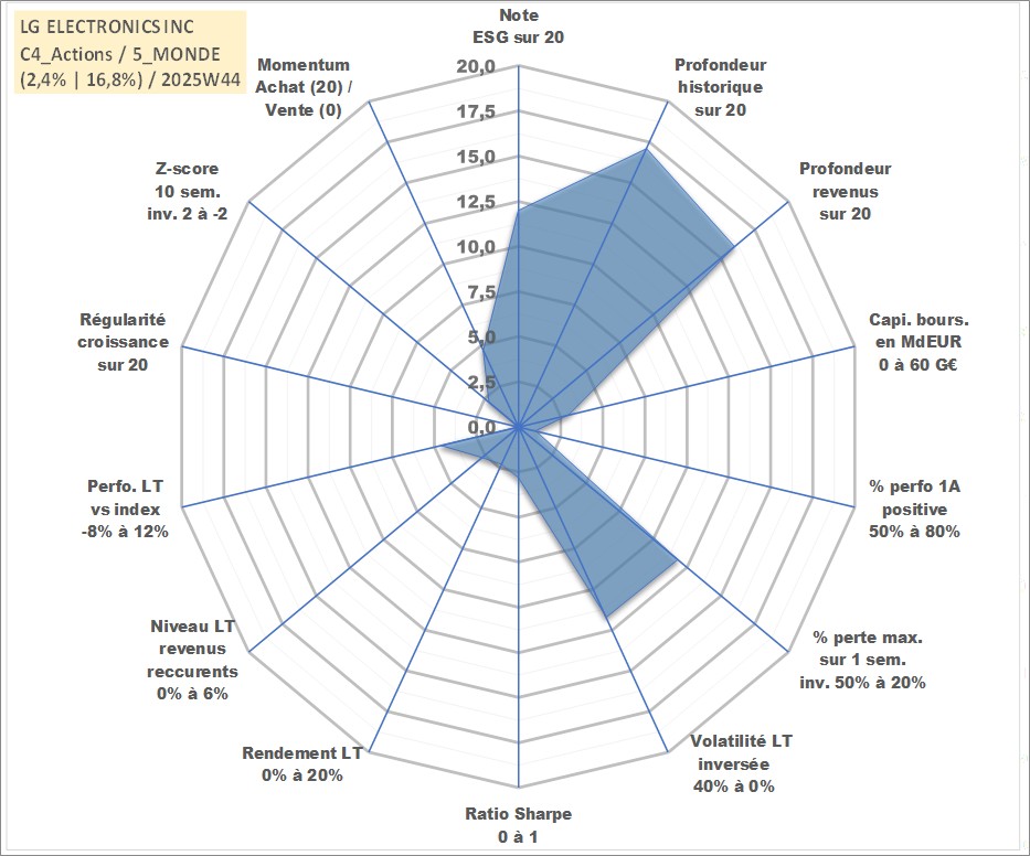 Site dédié aux investisseursPage dédiée sur site financeAnalyse des valorisations hebdomadaires de l'action LG ELECTRONICS INC. Cet actif est cote en KRW. Les valorisations sont en contrevaleur EURO et couvrent les semaines 2002W18 a 2025W44. Les revenus de cet actif financier sont pris en compte depuis la semaine 2002W52. La note globale ESG de cet actif est estimee a 12.0 (apres rebasage entre 0 et 20).