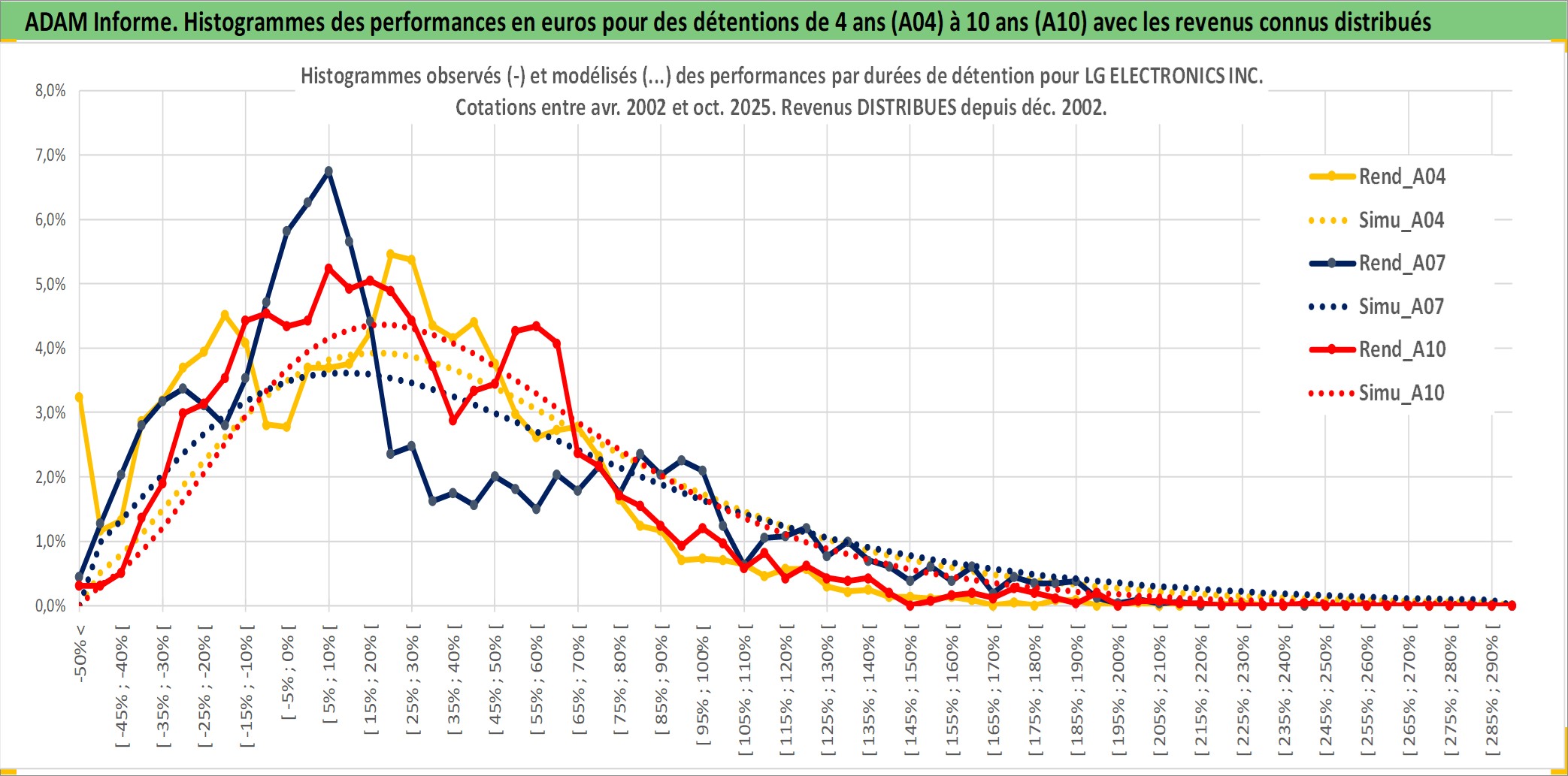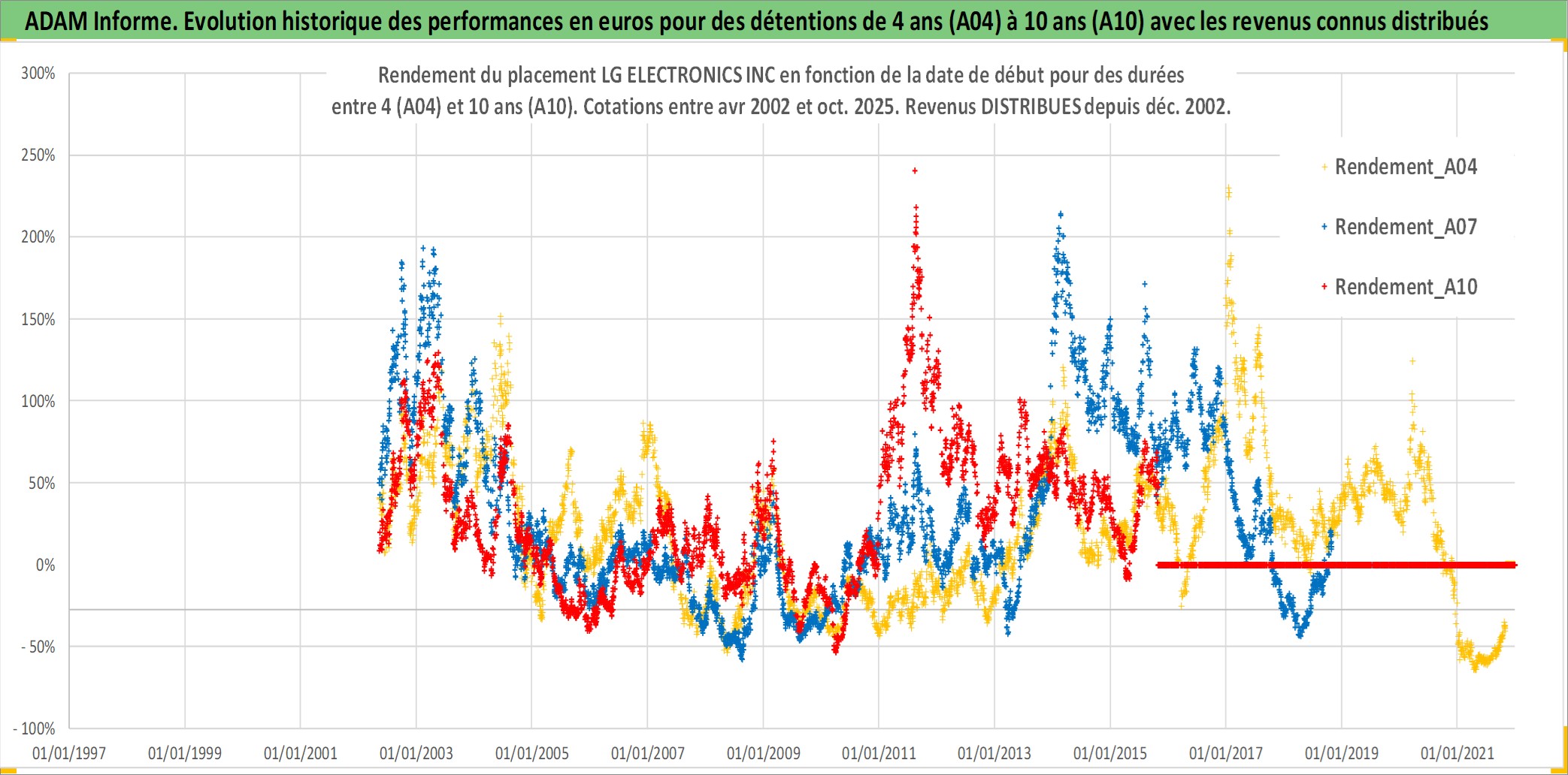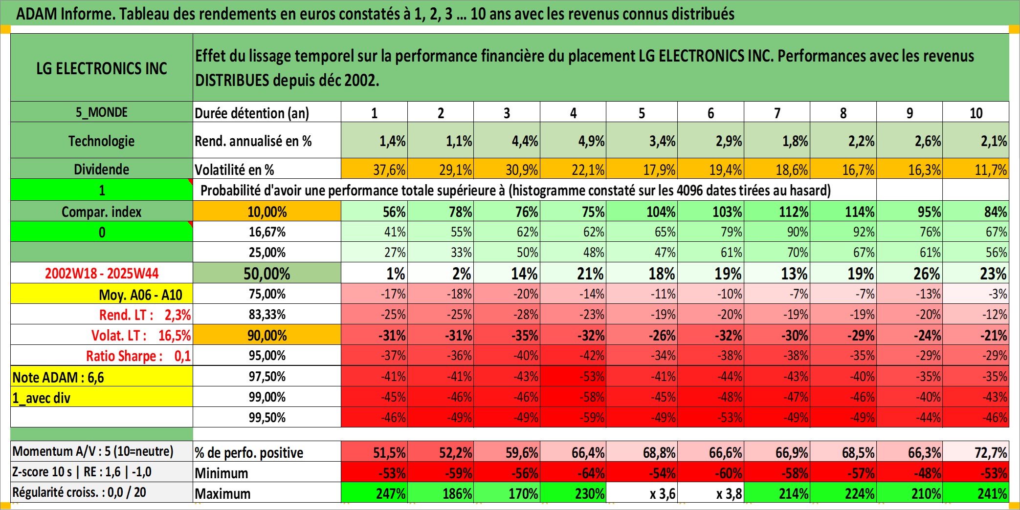 Site dédié aux investisseursPage dédiée sur site financeAnalyse des valorisations hebdomadaires de l'action LG ELECTRONICS INC. Cet actif est cote en KRW. Les valorisations sont en contrevaleur EURO et couvrent les semaines 2002W18 a 2025W44. Les revenus de cet actif financier sont pris en compte depuis la semaine 2002W52. La note globale ESG de cet actif est estimee a 12.0 (apres rebasage entre 0 et 20).