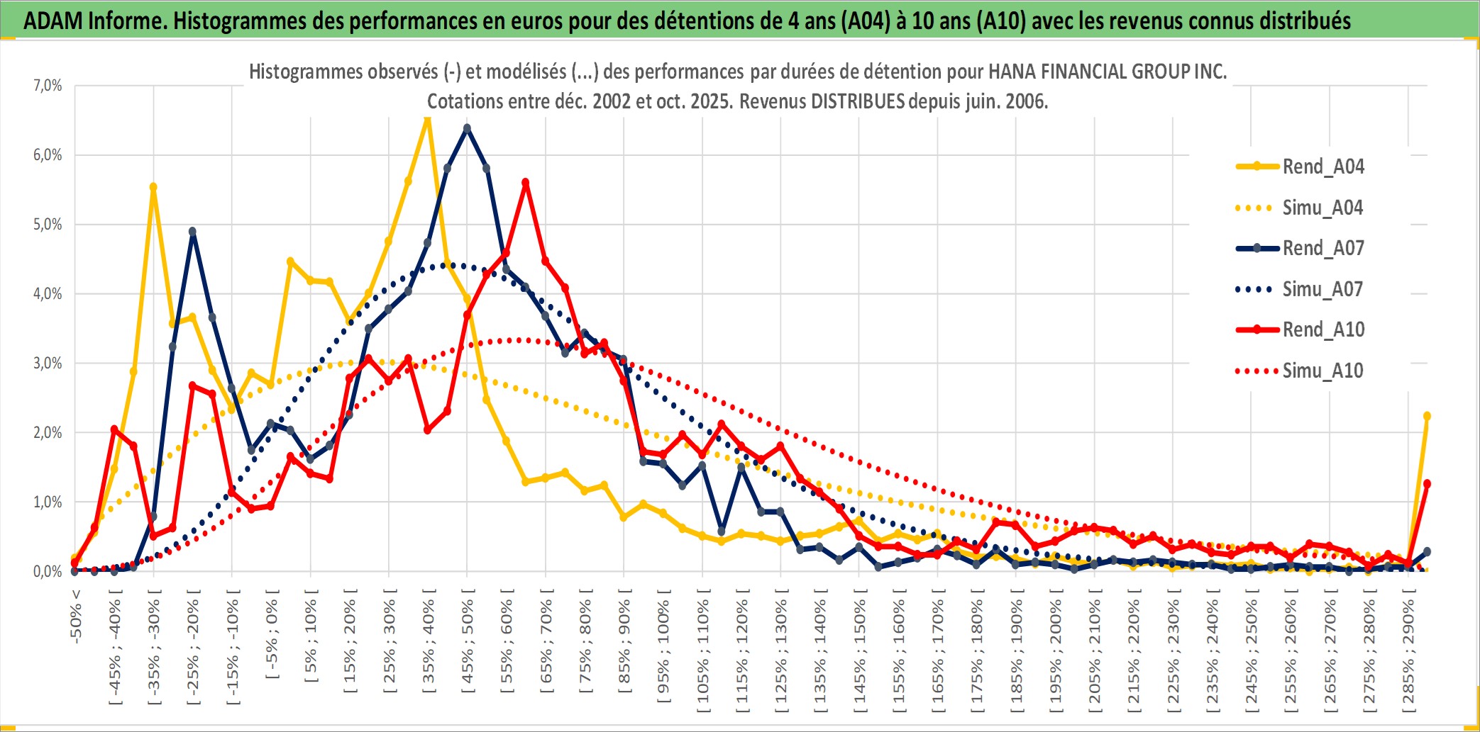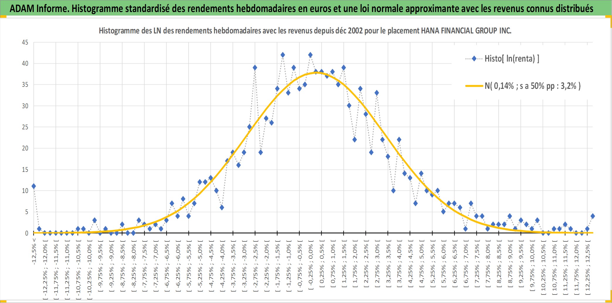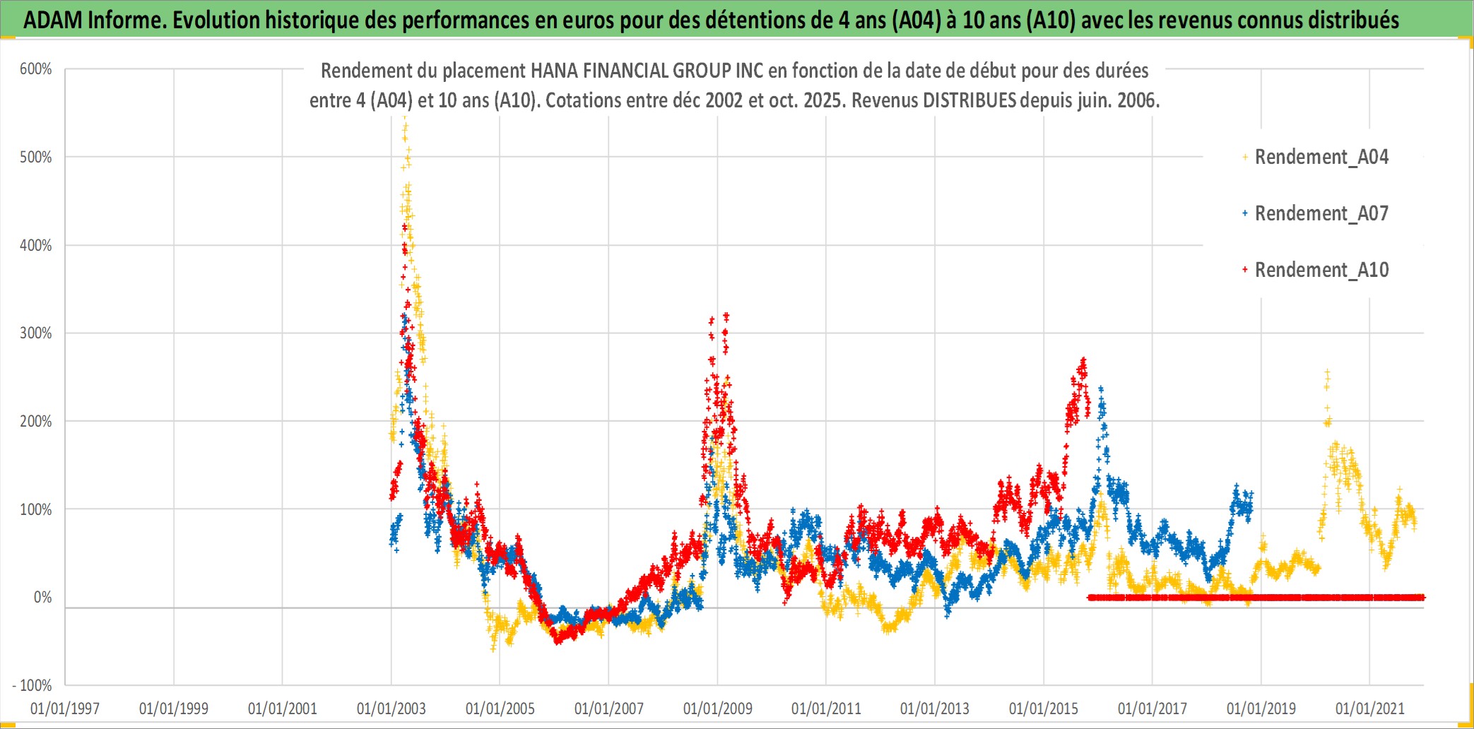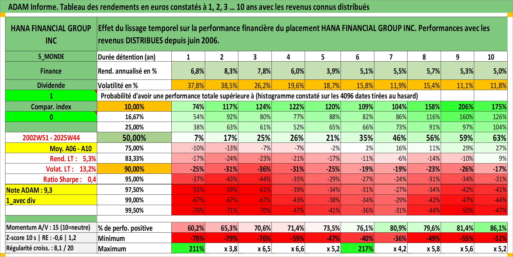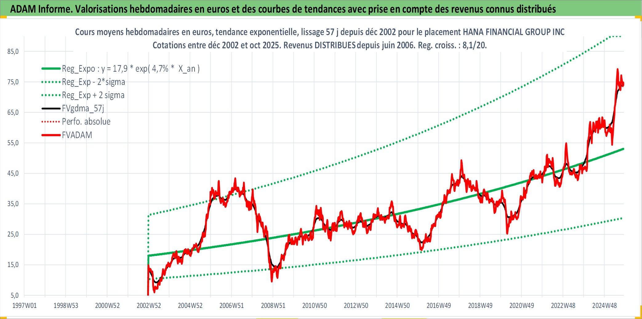 Site dédié aux investisseursPage dédiée sur site financeAnalyse des valorisations hebdomadaires de l'action HANA FINANCIAL GROUP INC. Cet actif est cote en KRW. Les valorisations sont en contrevaleur EURO et couvrent les semaines 2002W51 a 2025W44. Les revenus de cet actif financier sont pris en compte depuis la semaine 2006W26. La note globale ESG de cet actif est estimee a 7.0 (apres rebasage entre 0 et 20).