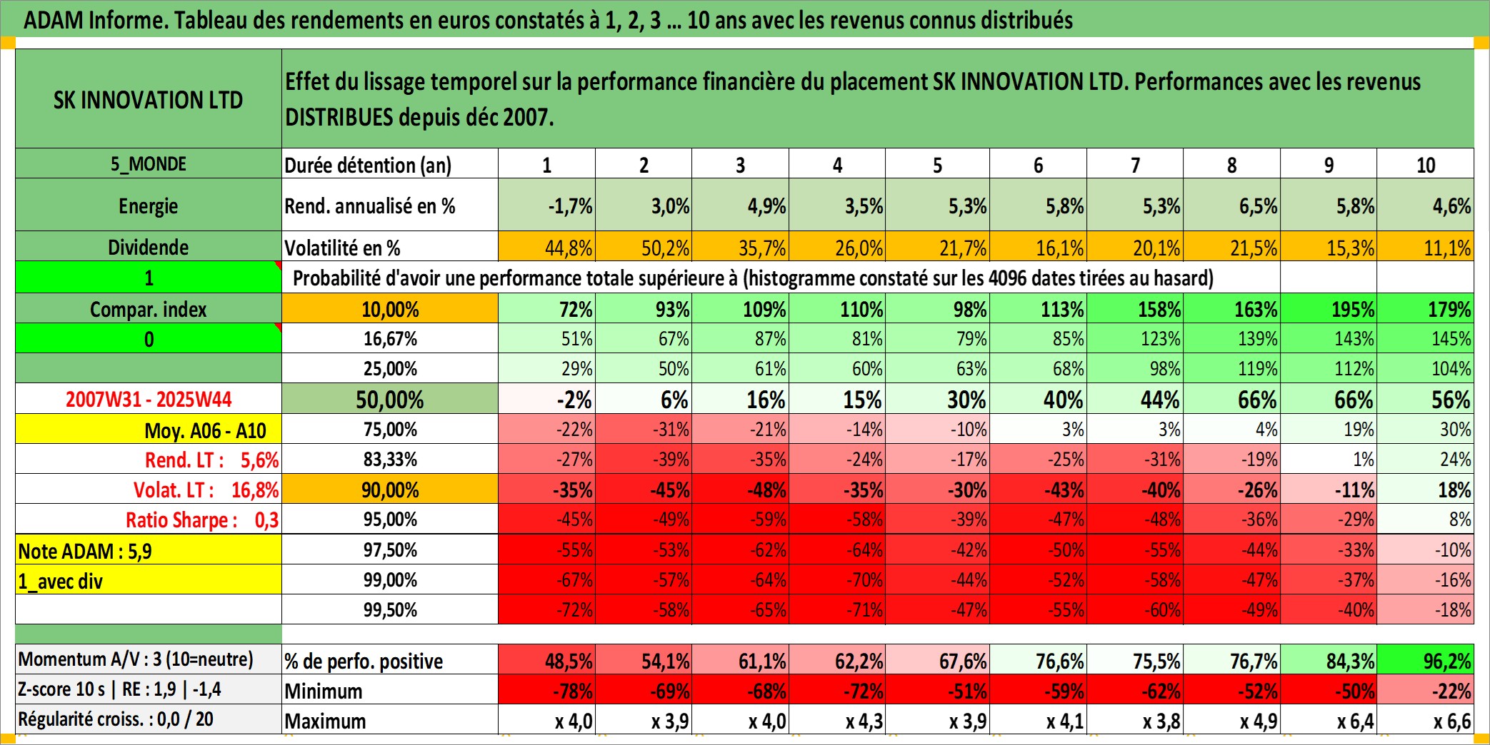 Site dédié aux investisseursPage dédiée sur site financeAnalyse des valorisations hebdomadaires de l'action SK INNOVATION LTD. Cet actif est cote en KRW. Les valorisations sont en contrevaleur EURO et couvrent les semaines 2007W31 a 2025W44. Les revenus de cet actif financier sont pris en compte depuis la semaine 2007W52. La note globale ESG de cet actif est estimee a 6.0 (apres rebasage entre 0 et 20).