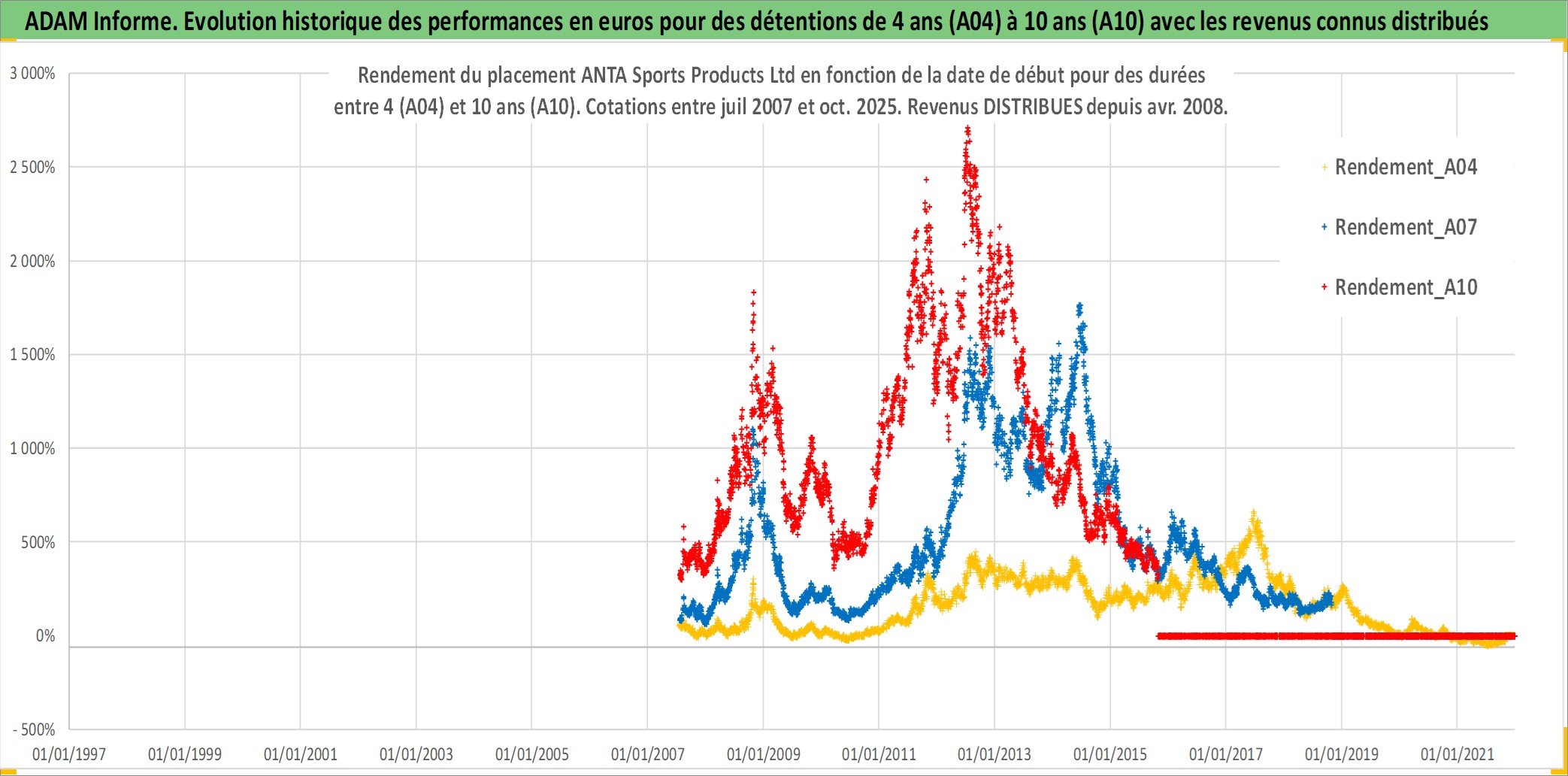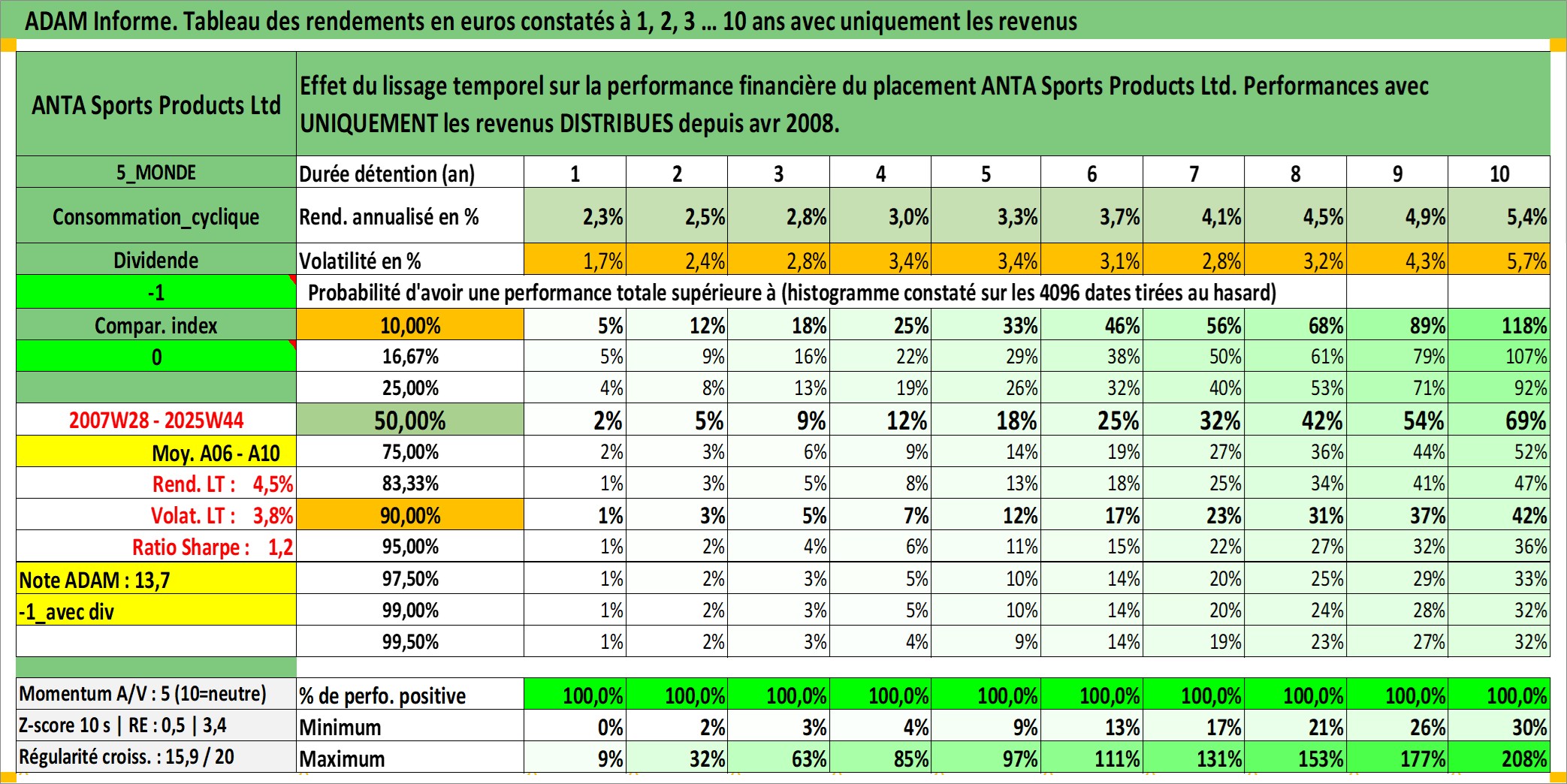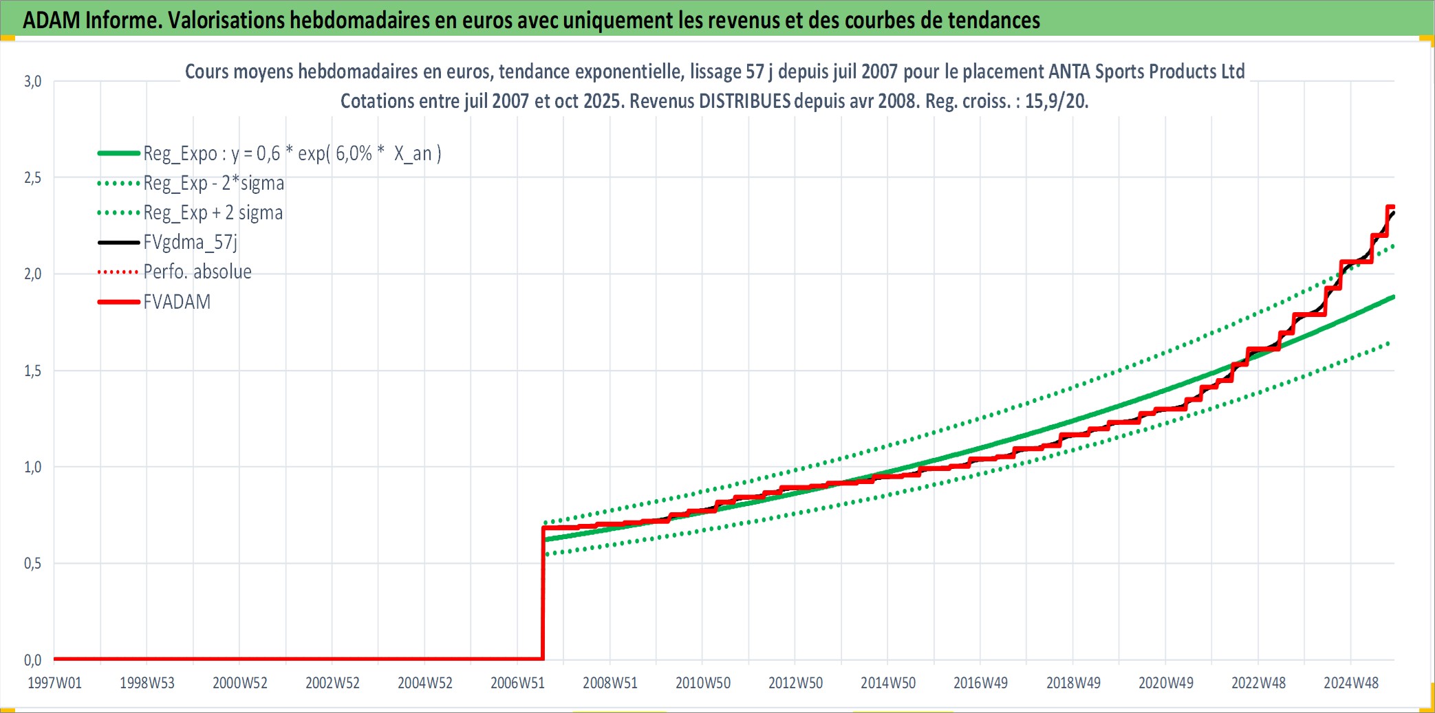 Site dédié aux investisseursPage dédiée sur site financeAnalyse des valorisations hebdomadaires de l'action ANTA Sports Products Ltd. Cet actif est cote en HKD. Les valorisations sont en contrevaleur EURO et couvrent les semaines 2007W28 a 2025W44. Les revenus de cet actif financier sont pris en compte depuis la semaine 2008W16. La note globale ESG de cet actif est estimee a 12.0 (apres rebasage entre 0 et 20).