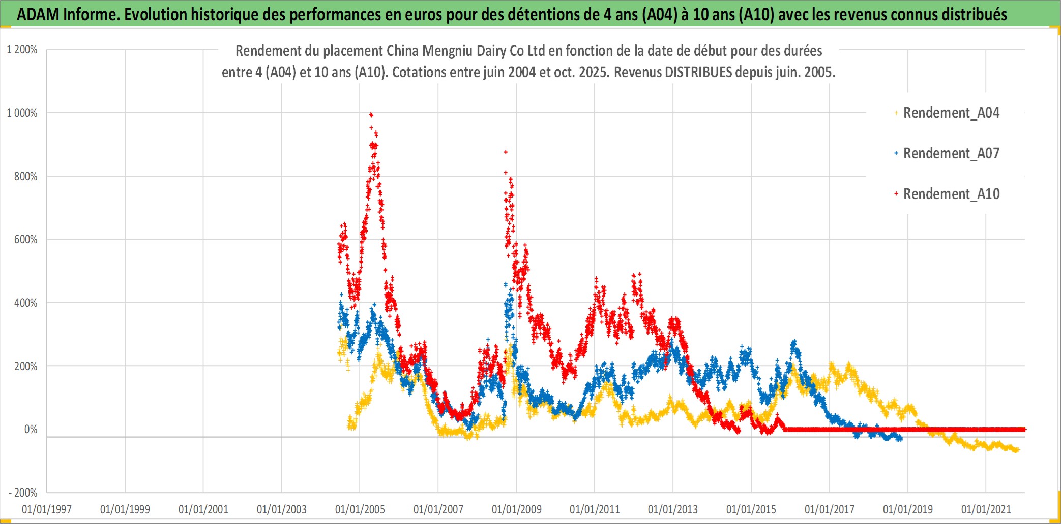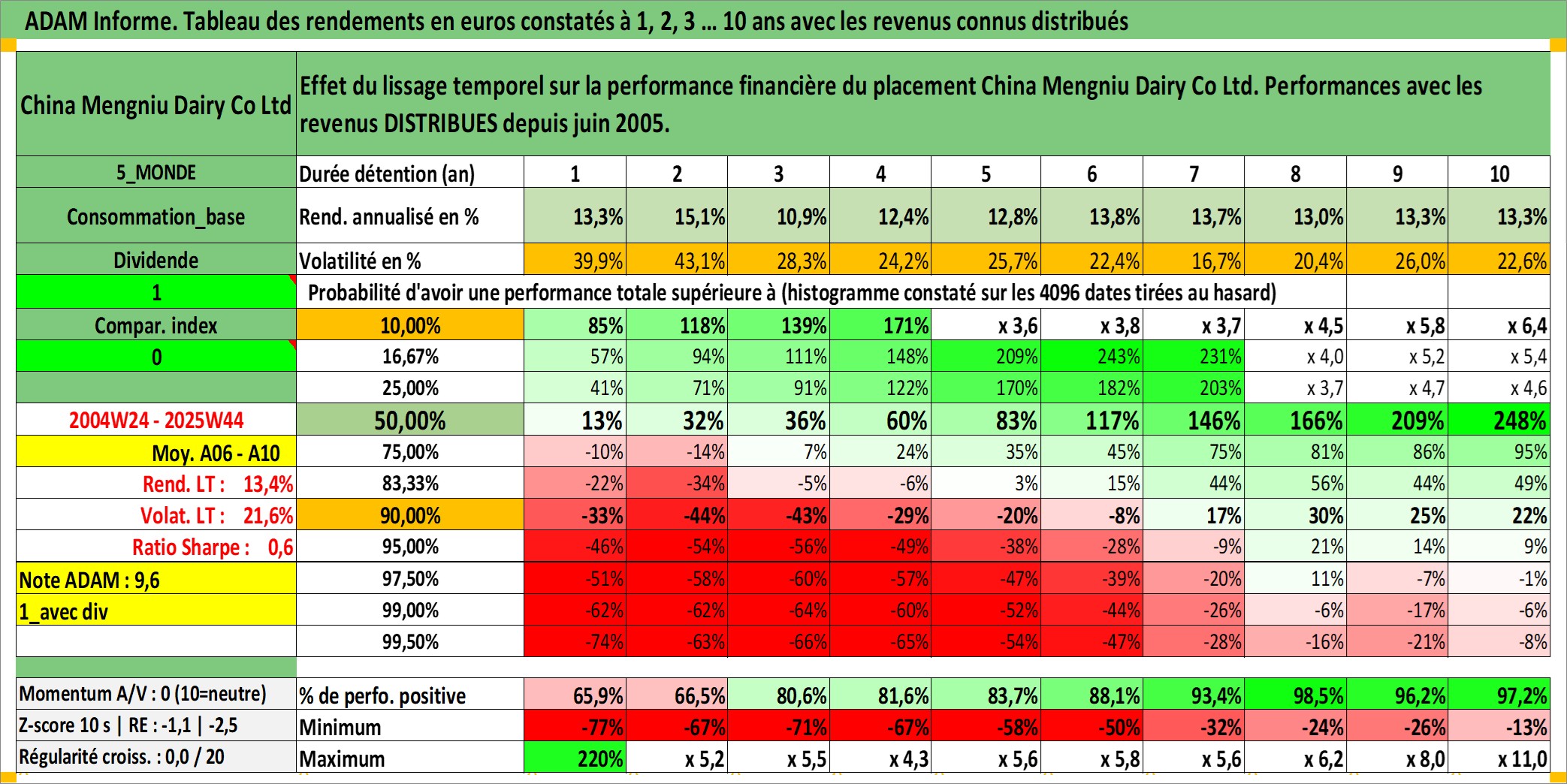 Site dédié aux investisseursPage dédiée sur site financeAnalyse des valorisations hebdomadaires de l'action China Mengniu Dairy Co Ltd. Cet actif est cote en HKD. Les valorisations sont en contrevaleur EURO et couvrent les semaines 2004W24 a 2025W44. Les revenus de cet actif financier sont pris en compte depuis la semaine 2005W25. La note globale ESG de cet actif est estimee a 4.0 (apres rebasage entre 0 et 20).