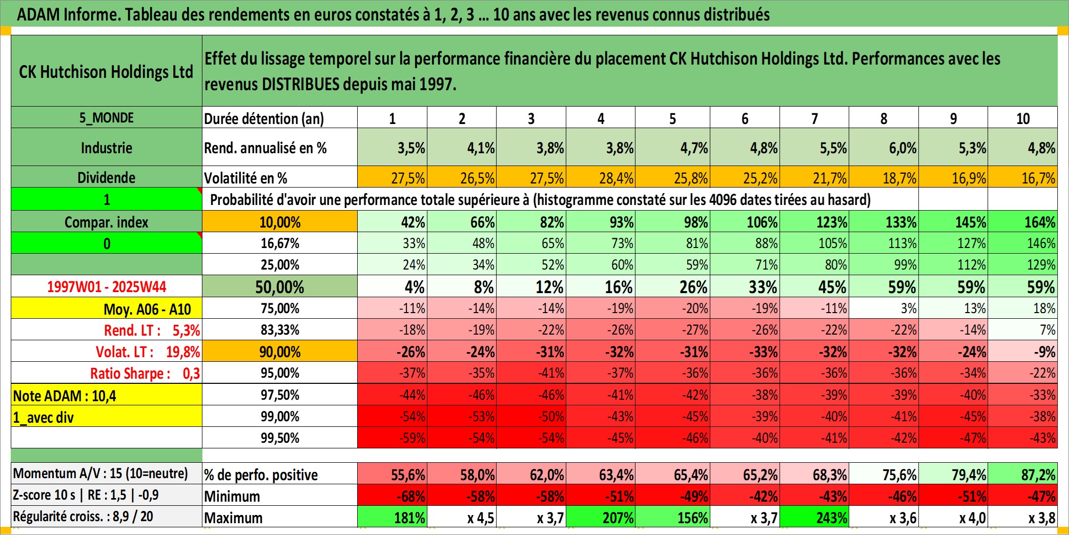 Site dédié aux investisseursPage dédiée sur site financeAnalyse des valorisations hebdomadaires de l'action CK Hutchison Holdings Ltd. Cet actif est cote en HKD. Les valorisations sont en contrevaleur EURO et couvrent les semaines 1997W01 a 2025W44. Les revenus de cet actif financier sont pris en compte depuis la semaine 1997W21. La note globale ESG de cet actif est estimee a 6.0 (apres rebasage entre 0 et 20).