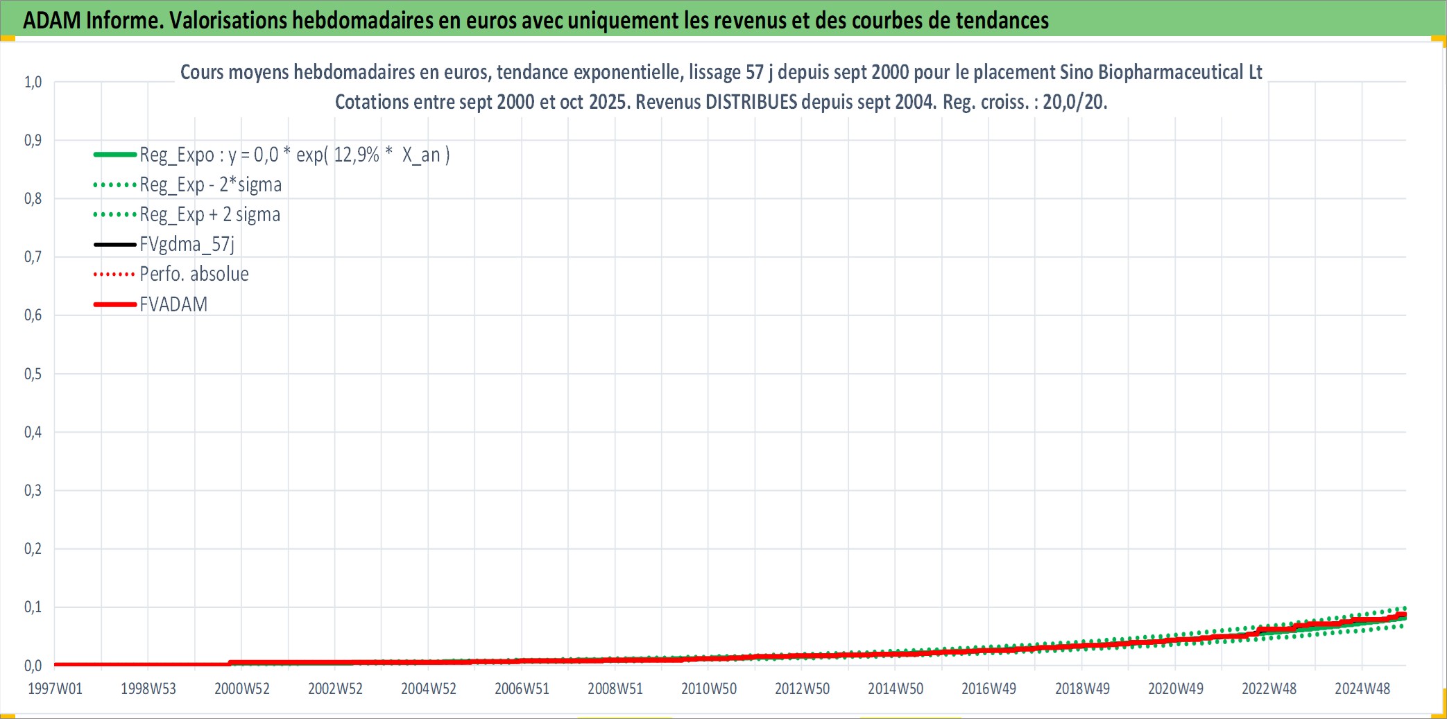 Site dédié aux investisseursPage dédiée sur site financeAnalyse des valorisations hebdomadaires de l'action Sino Biopharmaceutical Ltd. Cet actif est cote en HKD. Les valorisations sont en contrevaleur EURO et couvrent les semaines 2000W39 a 2025W44. Les revenus de cet actif financier sont pris en compte depuis la semaine 2004W38. La note globale ESG de cet actif est estimee a 2.0 (apres rebasage entre 0 et 20).
