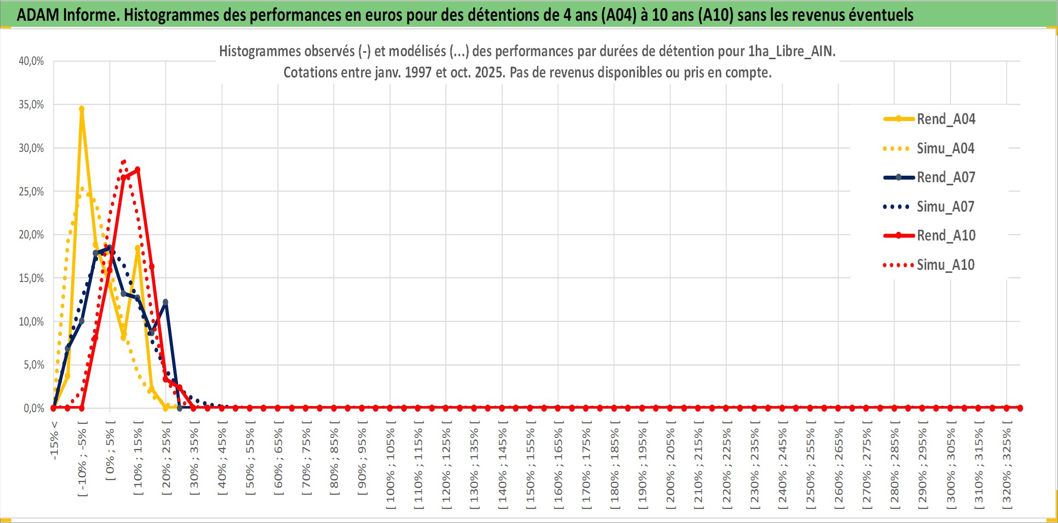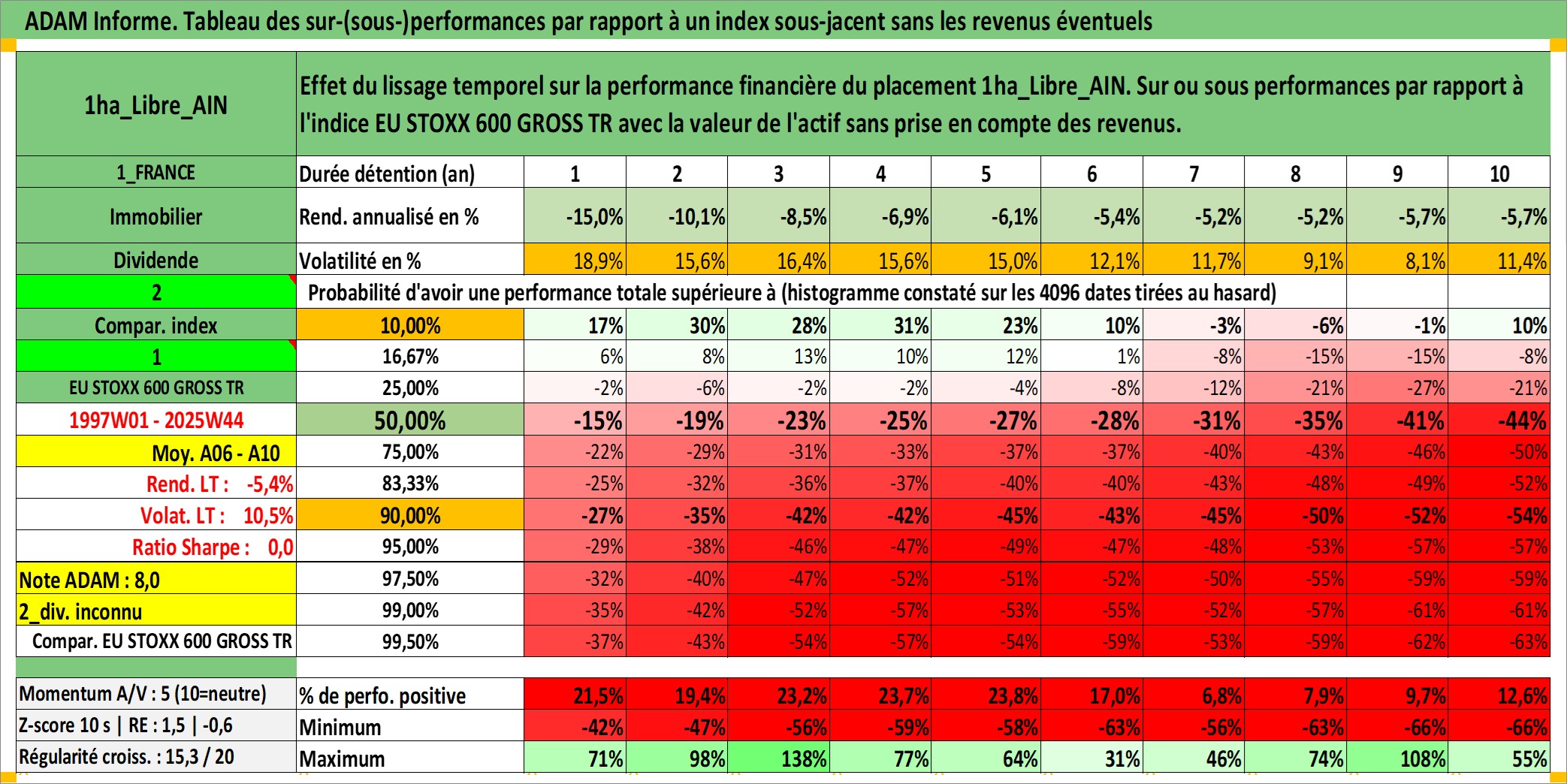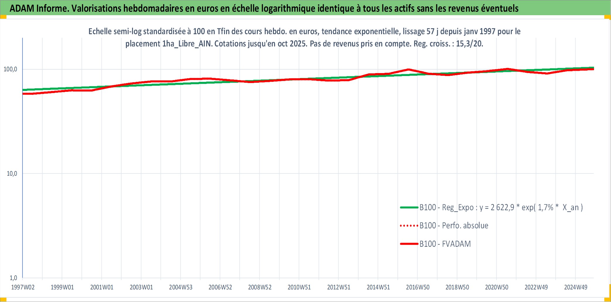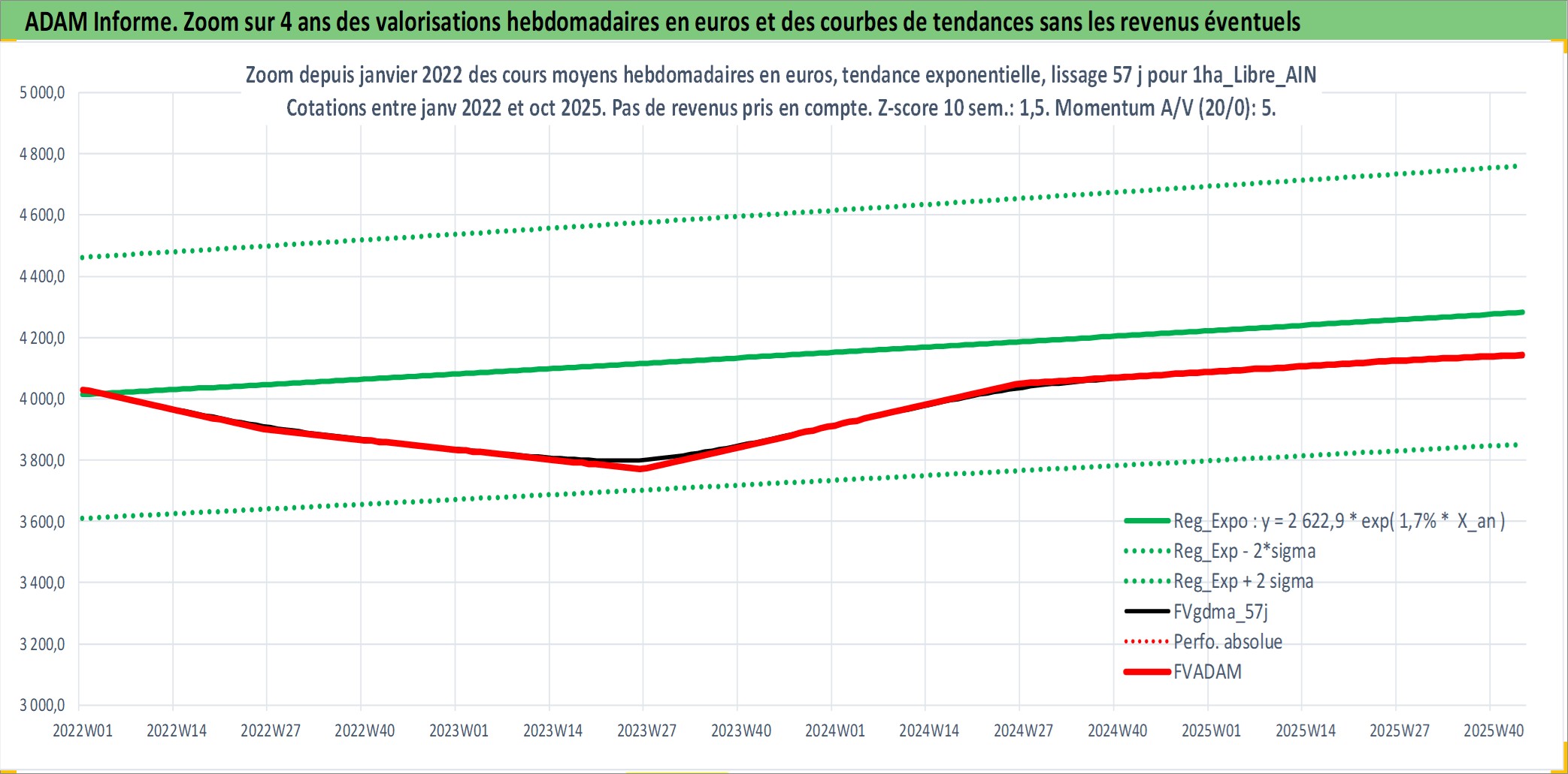 Site dédié aux investisseursPage dédiée sur site financeAnalyse des valorisations hebdomadaires de l'actif 1ha_Libre_AIN. Cet actif est cote en EUR. Les valorisations couvrent les semaines 1997W01 a 2025W44. Les fermages de ce bien foncier sont pris egaux a 2,5% annuels de la valeur venale du bien.