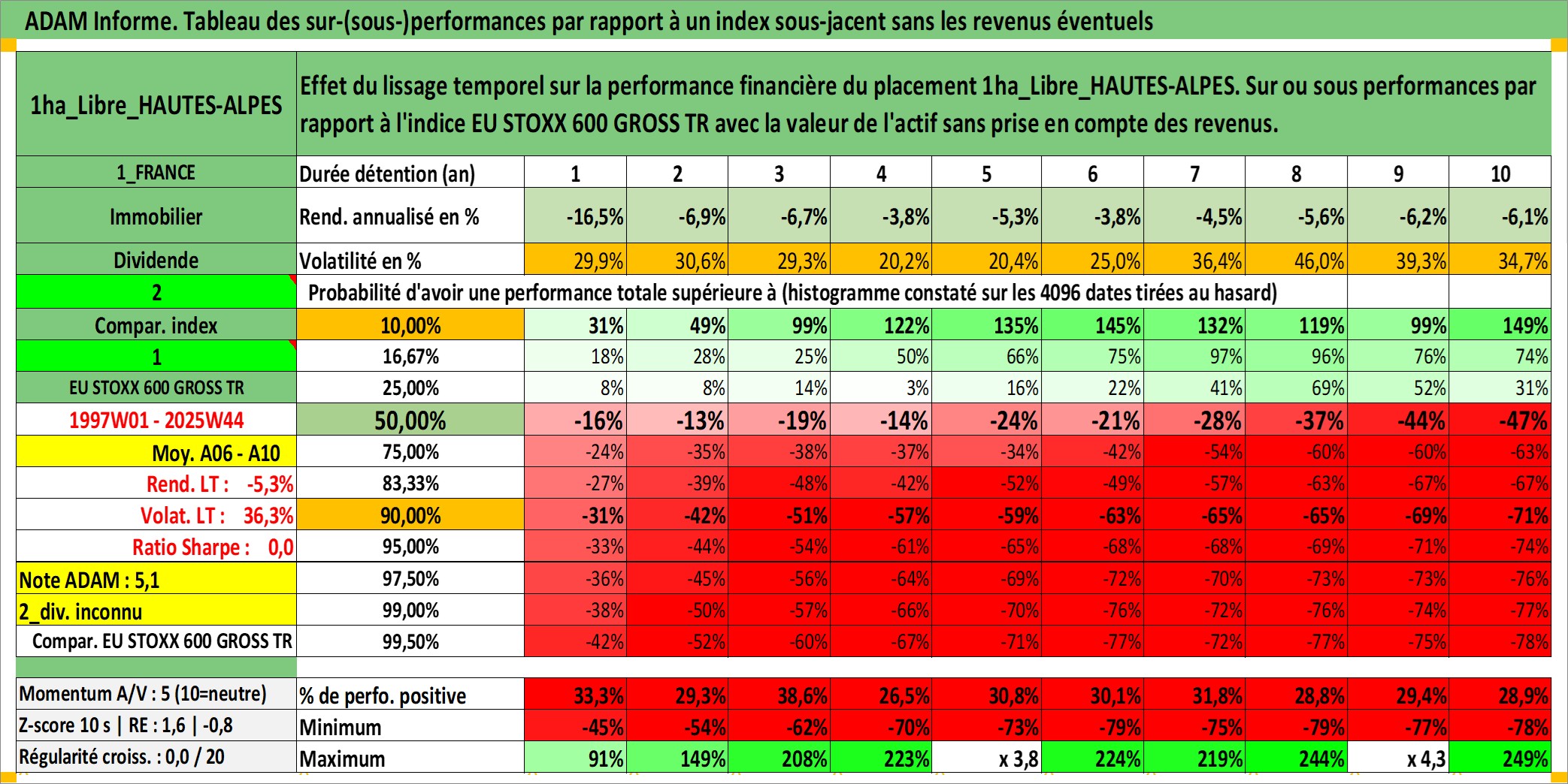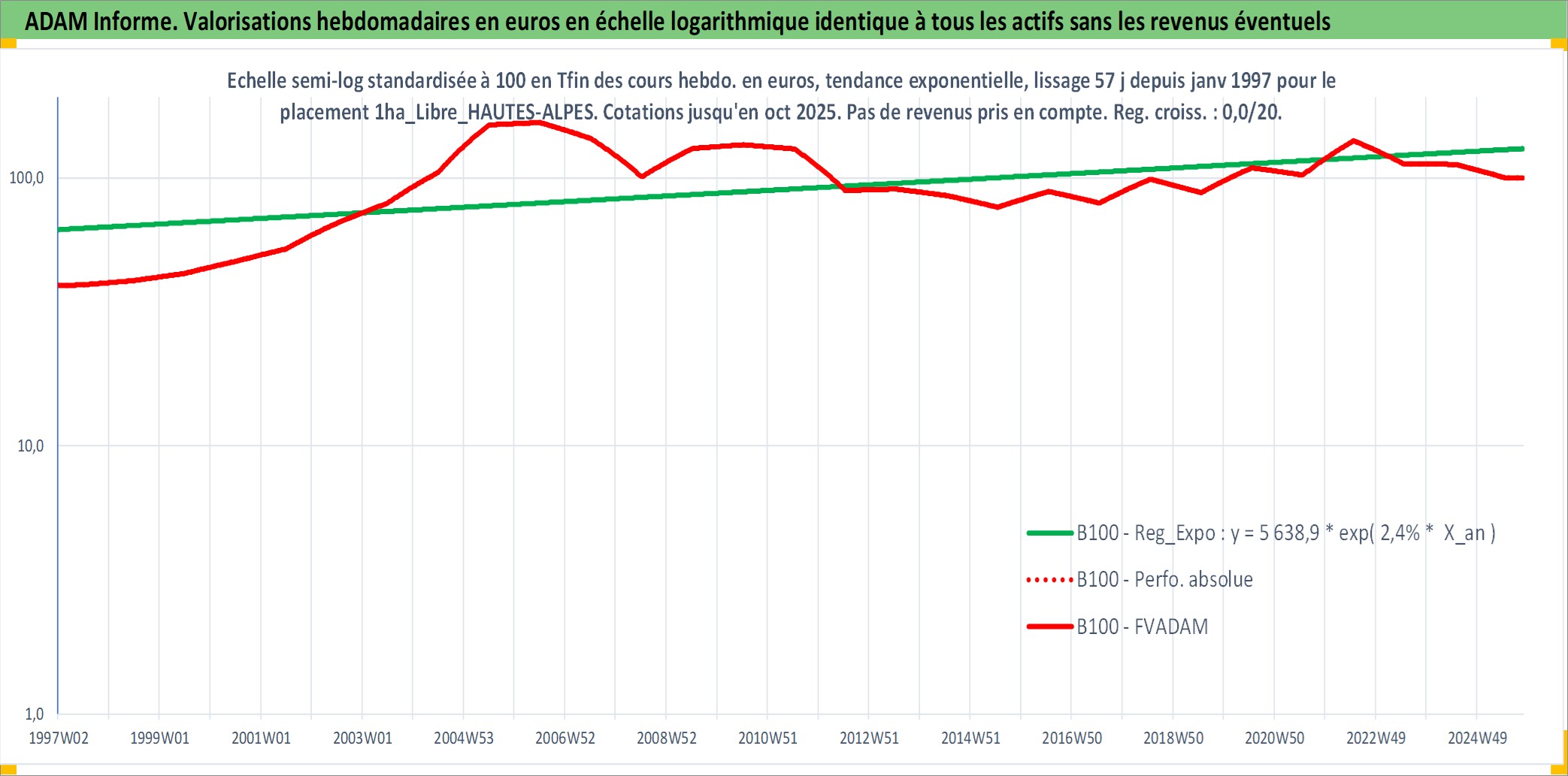 Site dédié aux investisseursPage dédiée sur site financeAnalyse des valorisations hebdomadaires de l'actif 1ha_Libre_HAUTES-ALPES. Cet actif est cote en EUR. Les valorisations couvrent les semaines 1997W01 a 2025W44. Les fermages de ce bien foncier sont pris egaux a 2,5% annuels de la valeur venale du bien.