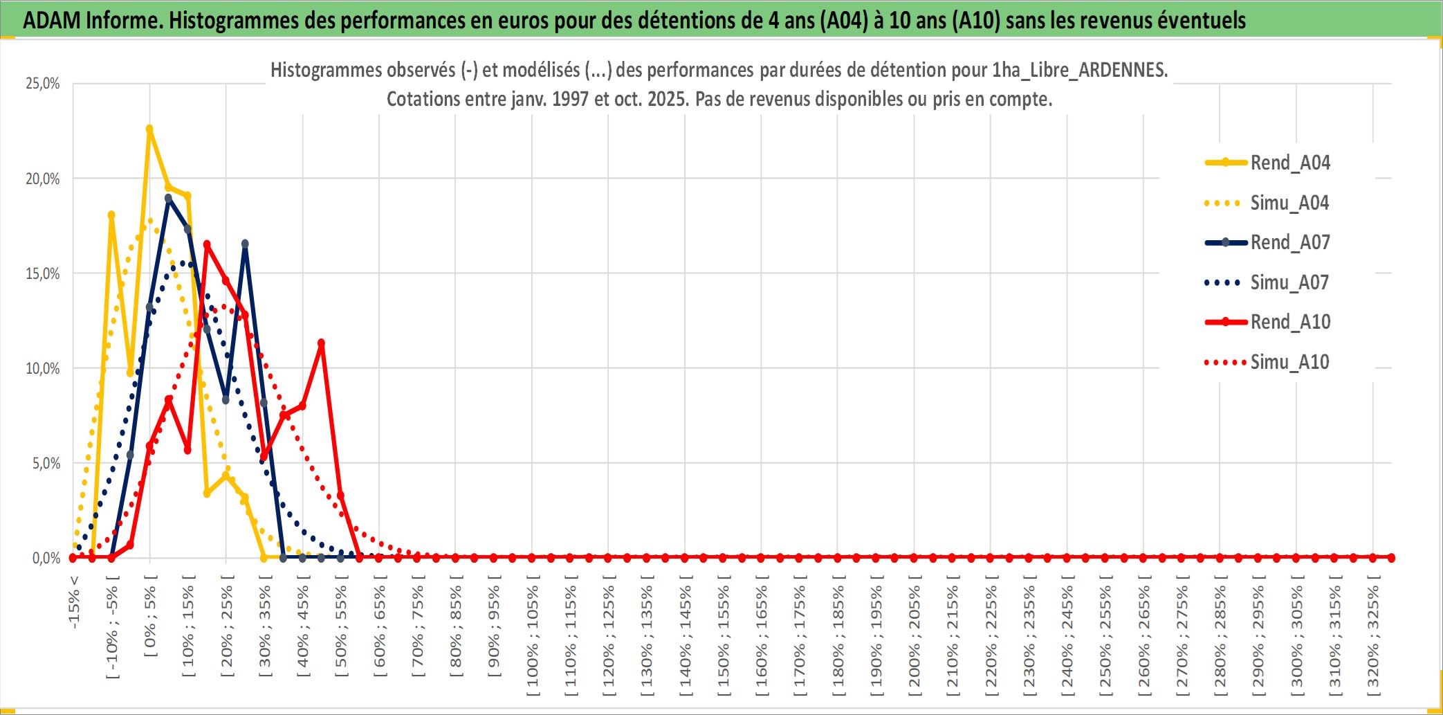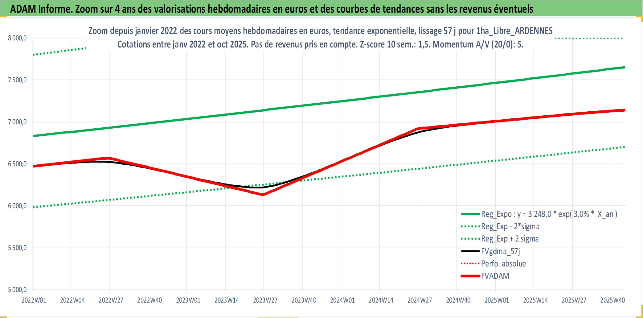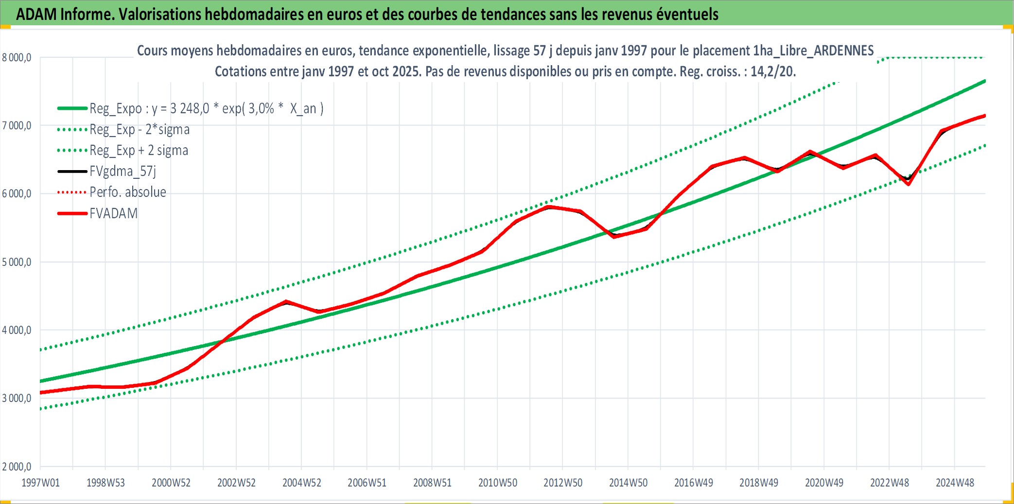 Site dédié aux investisseursPage dédiée sur site financeAnalyse des valorisations hebdomadaires de l'actif 1ha_Libre_ARDENNES. Cet actif est cote en EUR. Les valorisations couvrent les semaines 1997W01 a 2025W44. Les fermages de ce bien foncier sont pris egaux a 2,5% annuels de la valeur venale du bien.