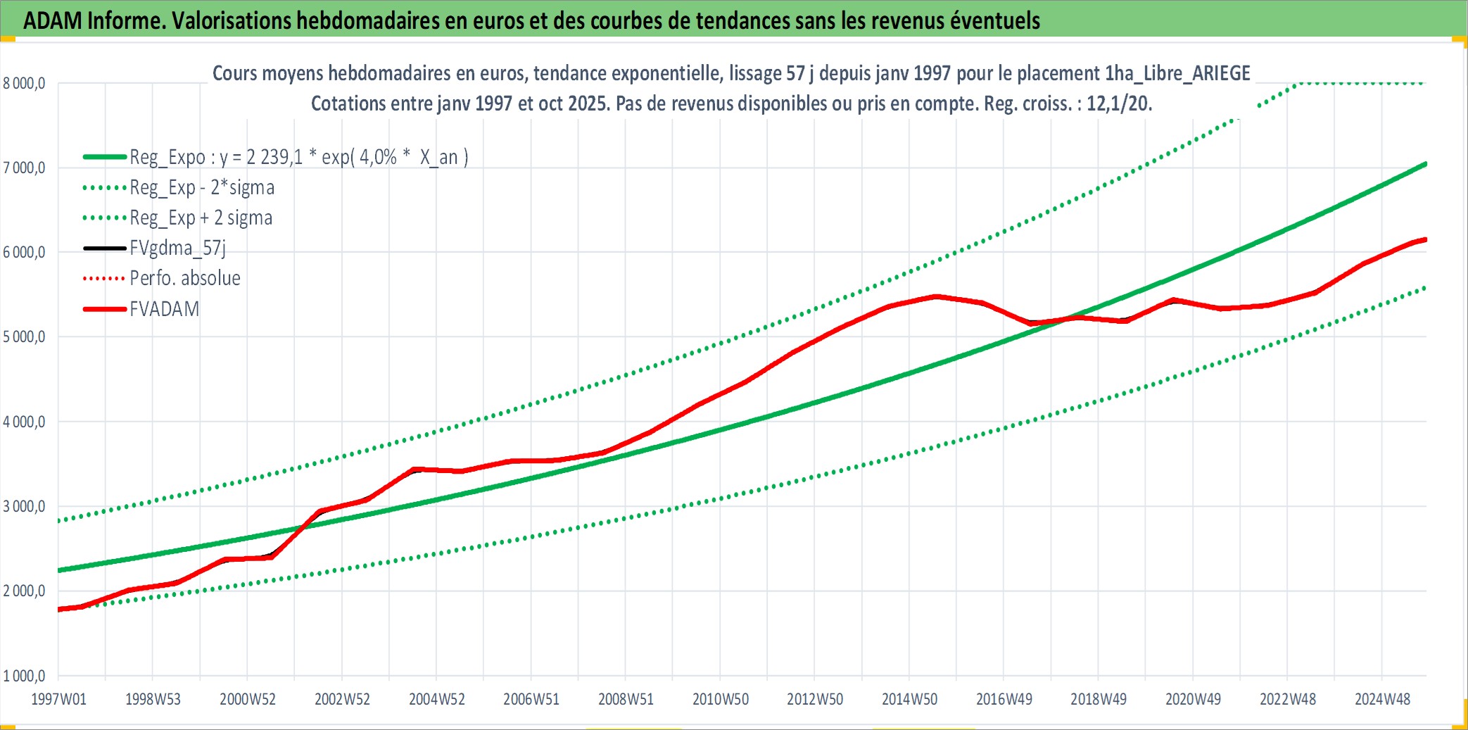 Site dédié aux investisseursPage dédiée sur site financeAnalyse des valorisations hebdomadaires de l'actif 1ha_Libre_ARIEGE. Cet actif est cote en EUR. Les valorisations couvrent les semaines 1997W01 a 2025W44. Les fermages de ce bien foncier sont pris egaux a 2,5% annuels de la valeur venale du bien.