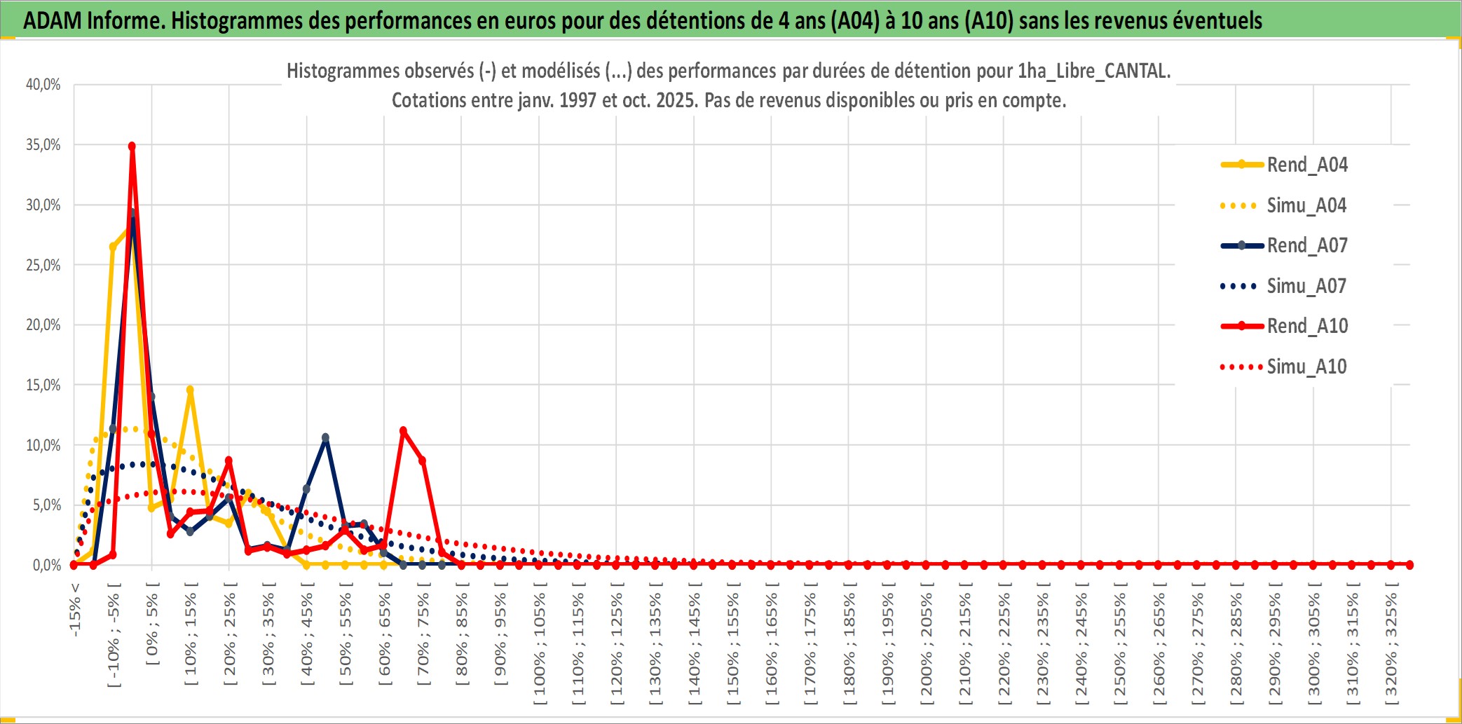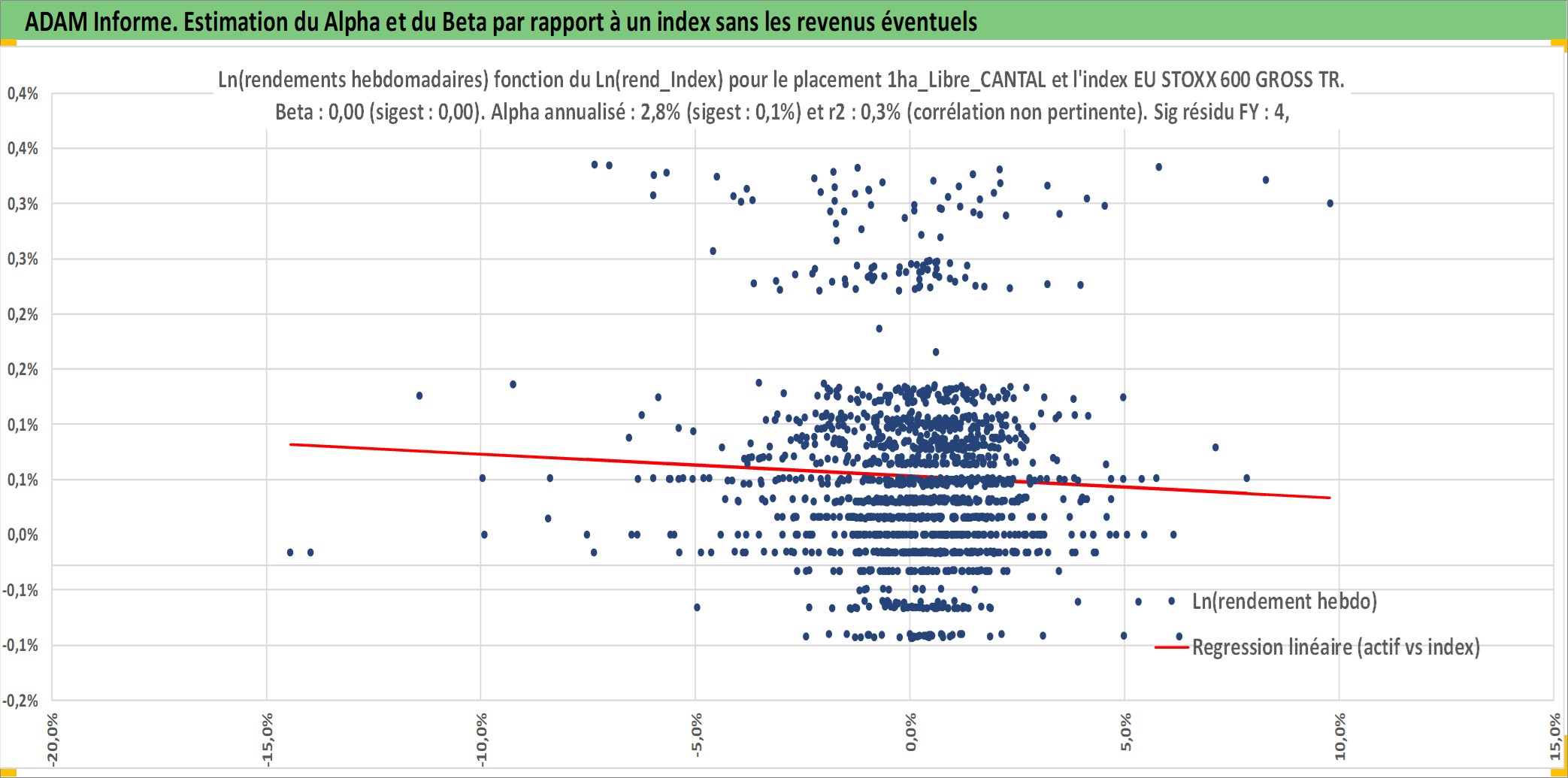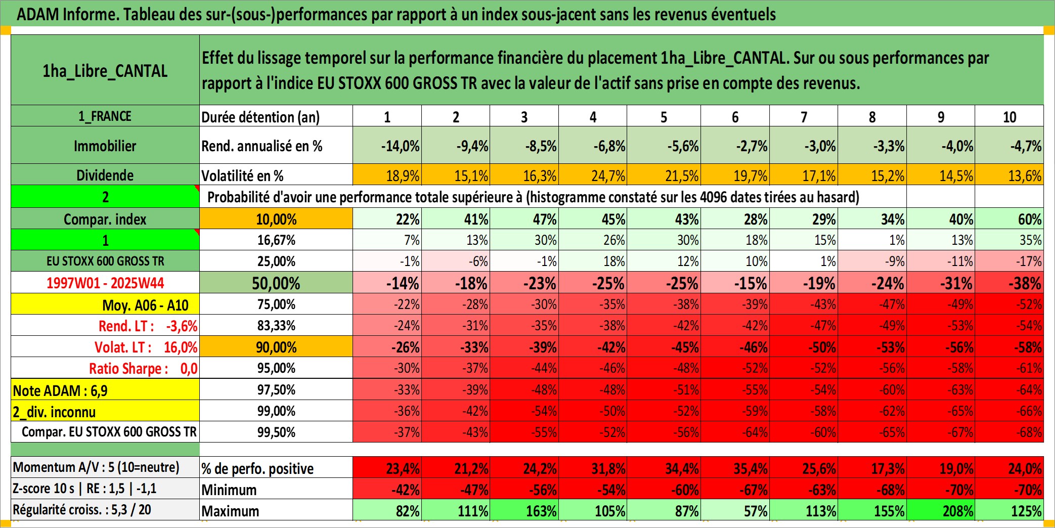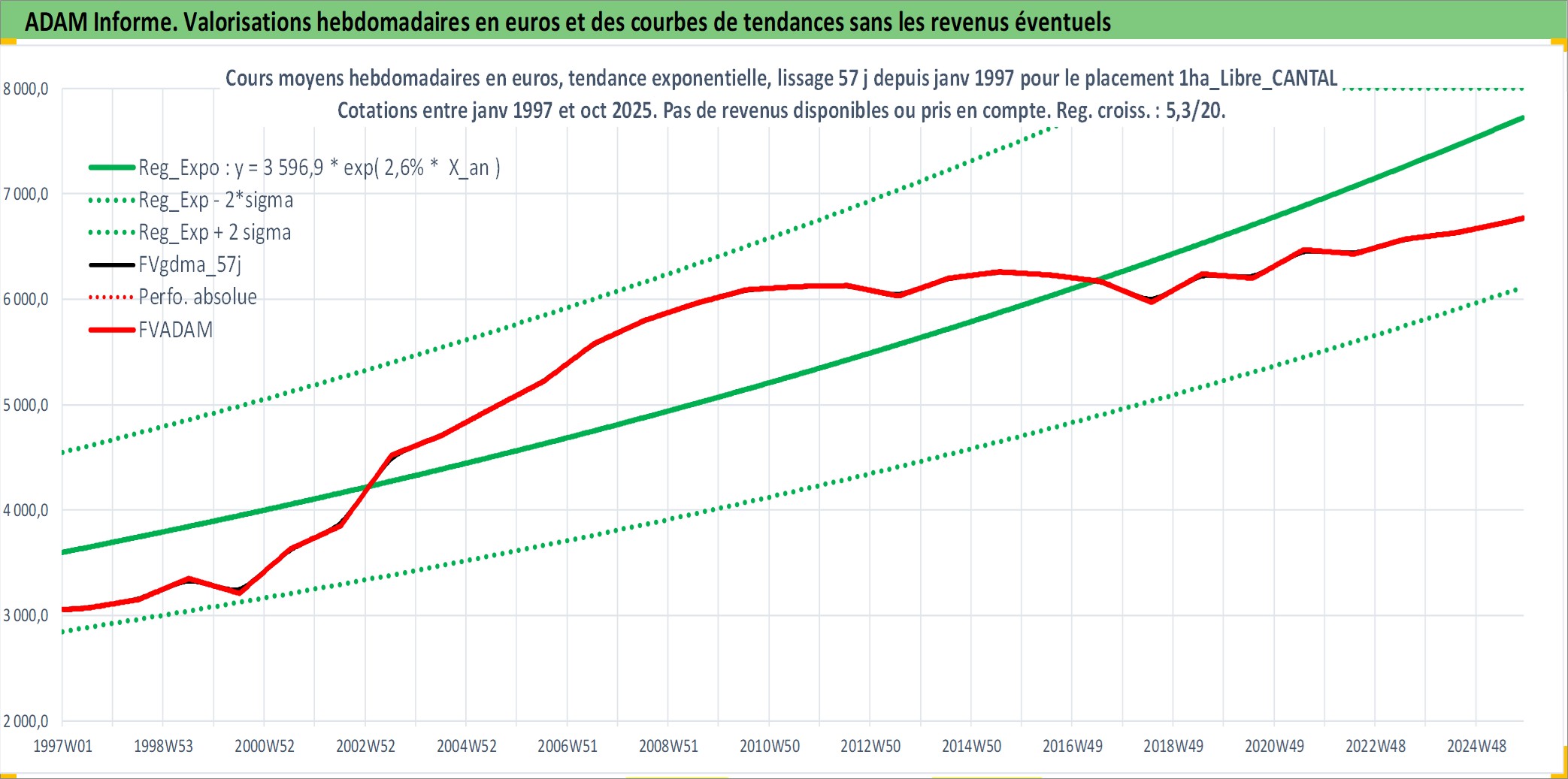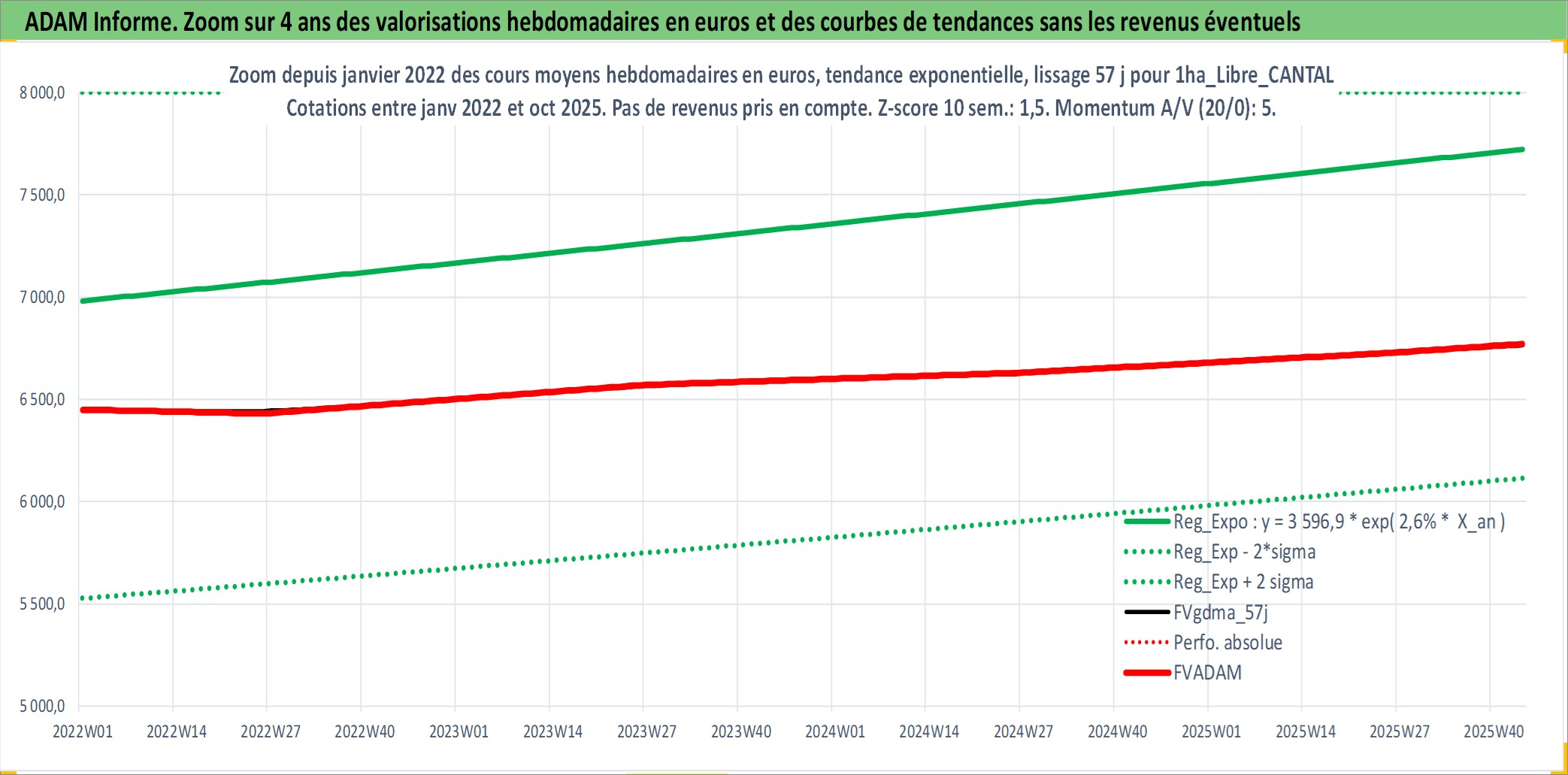 Site dédié aux investisseursPage dédiée sur site financeAnalyse des valorisations hebdomadaires de l'actif 1ha_Libre_CANTAL. Cet actif est cote en EUR. Les valorisations couvrent les semaines 1997W01 a 2025W44. Les fermages de ce bien foncier sont pris egaux a 2,5% annuels de la valeur venale du bien.