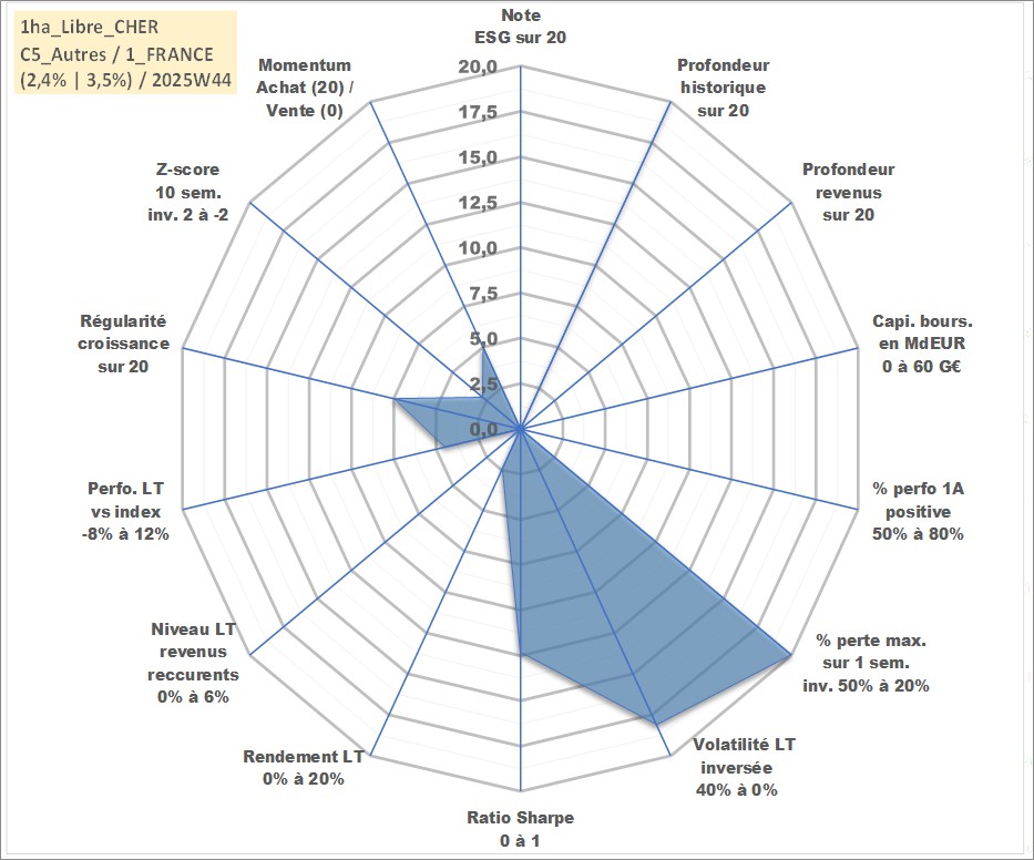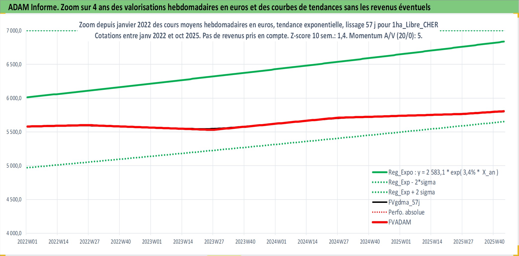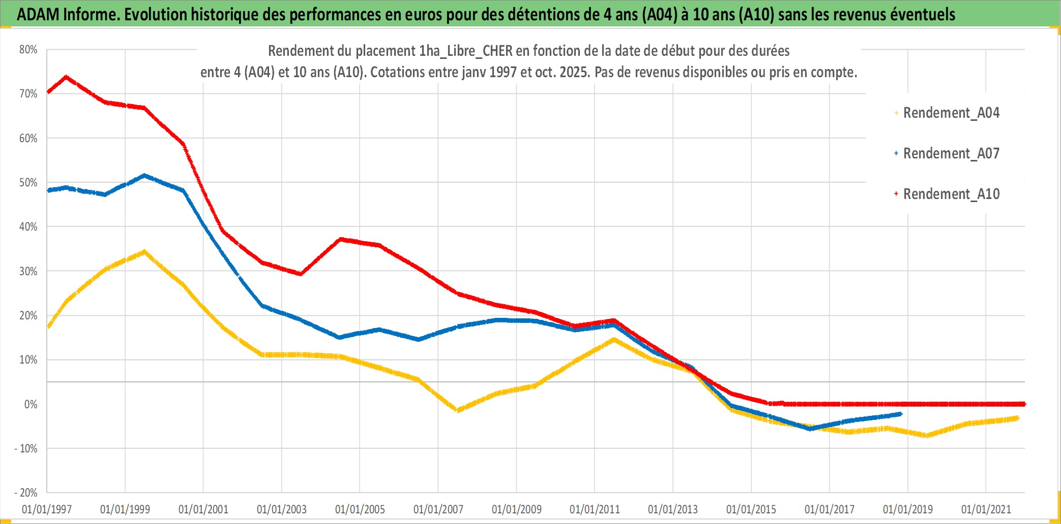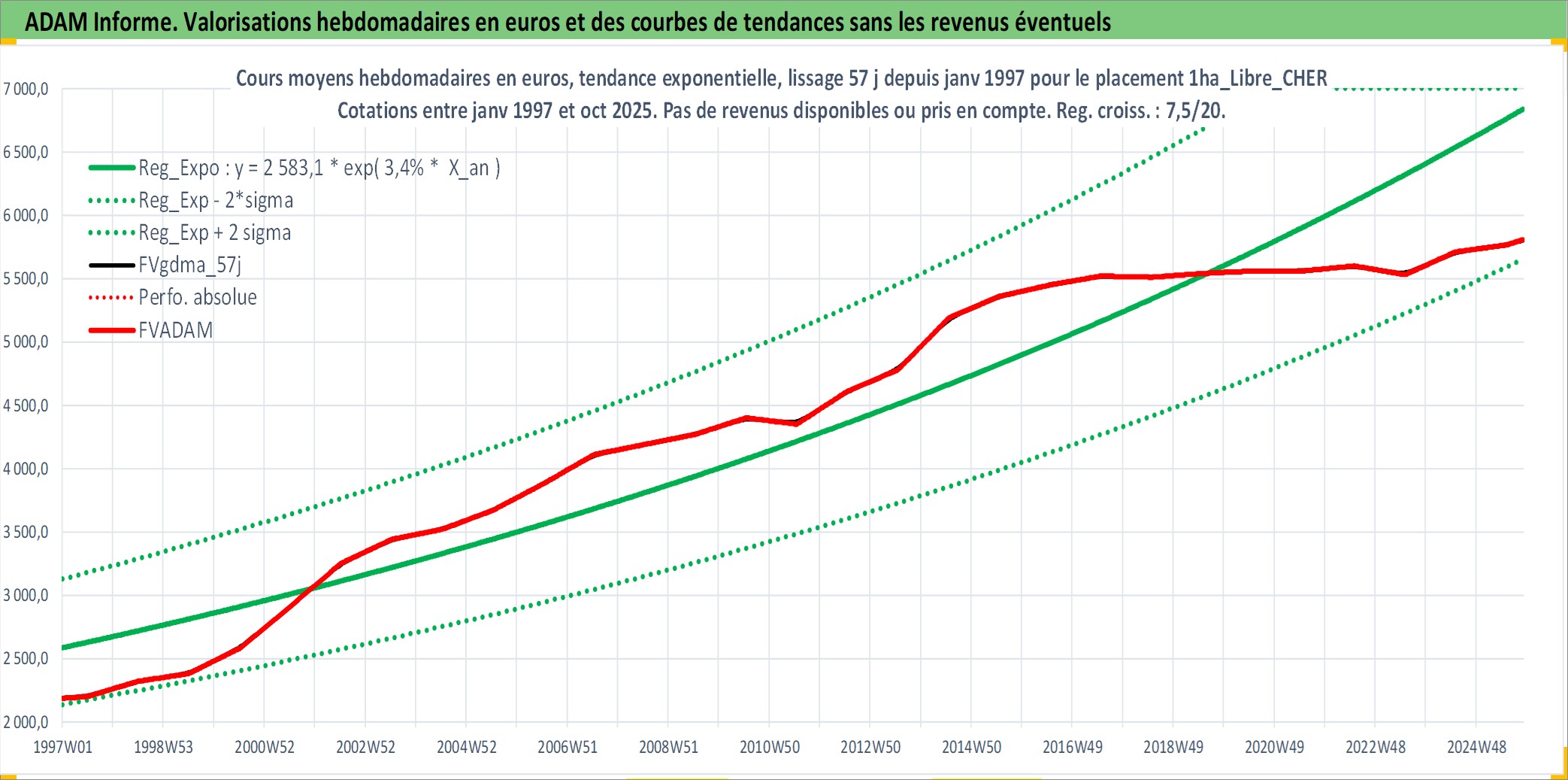 Site dédié aux investisseursPage dédiée sur site financeAnalyse des valorisations hebdomadaires de l'actif 1ha_Libre_CHER. Cet actif est cote en EUR. Les valorisations couvrent les semaines 1997W01 a 2025W44. Les fermages de ce bien foncier sont pris egaux a 2,5% annuels de la valeur venale du bien.
