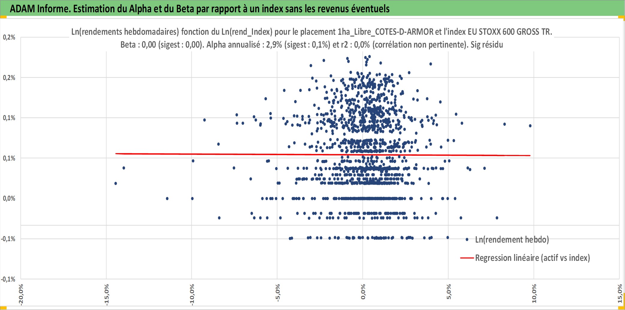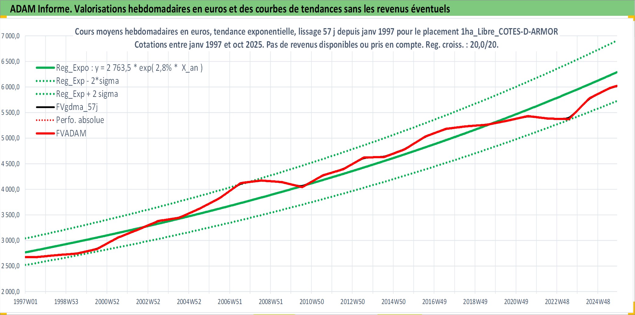 Site dédié aux investisseursPage dédiée sur site financeAnalyse des valorisations hebdomadaires de l'actif 1ha_Libre_COTES-D-ARMOR. Cet actif est cote en EUR. Les valorisations couvrent les semaines 1997W01 a 2025W44. Les fermages de ce bien foncier sont pris egaux a 2,5% annuels de la valeur venale du bien.