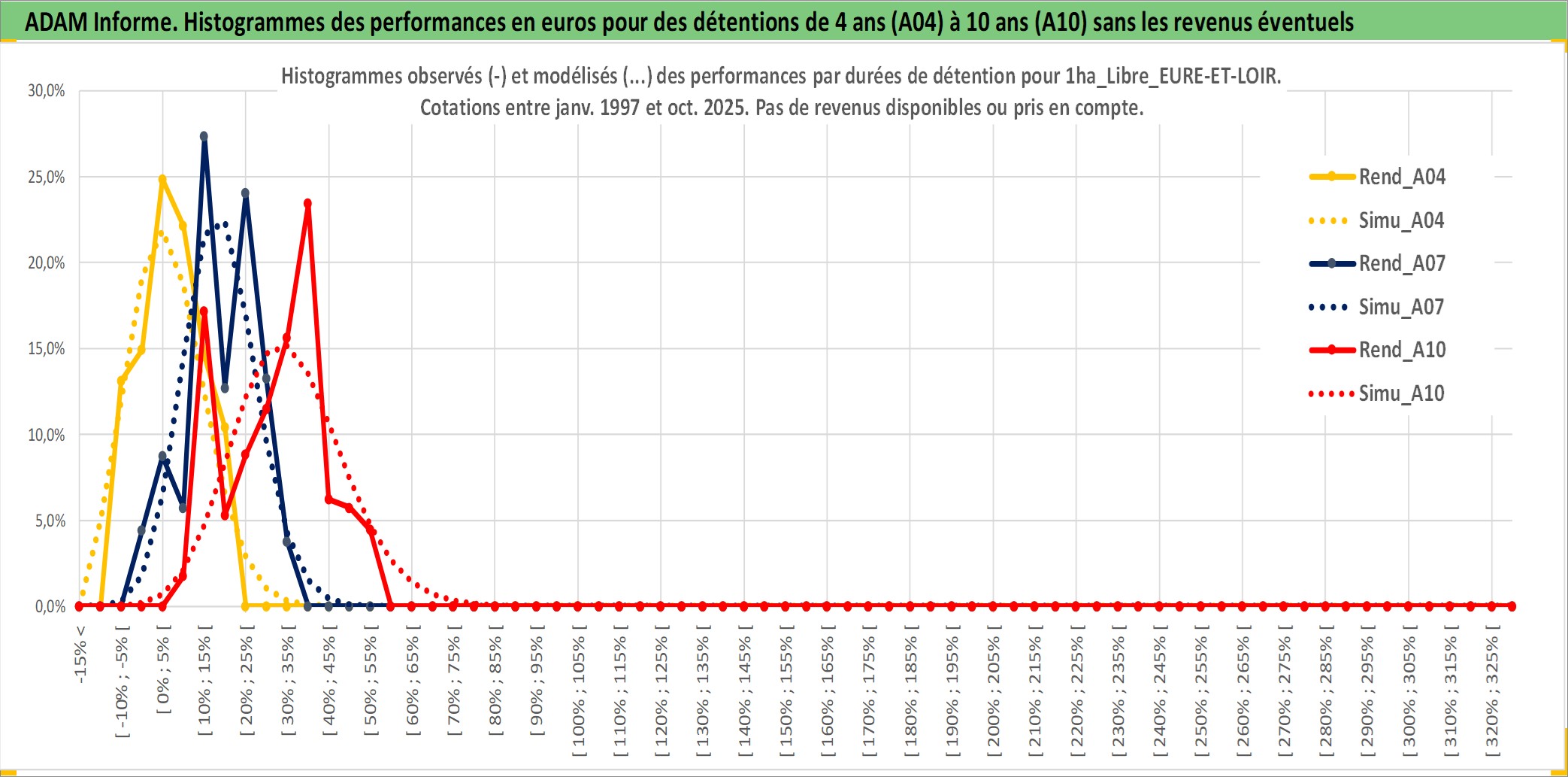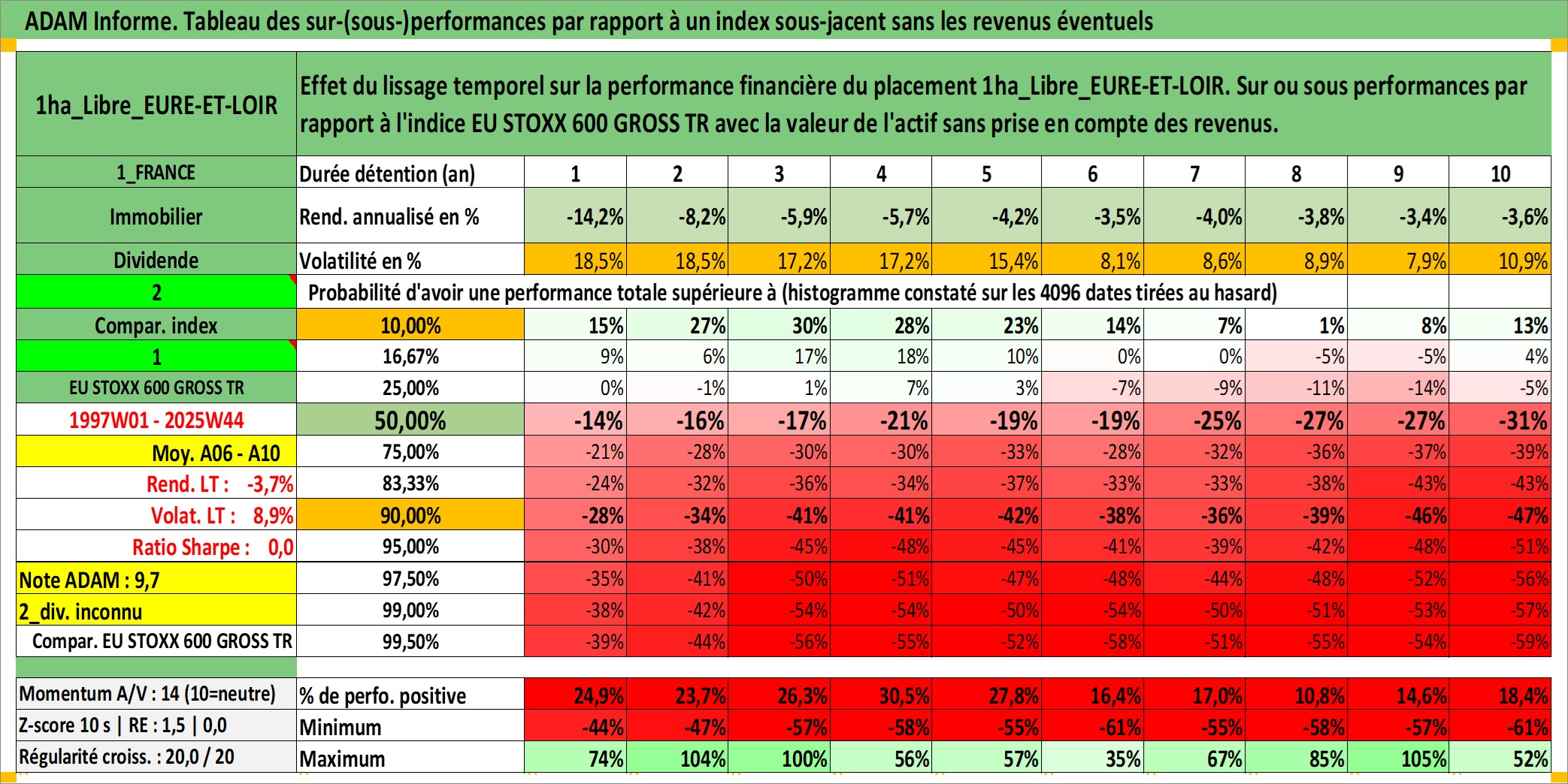 Site dédié aux investisseursPage dédiée sur site financeAnalyse des valorisations hebdomadaires de l'actif 1ha_Libre_EURE-ET-LOIR. Cet actif est cote en EUR. Les valorisations couvrent les semaines 1997W01 a 2025W44. Les fermages de ce bien foncier sont pris egaux a 2,5% annuels de la valeur venale du bien.