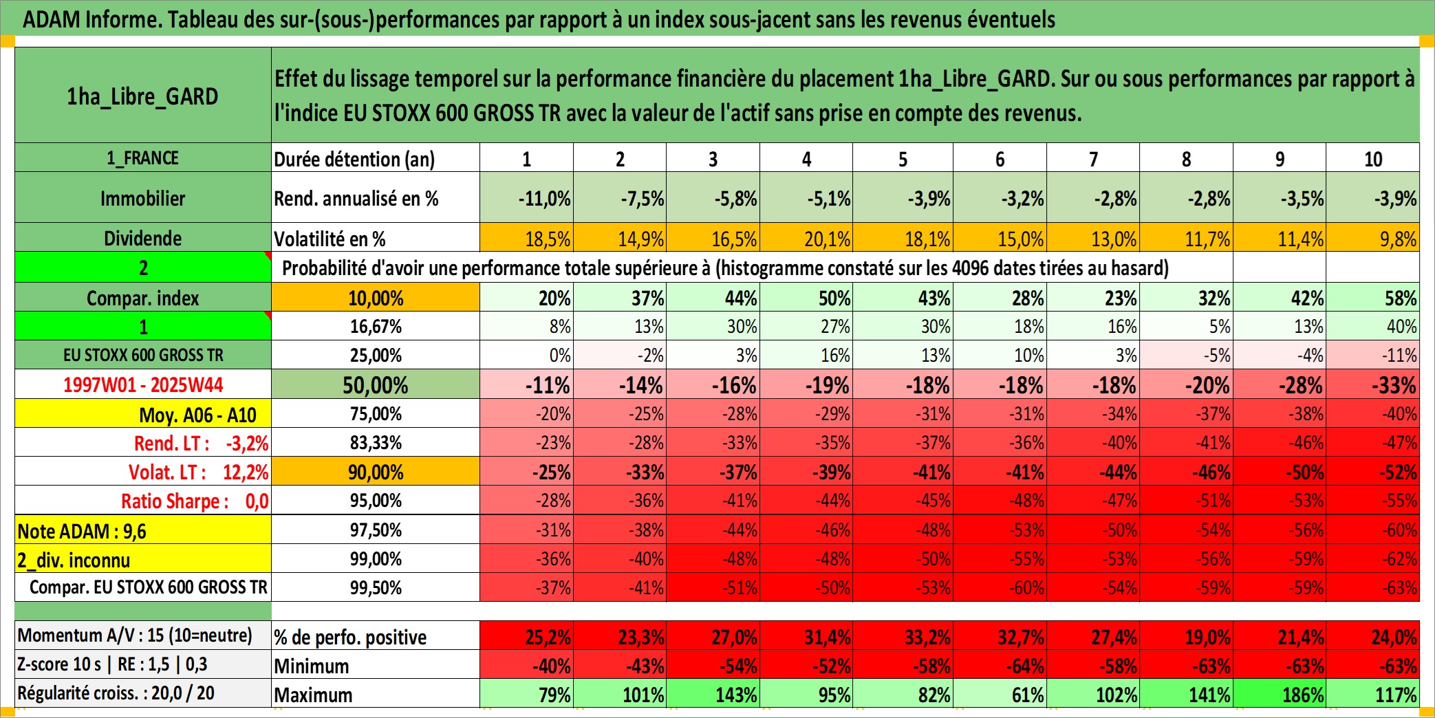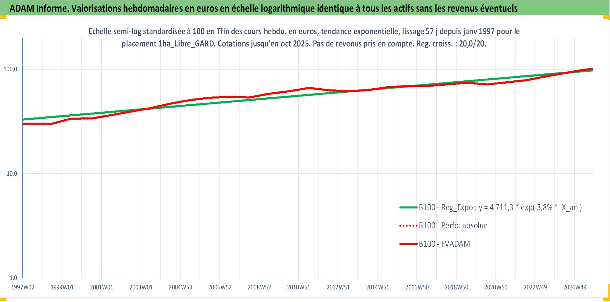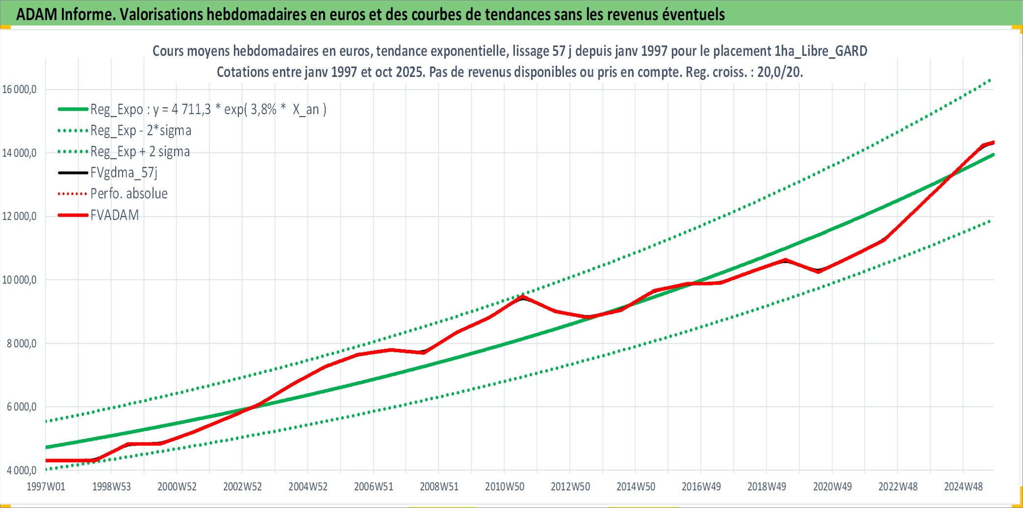 Site dédié aux investisseursPage dédiée sur site financeAnalyse des valorisations hebdomadaires de l'actif 1ha_Libre_GARD. Cet actif est cote en EUR. Les valorisations couvrent les semaines 1997W01 a 2025W44. Les fermages de ce bien foncier sont pris egaux a 2,5% annuels de la valeur venale du bien.
