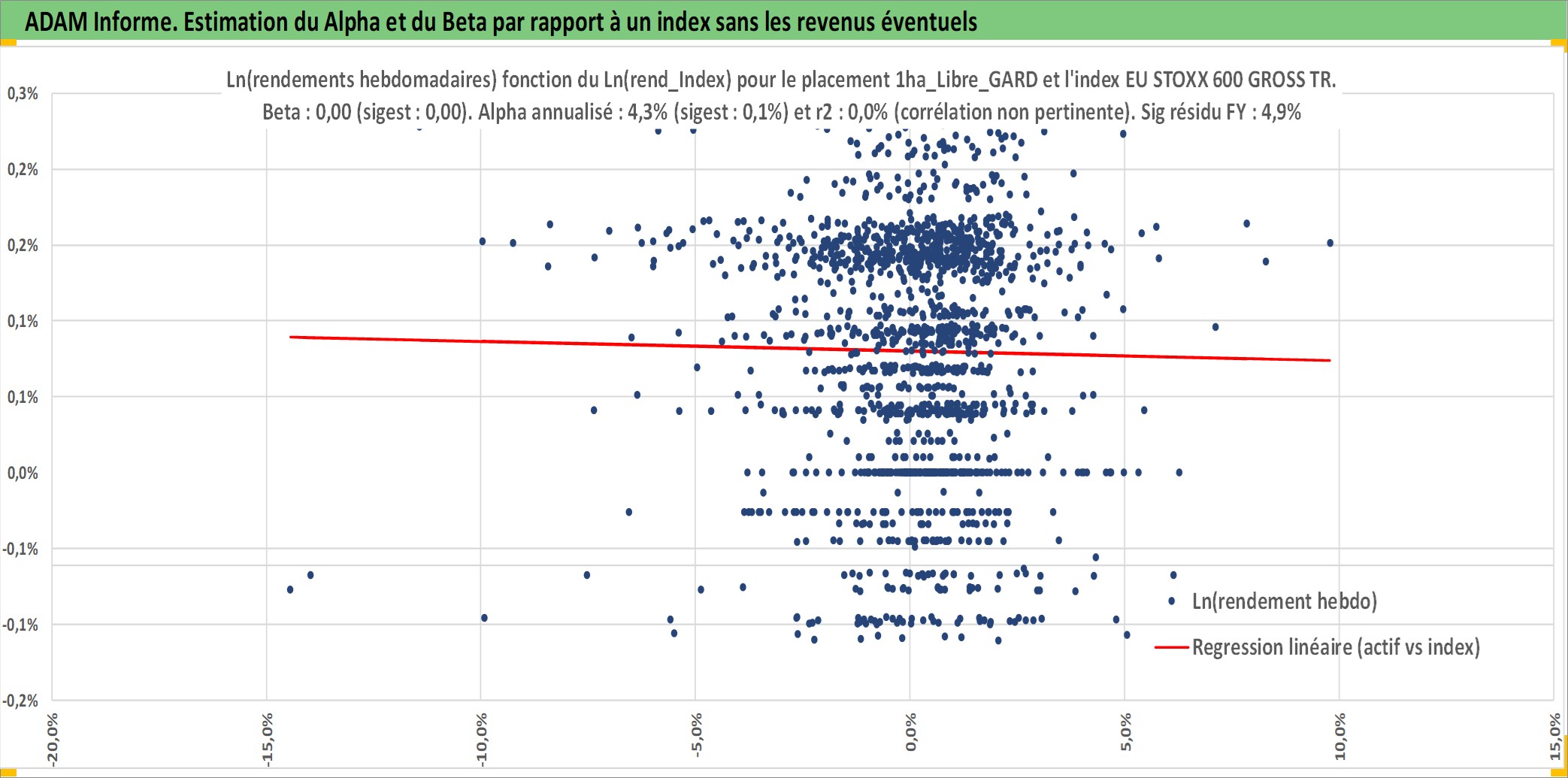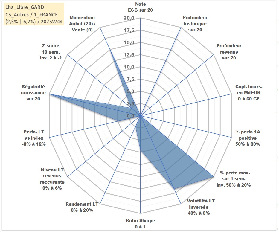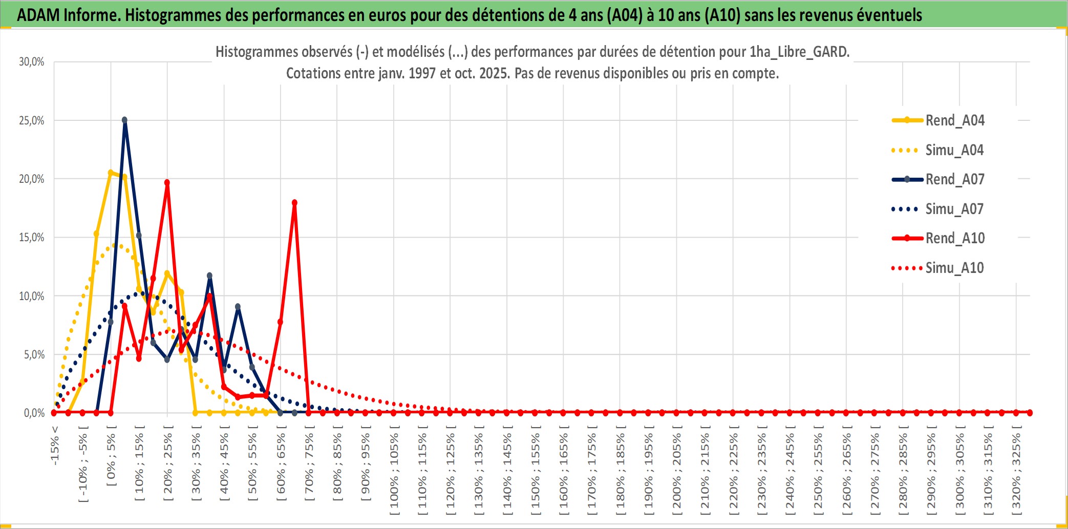 Site dédié aux investisseursPage dédiée sur site financeAnalyse des valorisations hebdomadaires de l'actif 1ha_Libre_GARD. Cet actif est cote en EUR. Les valorisations couvrent les semaines 1997W01 a 2025W44. Les fermages de ce bien foncier sont pris egaux a 2,5% annuels de la valeur venale du bien.