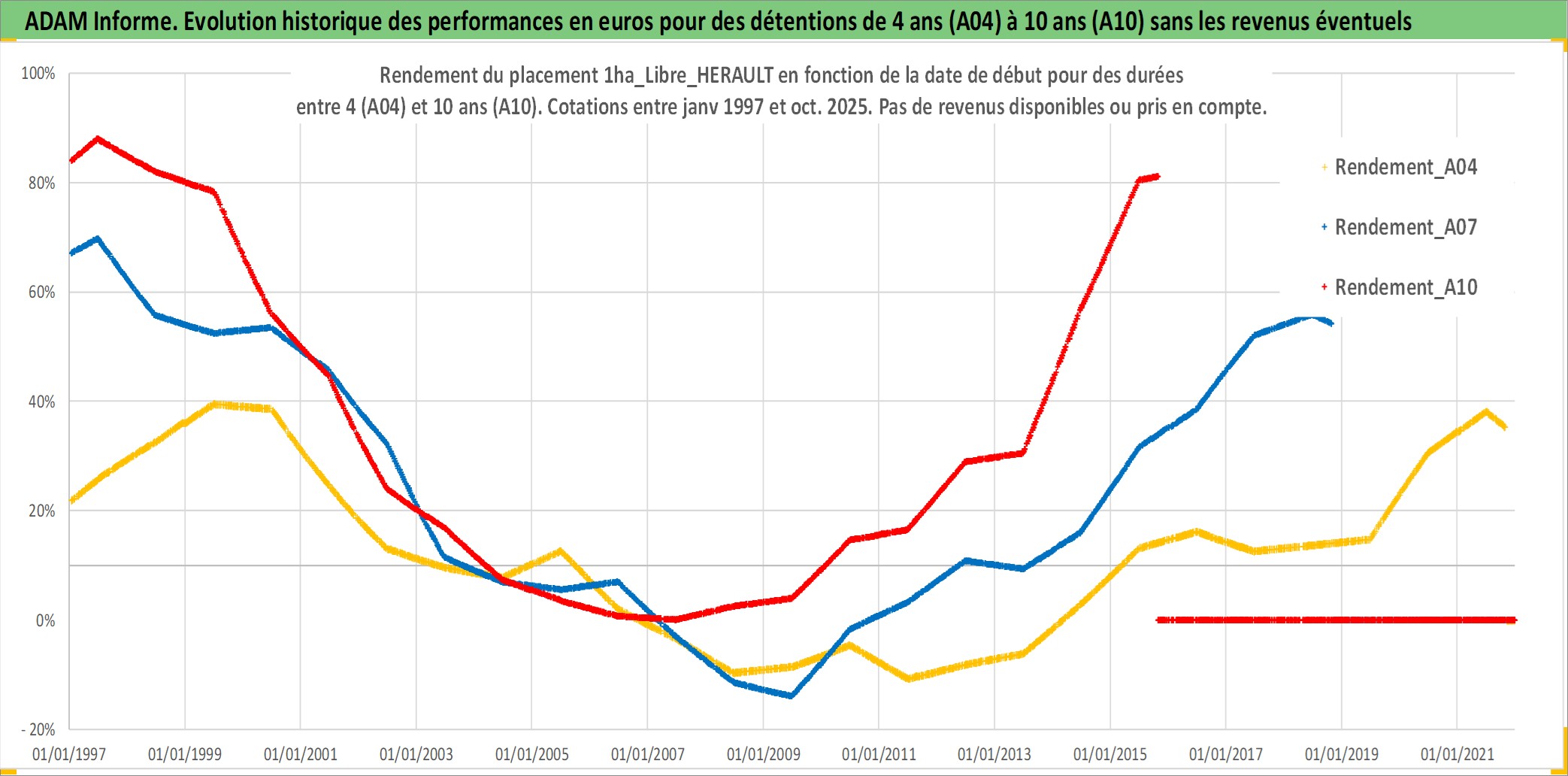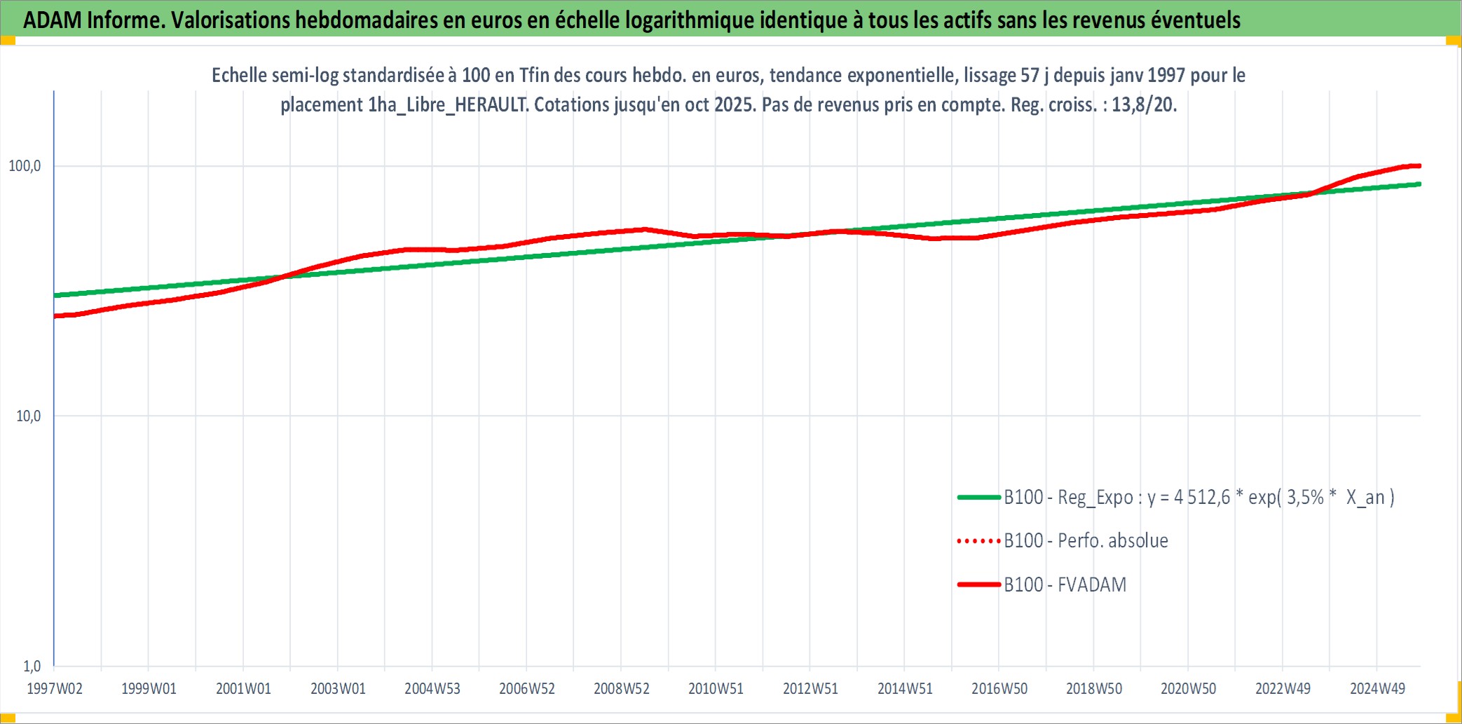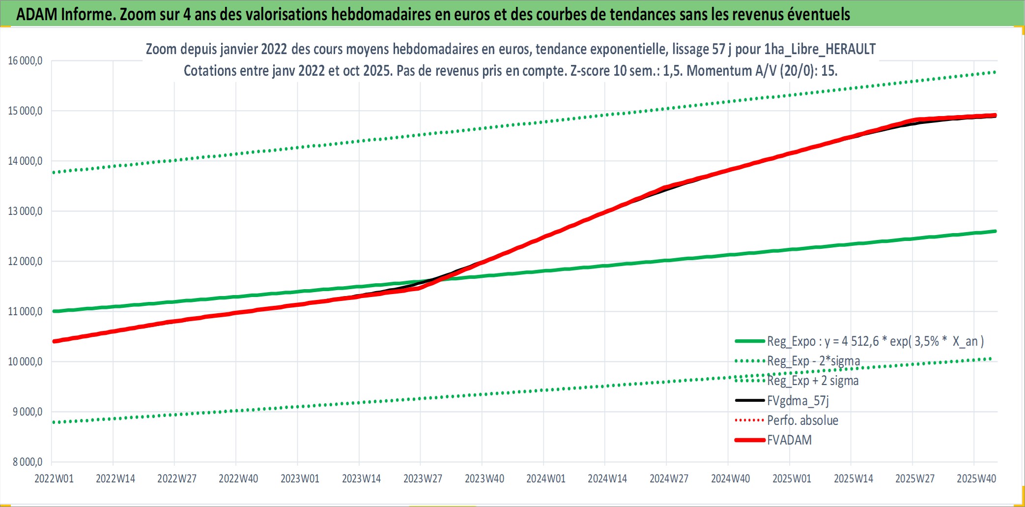 Site dédié aux investisseursPage dédiée sur site financeAnalyse des valorisations hebdomadaires de l'actif 1ha_Libre_HERAULT. Cet actif est cote en EUR. Les valorisations couvrent les semaines 1997W01 a 2025W44. Les fermages de ce bien foncier sont pris egaux a 2,5% annuels de la valeur venale du bien.