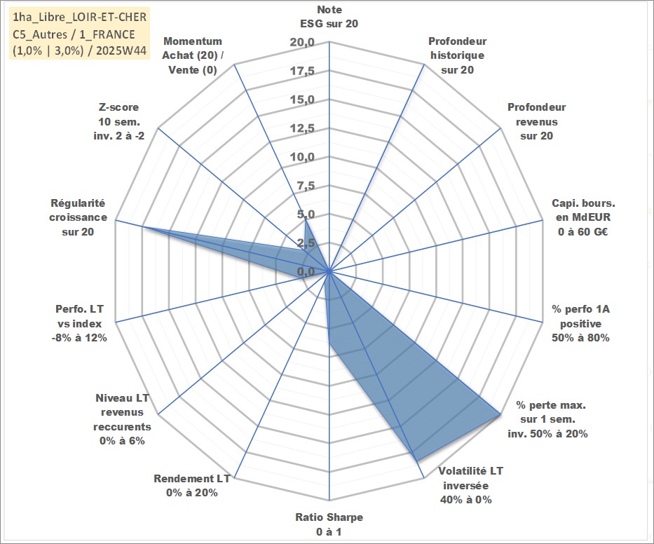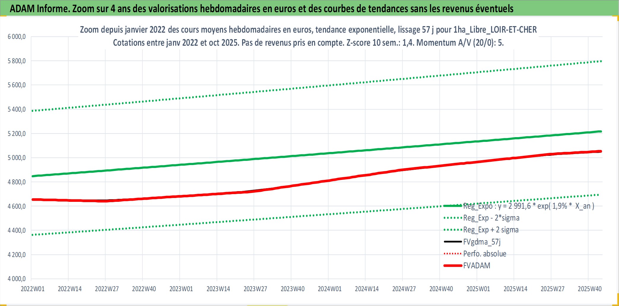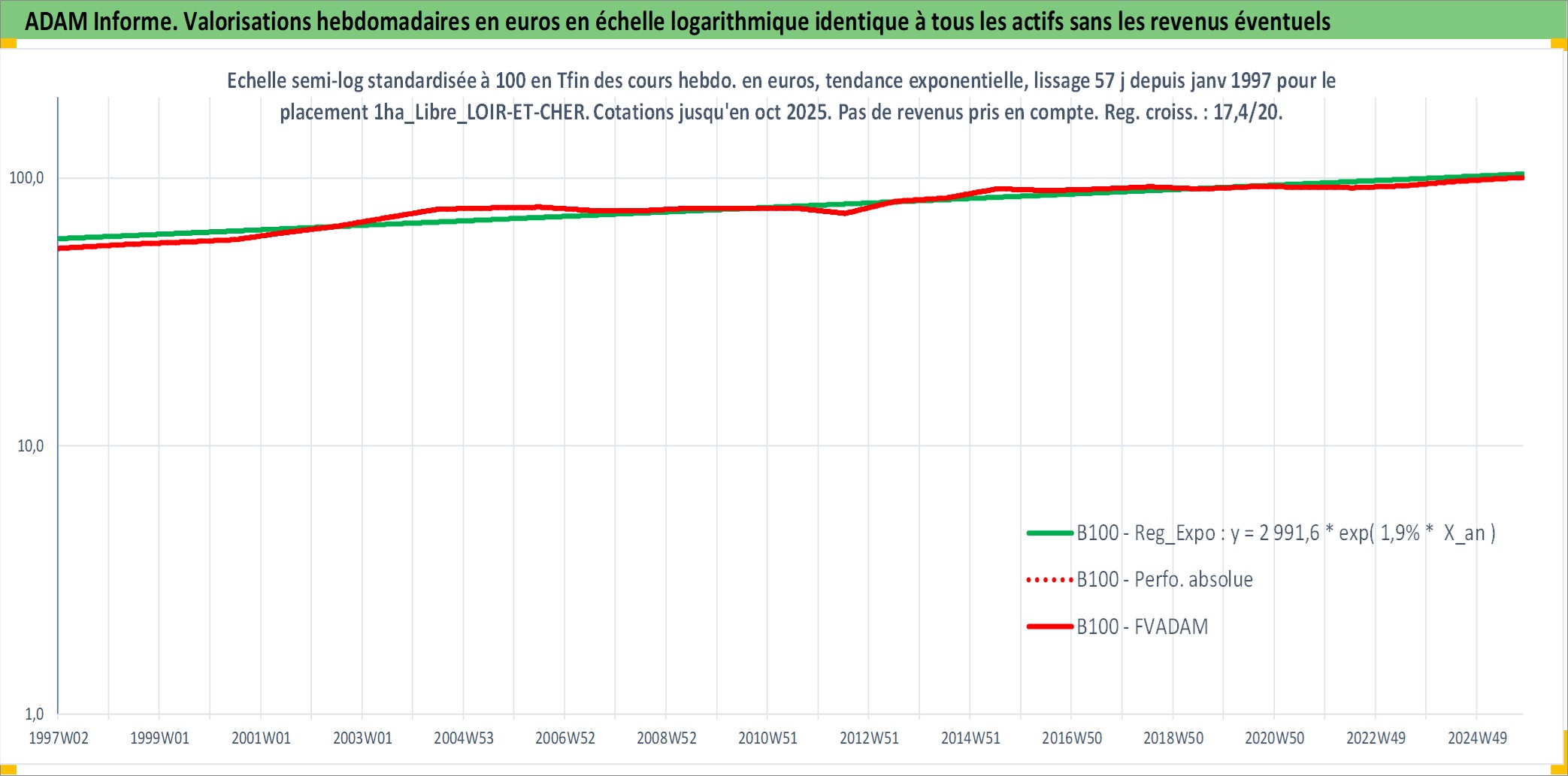 Site dédié aux investisseursPage dédiée sur site financeAnalyse des valorisations hebdomadaires de l'actif 1ha_Libre_LOIR-ET-CHER. Cet actif est cote en EUR. Les valorisations couvrent les semaines 1997W01 a 2025W44. Les fermages de ce bien foncier sont pris egaux a 2,5% annuels de la valeur venale du bien.