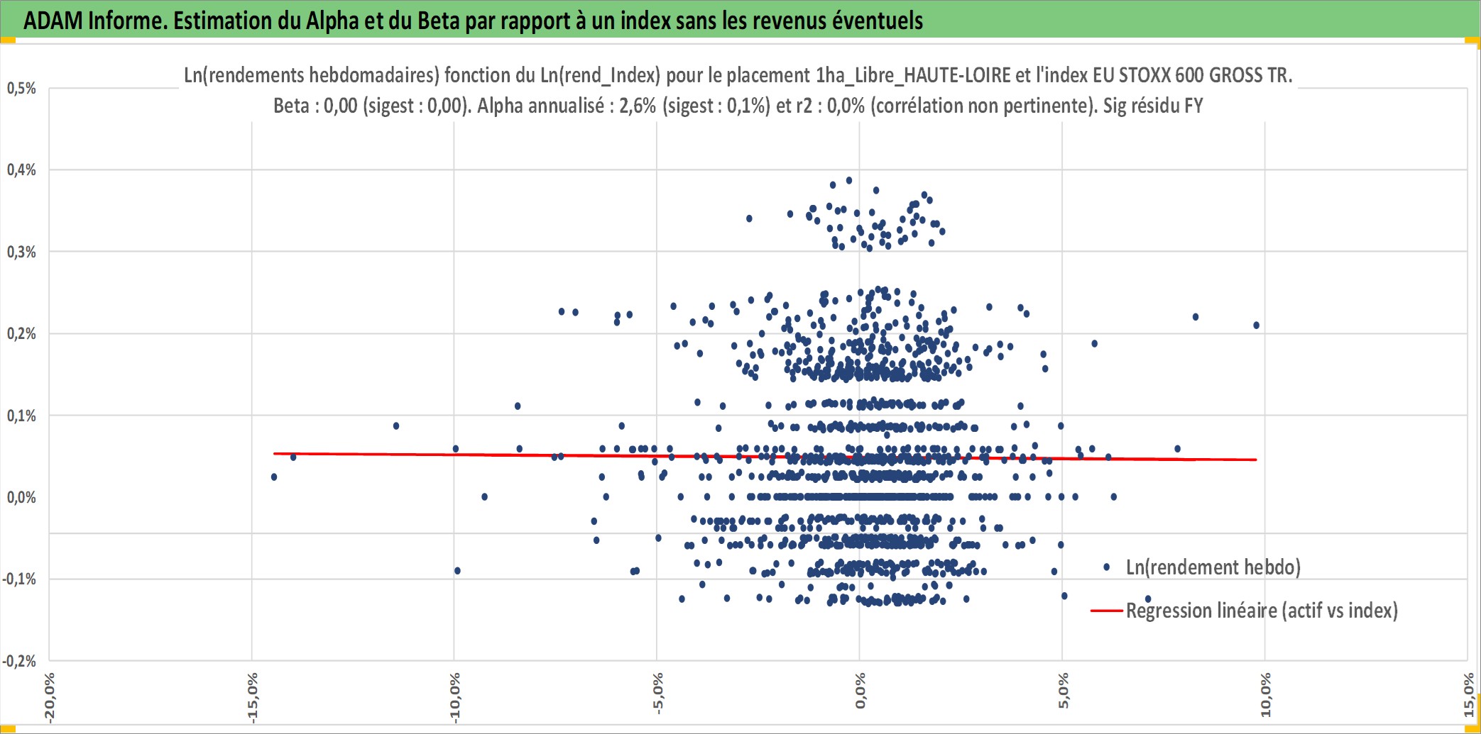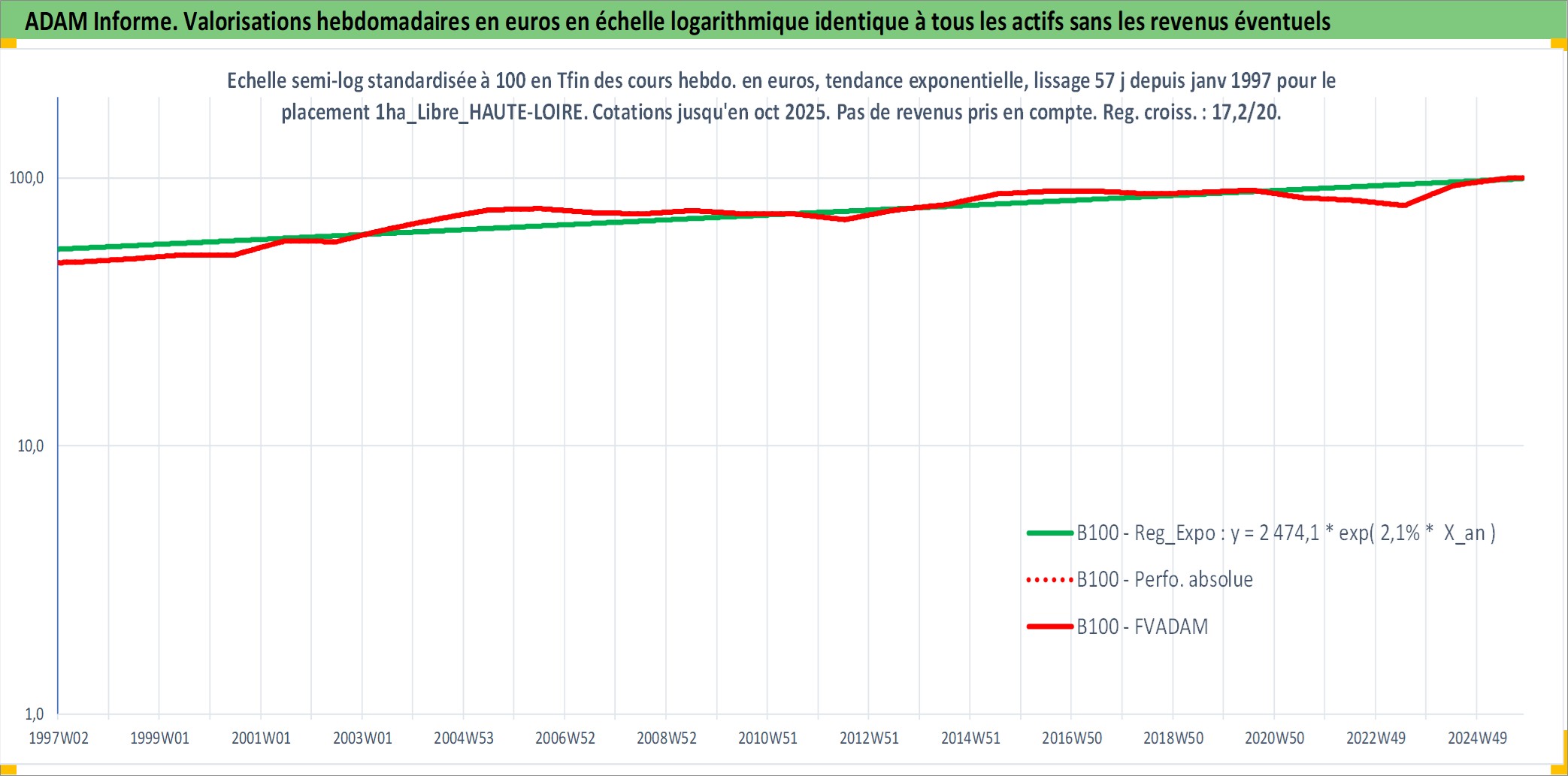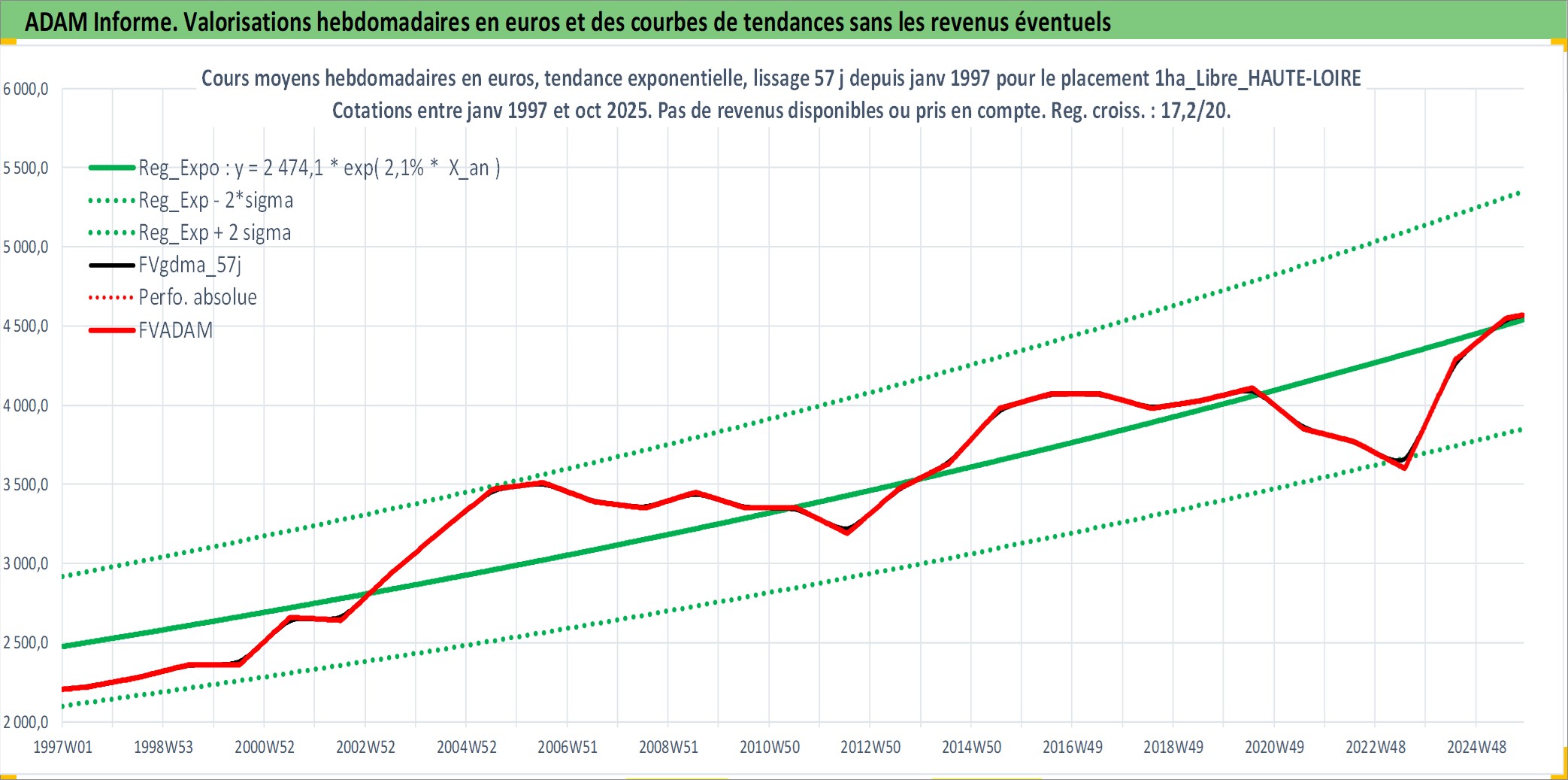 Site dédié aux investisseursPage dédiée sur site financeAnalyse des valorisations hebdomadaires de l'actif 1ha_Libre_HAUTE-LOIRE. Cet actif est cote en EUR. Les valorisations couvrent les semaines 1997W01 a 2025W44. Les fermages de ce bien foncier sont pris egaux a 2,5% annuels de la valeur venale du bien.
