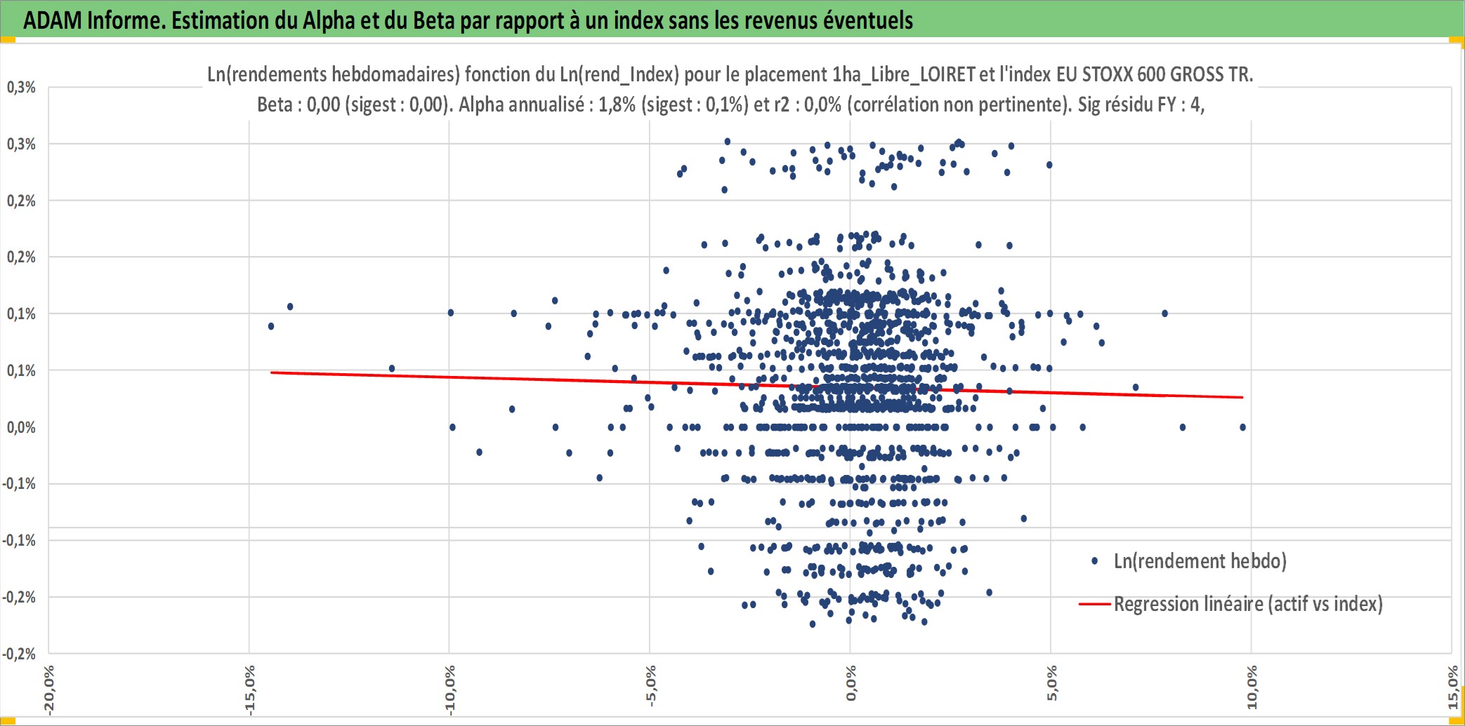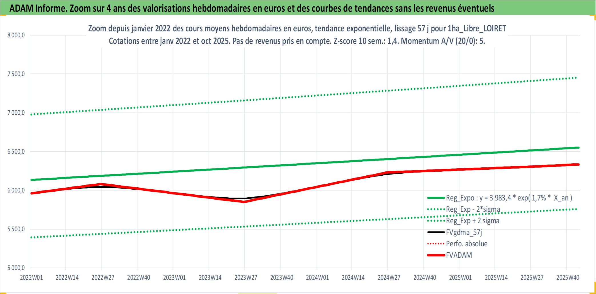 Site dédié aux investisseursPage dédiée sur site financeAnalyse des valorisations hebdomadaires de l'actif 1ha_Libre_LOIRET. Cet actif est cote en EUR. Les valorisations couvrent les semaines 1997W01 a 2025W44. Les fermages de ce bien foncier sont pris egaux a 2,5% annuels de la valeur venale du bien.
