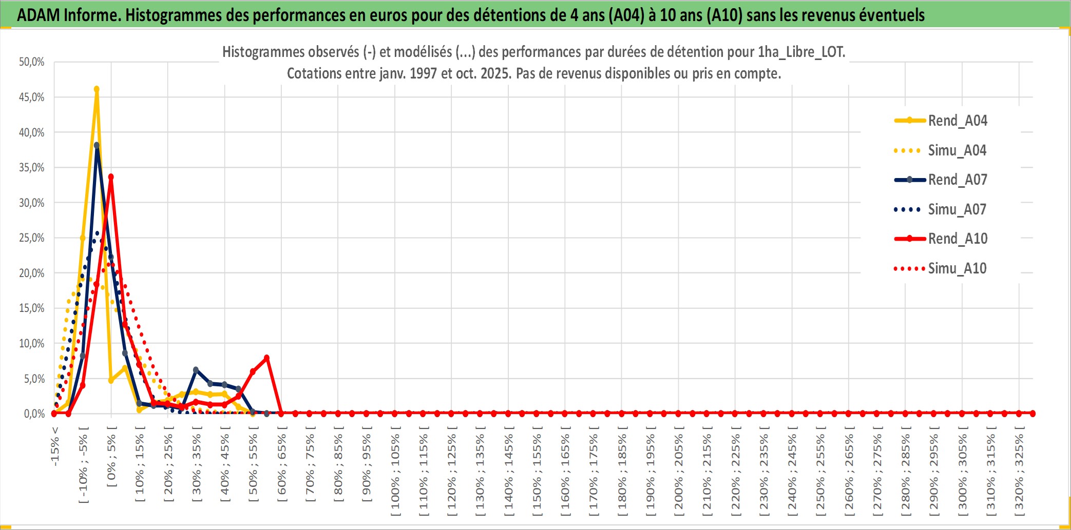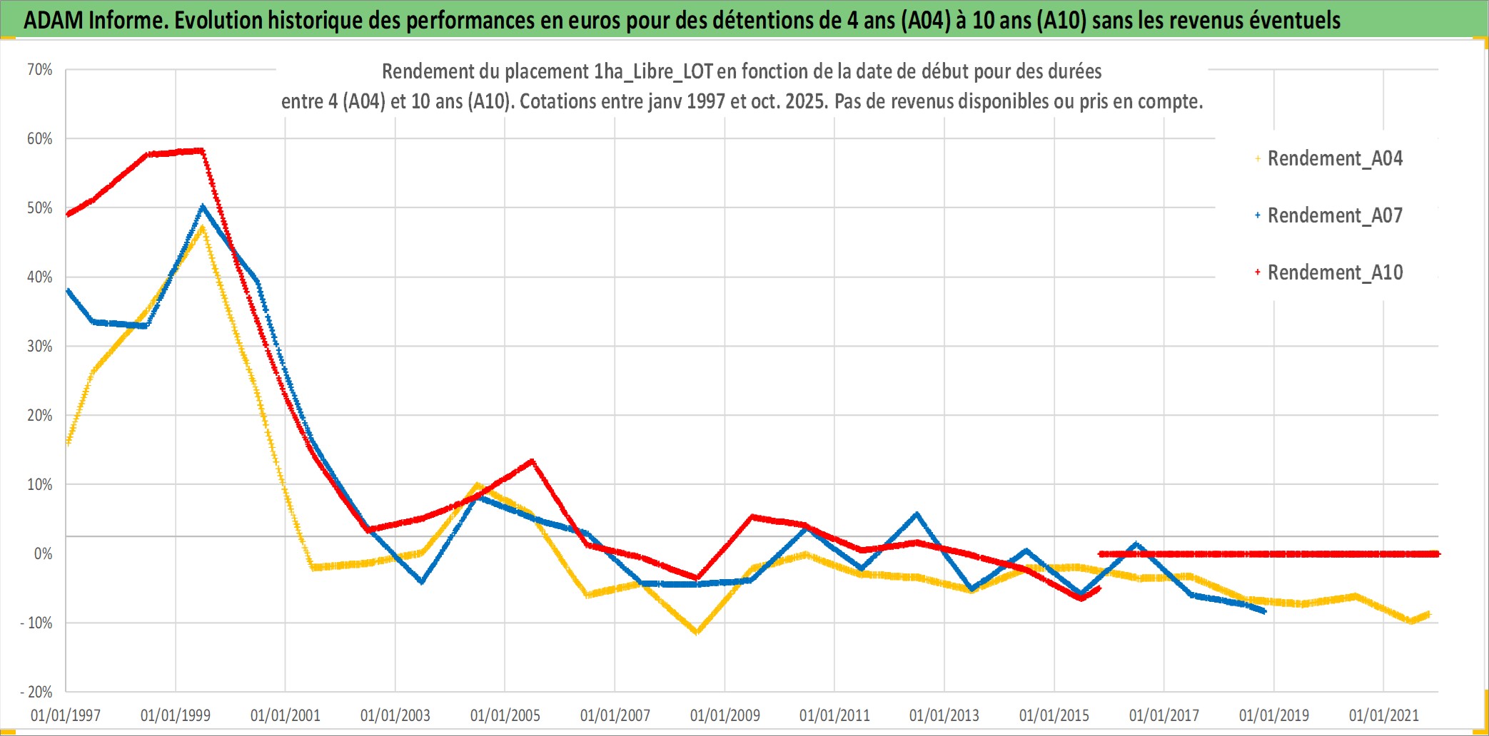 Site dédié aux investisseursPage dédiée sur site financeAnalyse des valorisations hebdomadaires de l'actif 1ha_Libre_LOT. Cet actif est cote en EUR. Les valorisations couvrent les semaines 1997W01 a 2025W44. Les fermages de ce bien foncier sont pris egaux a 2,5% annuels de la valeur venale du bien.