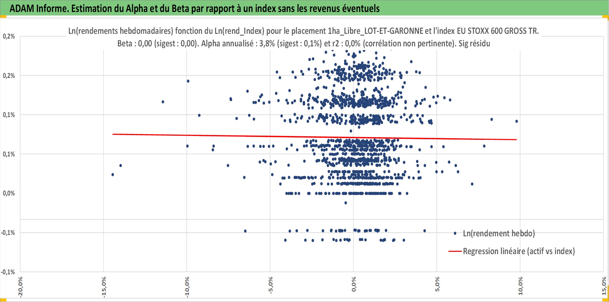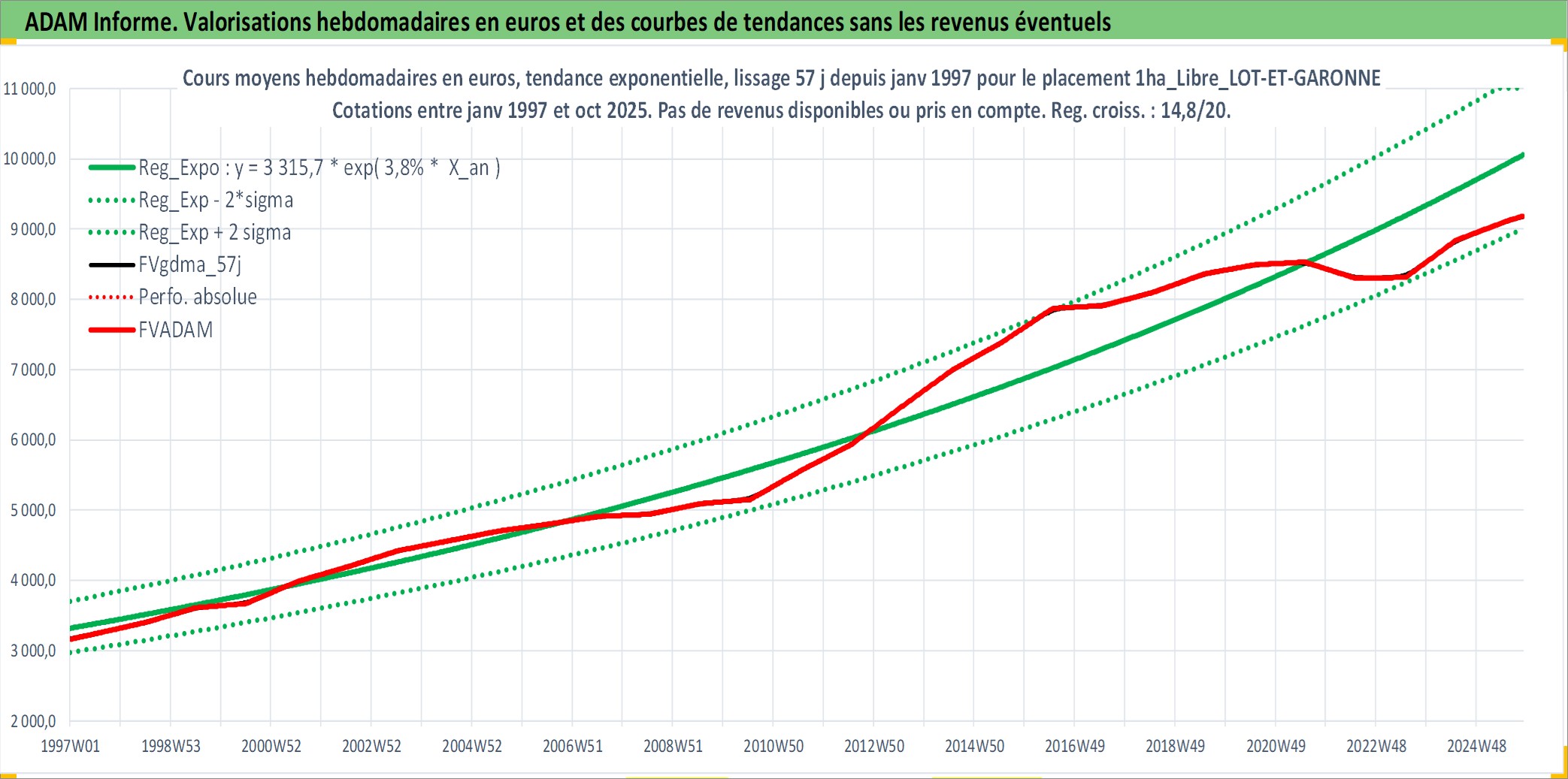 Site dédié aux investisseursPage dédiée sur site financeAnalyse des valorisations hebdomadaires de l'actif 1ha_Libre_LOT-ET-GARONNE. Cet actif est cote en EUR. Les valorisations couvrent les semaines 1997W01 a 2025W44. Les fermages de ce bien foncier sont pris egaux a 2,5% annuels de la valeur venale du bien.