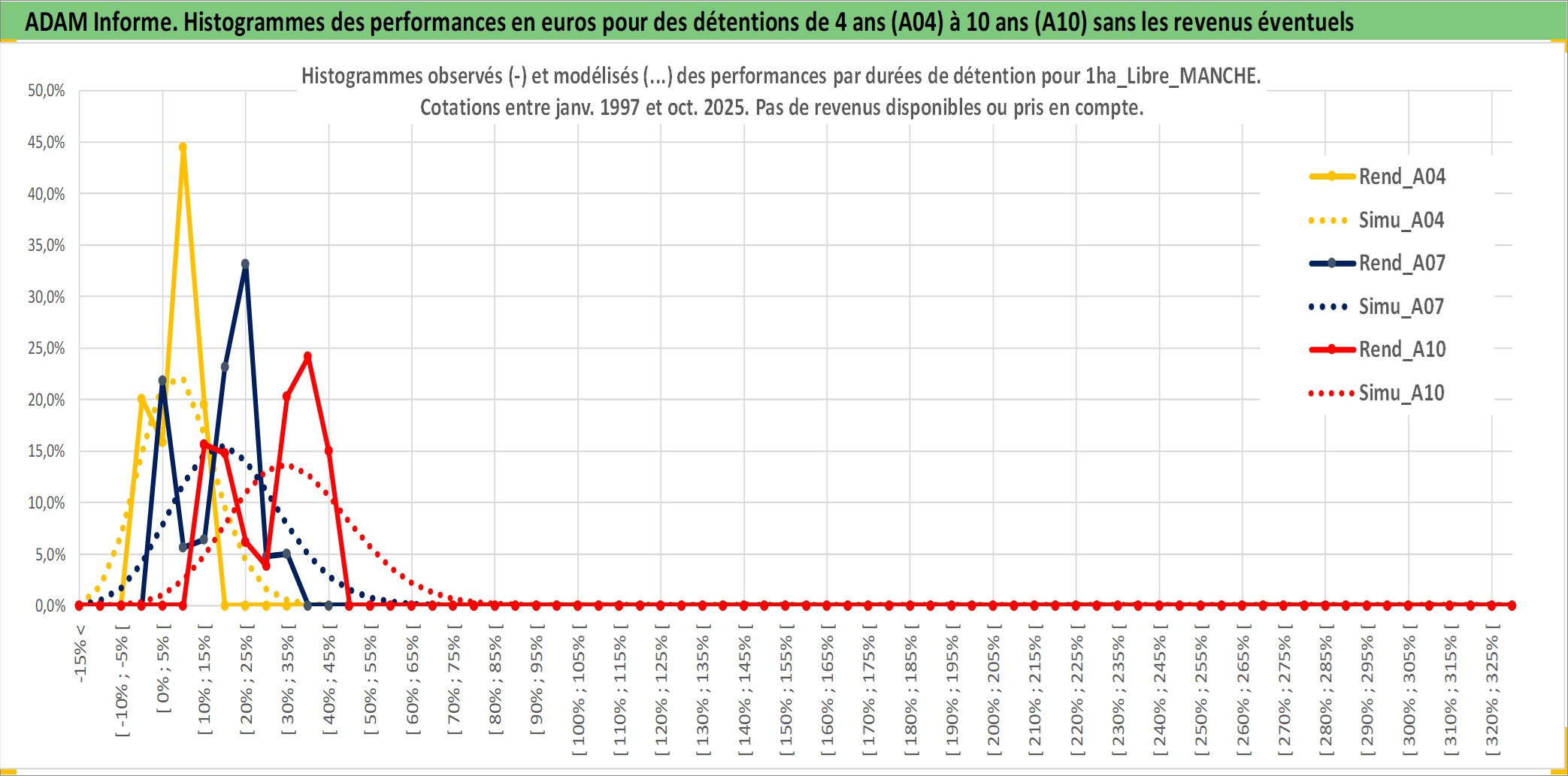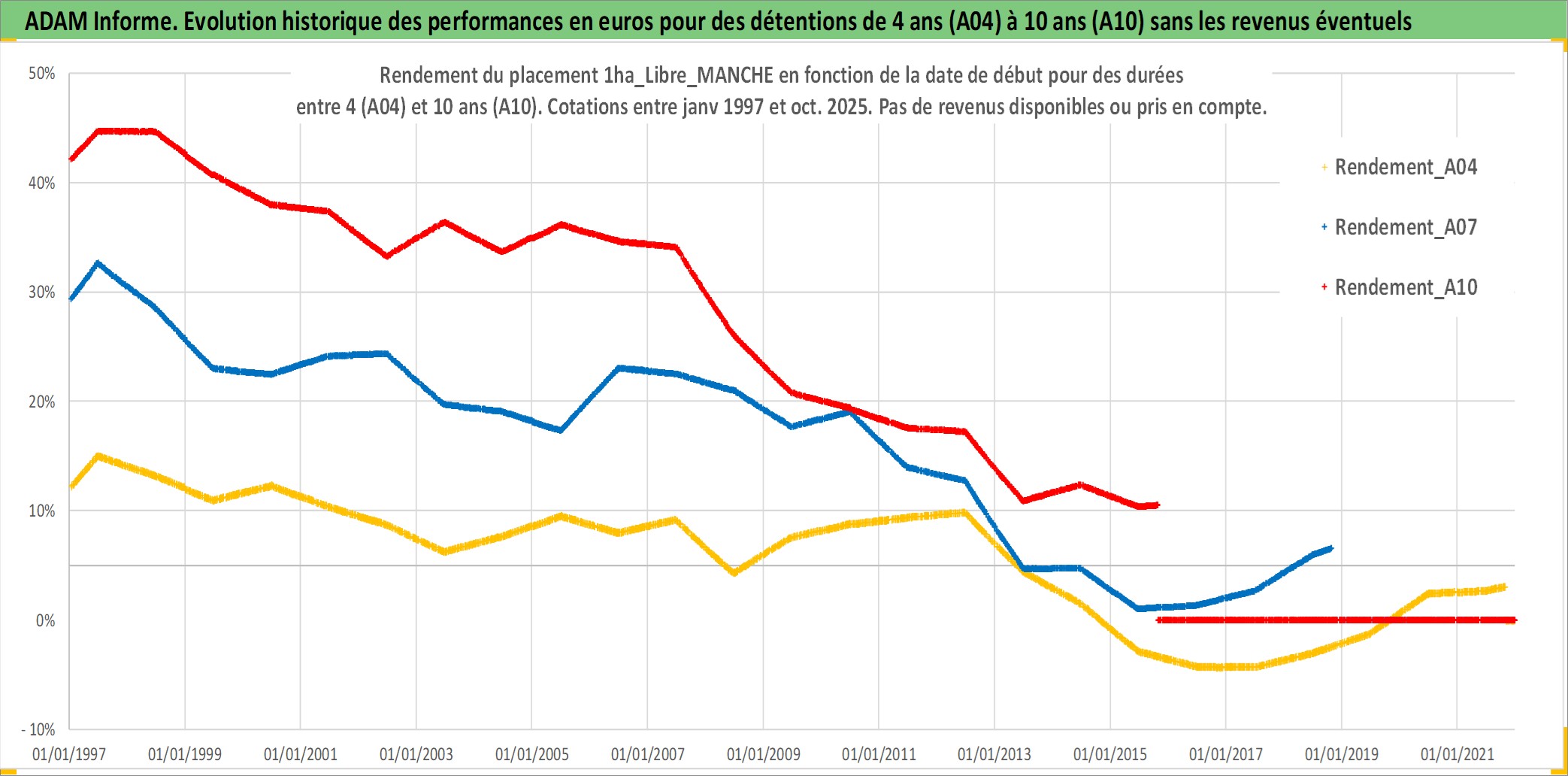 Site dédié aux investisseursPage dédiée sur site financeAnalyse des valorisations hebdomadaires de l'actif 1ha_Libre_MANCHE. Cet actif est cote en EUR. Les valorisations couvrent les semaines 1997W01 a 2025W44. Les fermages de ce bien foncier sont pris egaux a 2,5% annuels de la valeur venale du bien.