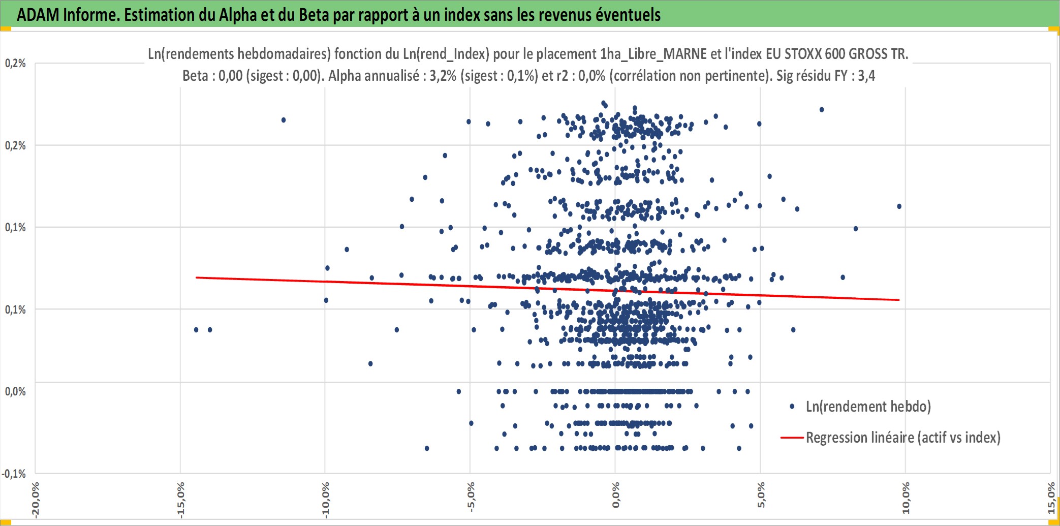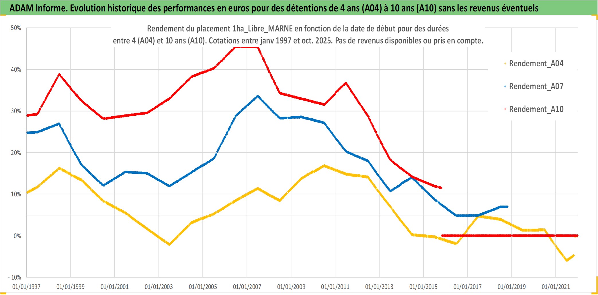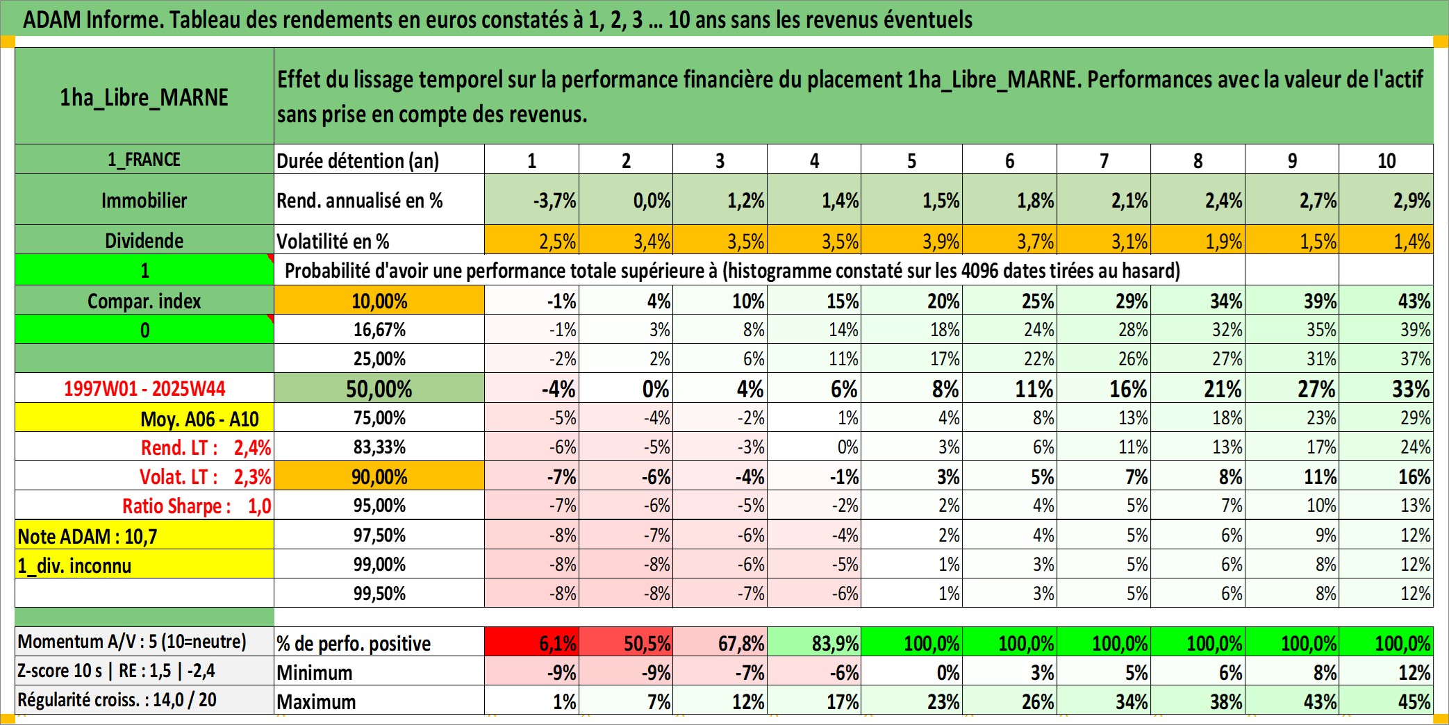Site dédié aux investisseursPage dédiée sur site financeAnalyse des valorisations hebdomadaires de l'actif 1ha_Libre_MARNE. Cet actif est cote en EUR. Les valorisations couvrent les semaines 1997W01 a 2025W44. Les fermages de ce bien foncier sont pris egaux a 2,5% annuels de la valeur venale du bien.