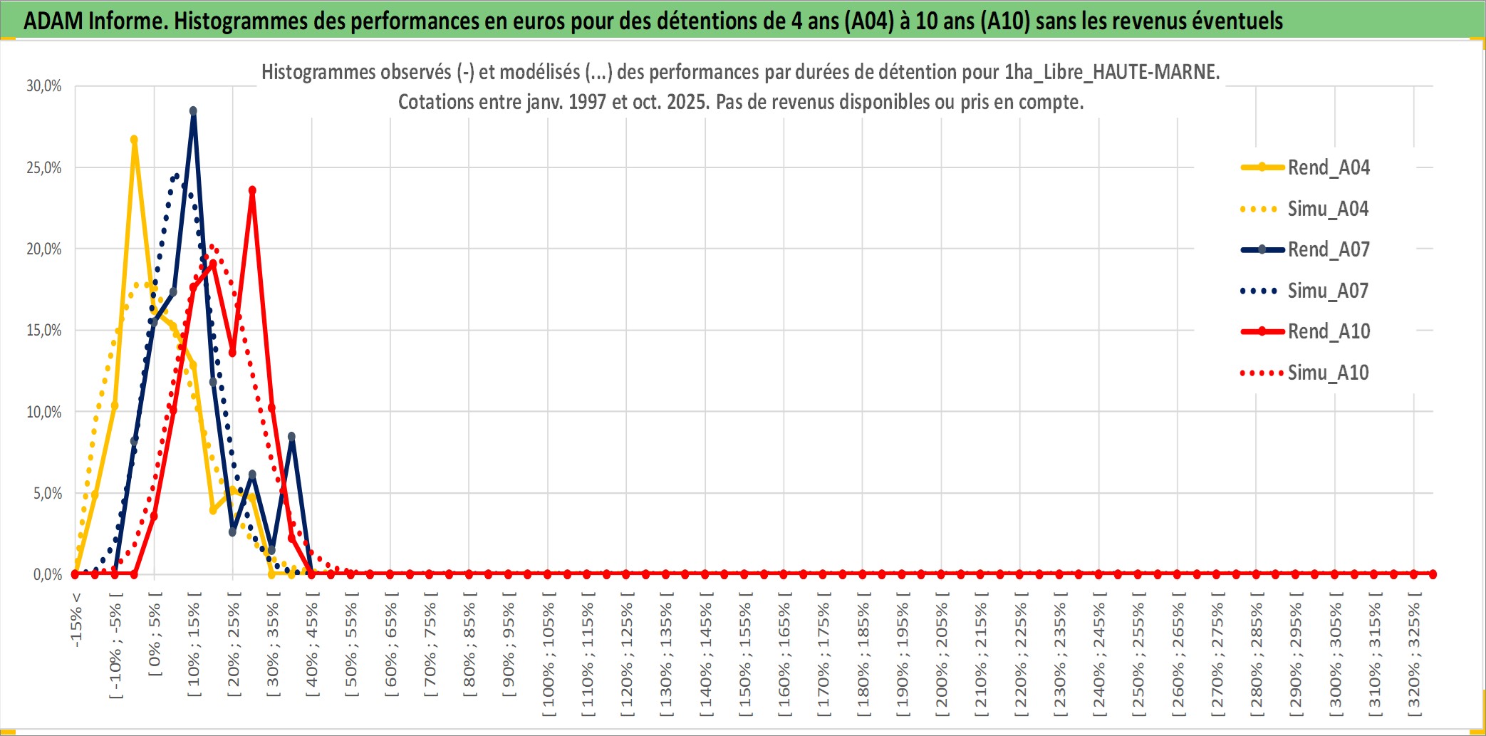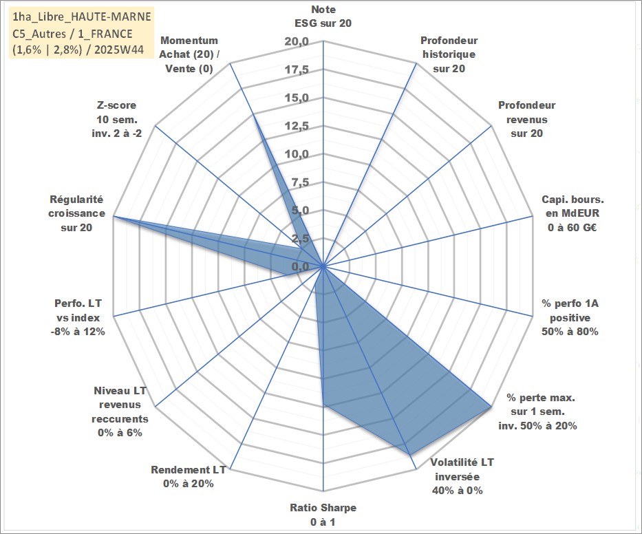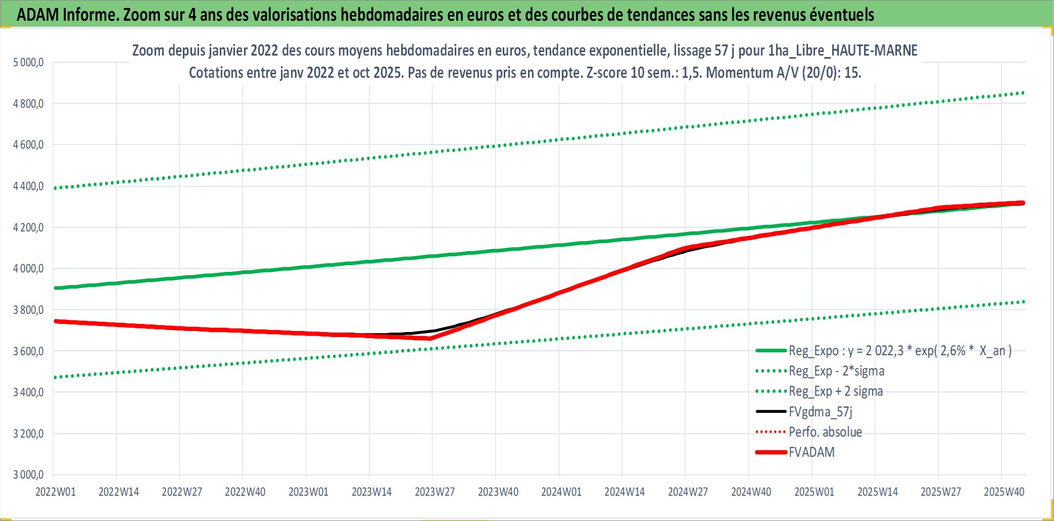 Site dédié aux investisseursPage dédiée sur site financeAnalyse des valorisations hebdomadaires de l'actif 1ha_Libre_HAUTE-MARNE. Cet actif est cote en EUR. Les valorisations couvrent les semaines 1997W01 a 2025W44. Les fermages de ce bien foncier sont pris egaux a 2,5% annuels de la valeur venale du bien.